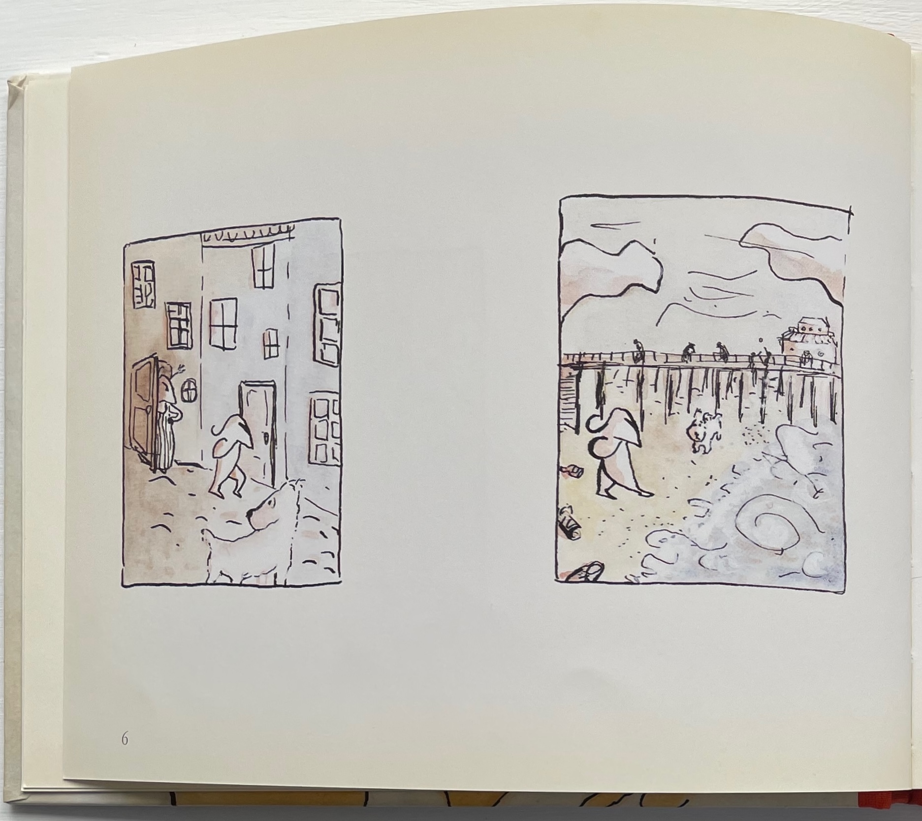 Books like Perry Nodelman’s Words about Pictures: The Narrative Art of Children’s Picture Books (1988) or Sandra Beckett’s Crossover Picturebooks: A Genre for All Ages (2013) offer useful ways of seeing how some artists’ books work. Many of the approaches to depicting action that Nodelman explores can be found in Va faire un tour: pictures imply motion by manipulating context, by “linear continuance” (parallel action lines), by difference in shading and coloring, by bodily distortion, by following and by playing against our left-to-right reading convention (Western), by figurative continuance (differing instances of the same figure), by combining effects that stop motion with effects that imply motion, by suggesting cause and effect, by relying on our narrative assumptions, by having a subsequent image change the meaning of a preceding image, by visual rhythms created by sequential images of similar shapes (repetitive form cuts and addition to or subtraction from them), by dynamic framing (changing the size, shape, angle and distance of images), or by varying the number of sequences or number of images on the spread, (pp. 158-92).