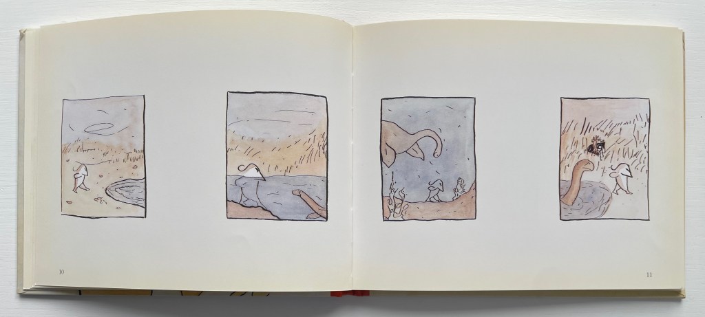From the first wordless illustration onwards in Kitty Crowther’s Va faire un tour, you don’t have to know French to know that the book’s title means imperatively “take a walk” — or maybe even “take a hike” — in English. There is no mistaking the tone of Maman’s character nor the reaction of her little one stomping along, circling the globe, even under bodies of water, oblivious to characteristic scenery and inhabitants.