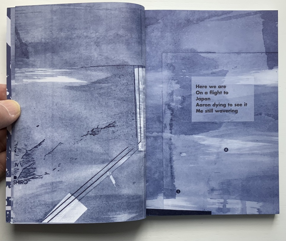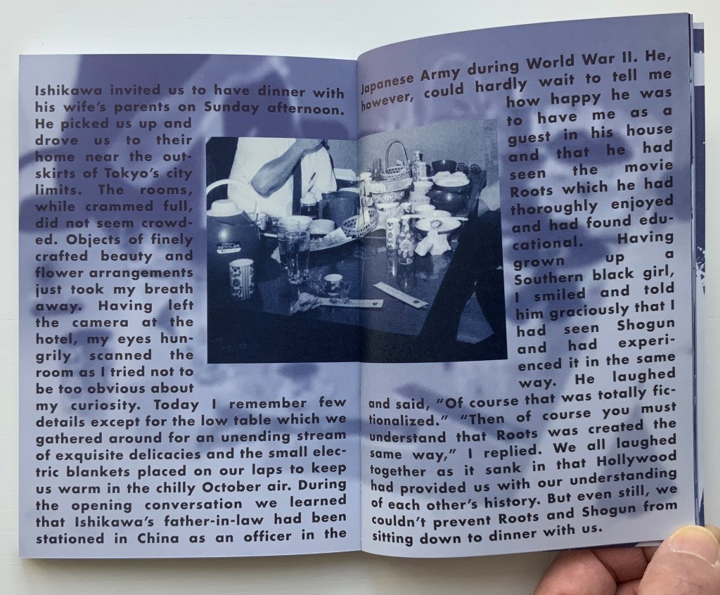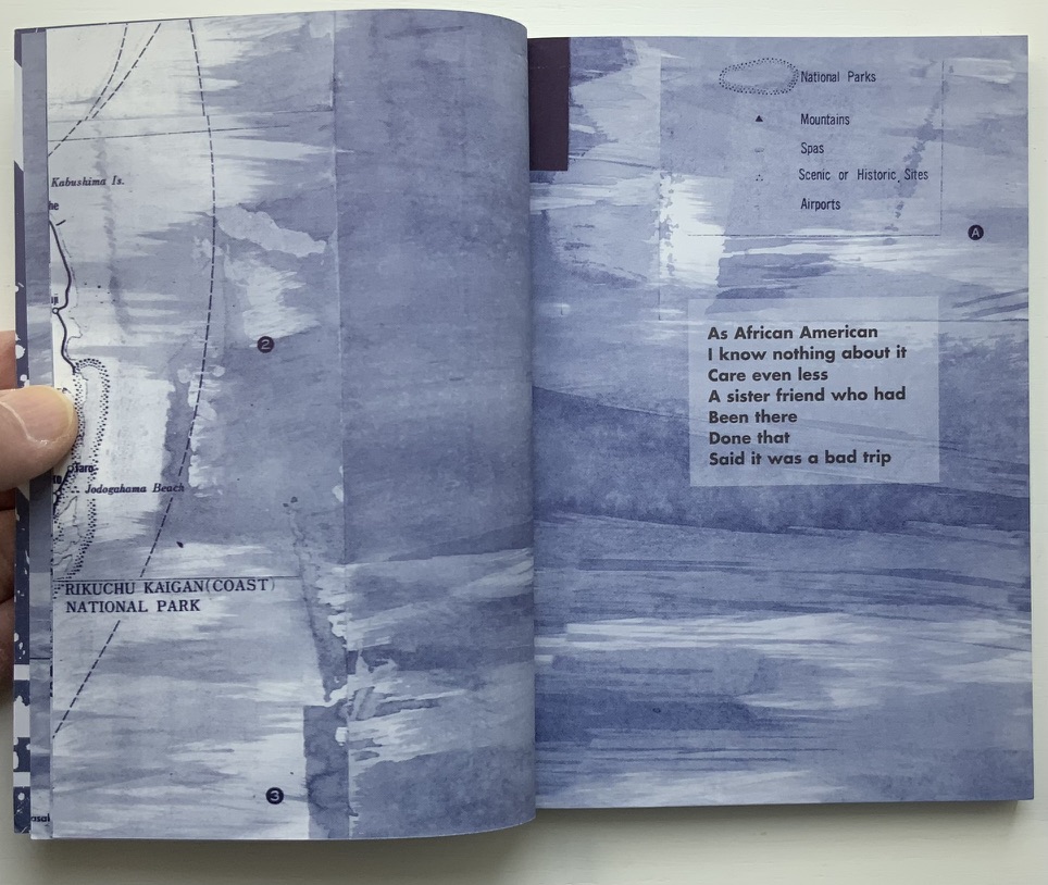 Artist’s description: “In this diary-like artist’s book, Sligh recounts a trip to Japan through a thoughtfully constructed montage of photography, texts, and abstract gestural paintings. In personal and poetic musings, the author ponders her relationship to Japanese culture, both as a first time visitor and as an African American woman. Beautifully printed in blue and black duotones, the book comes in a cloth bag.”