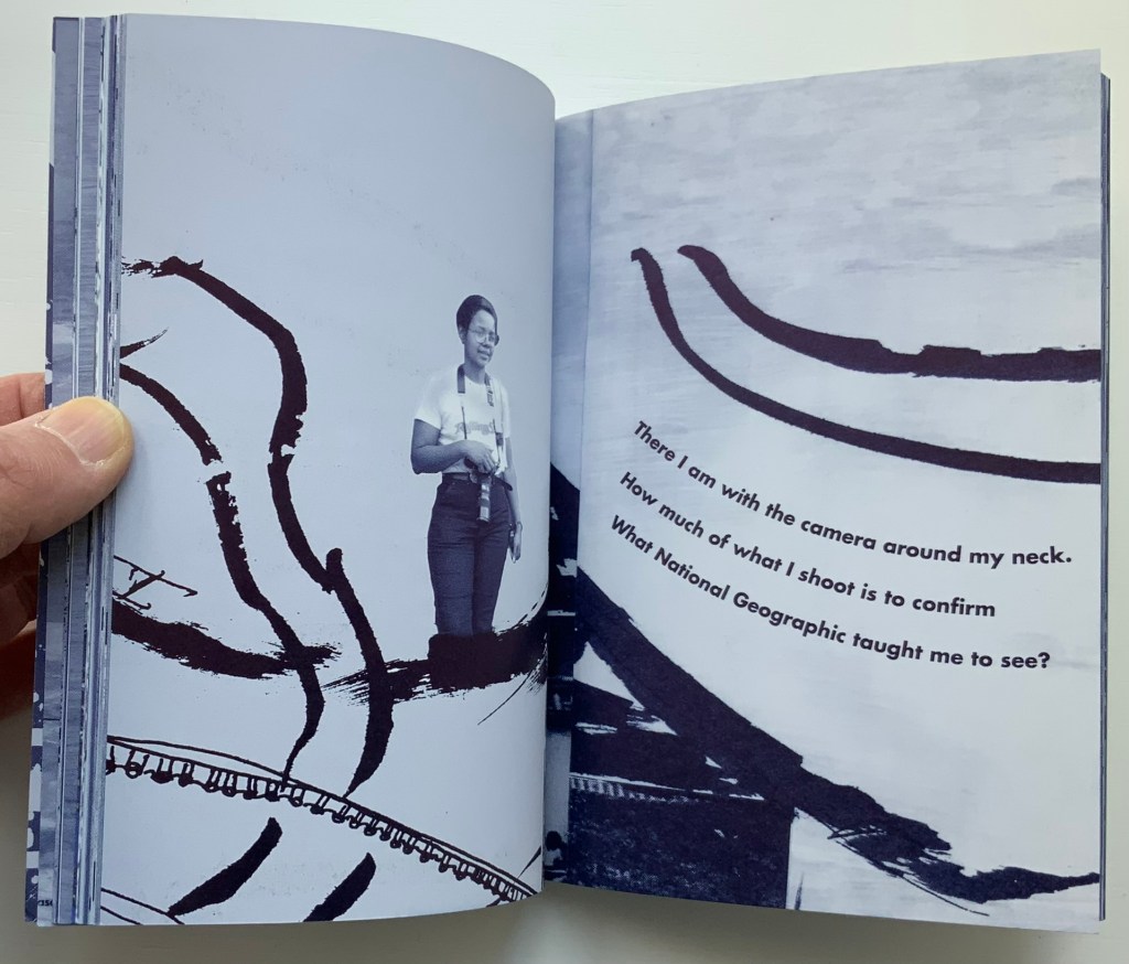 The spread in which she seems to float among brushtrokes that give a stereotypical roof profile to a fragmented photo bears text that emphasizes Sligh’s awareness of her perspective’s artifice and cultural filters.