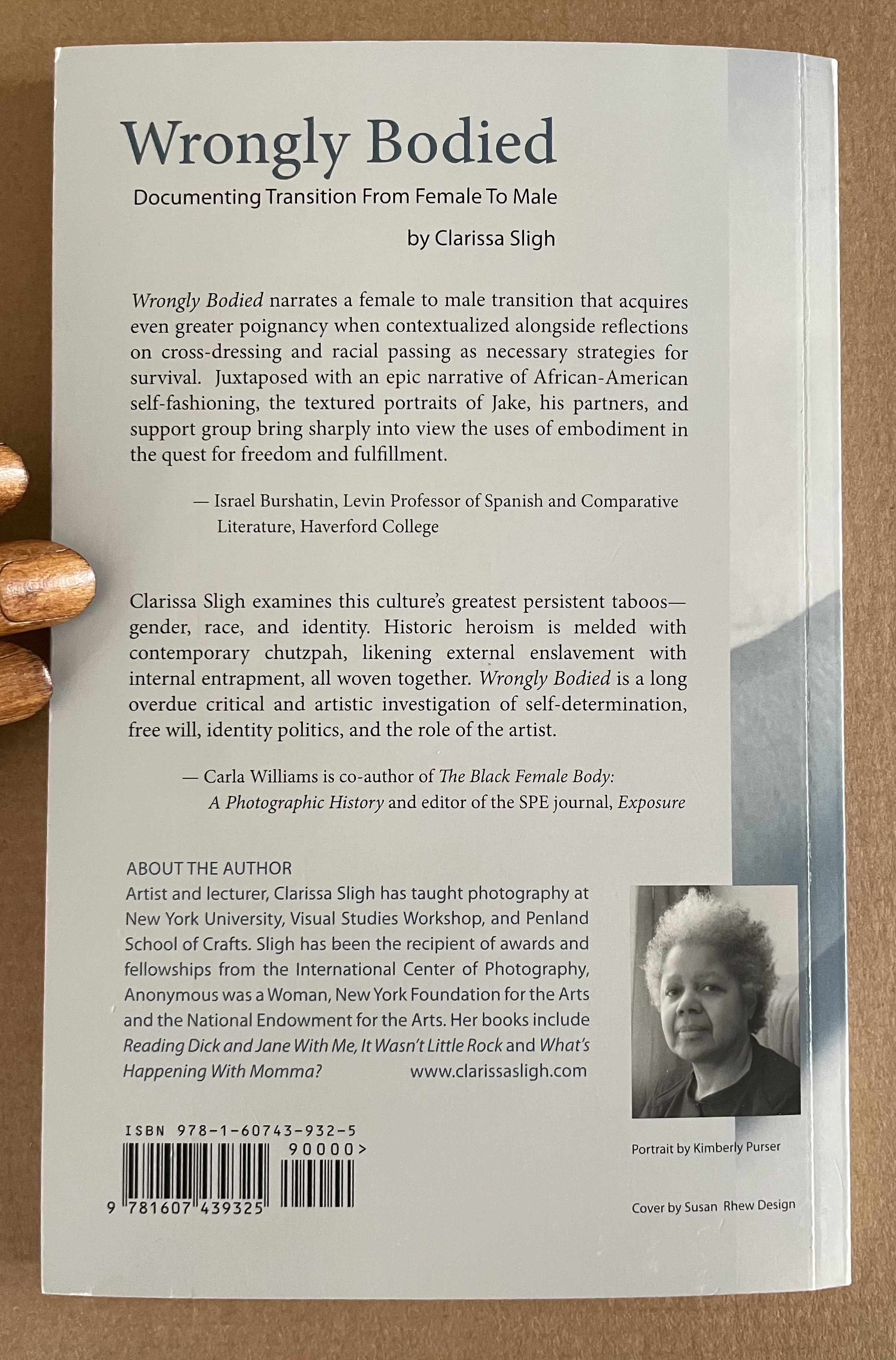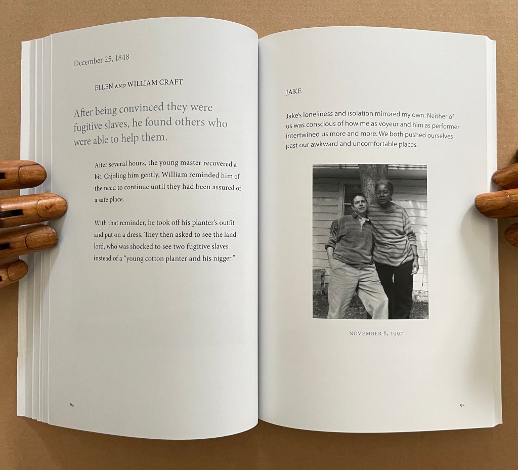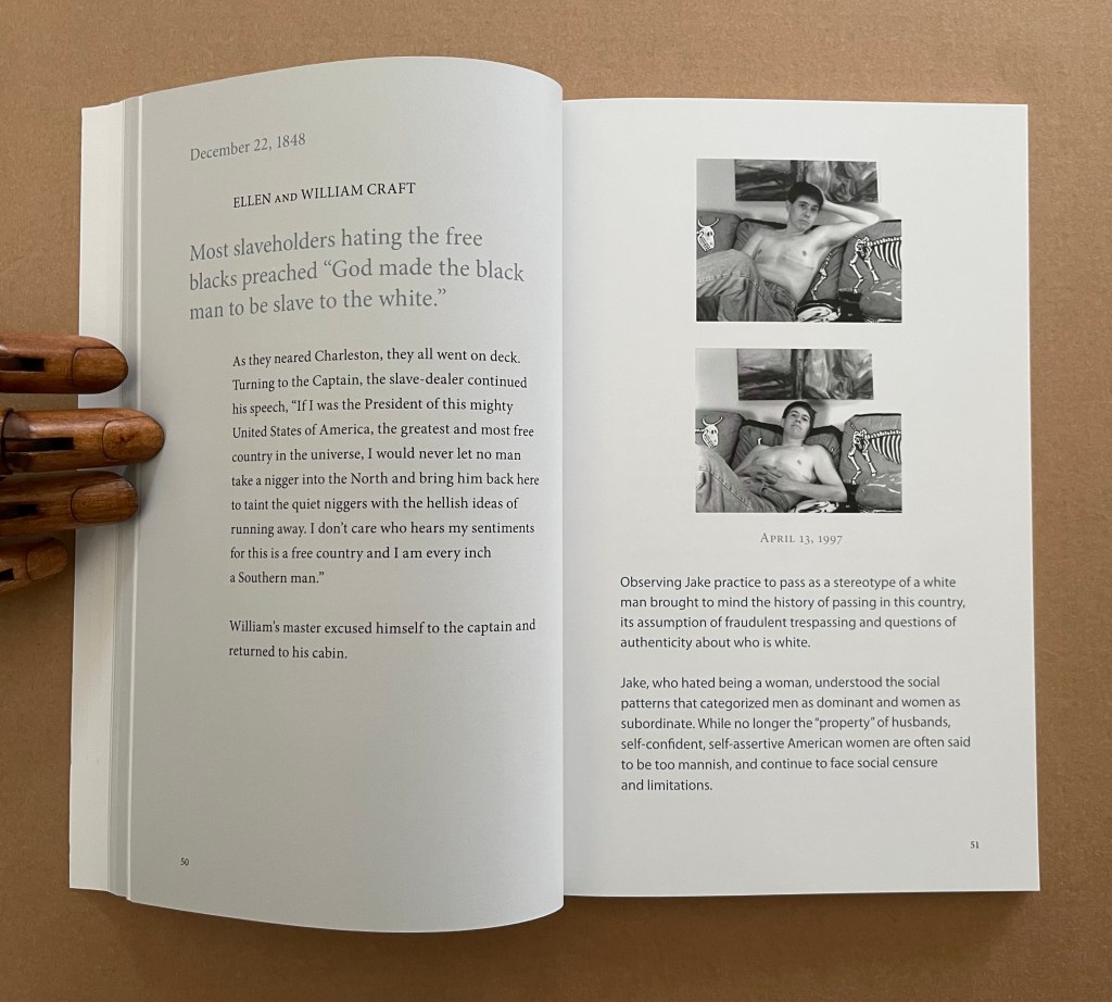 Wrongly Bodied is a complex artist’s book. If it had been available for Johanna Drucker’s consideration in 1994 for the first edition of The Century of Artists’ Books or early enough in 2004 for the new edition, it would have been an ideal candidate for inclusion in the chapters called “The Book as Sequence: Narrative and Non-narrative”, “The Artist’s Book as an Agent for Social Change”, or “The Book as Document”. It layers the Crafts’ narrative with Jake’s and with that of Sligh and Jake. As an agent for change, it addresses the social issues of gender dysphoria, misogyny, sexual discrimination, and racism. It documents the transition from Deb to Jake, it documents Sligh’s documenting, it documents the escape of Ellen and William Craft from slavery to freedom, it documents Ellen’s transformation into a white male slave owner, and it documents Sligh’s intertwining of Jake’s issue with the Crafts’ issue and her own issue.
