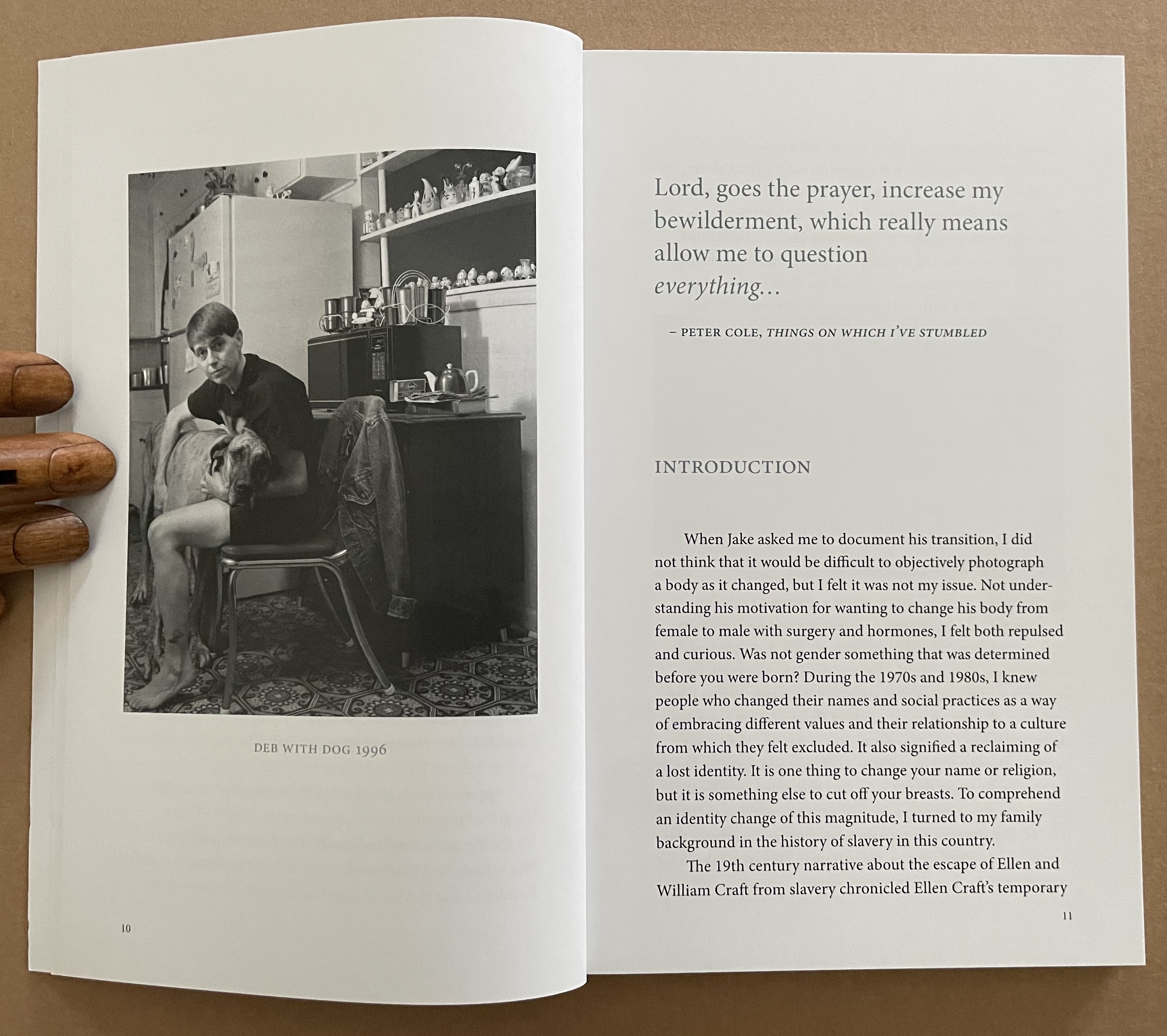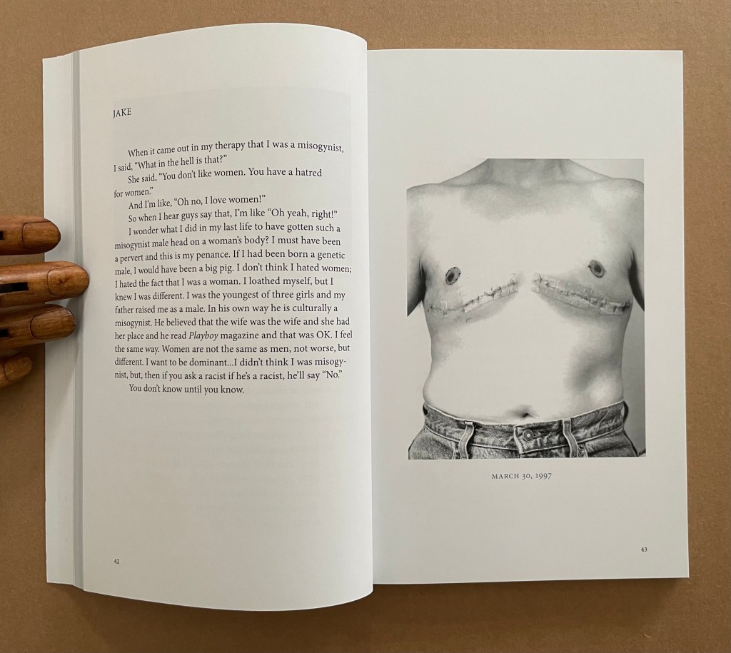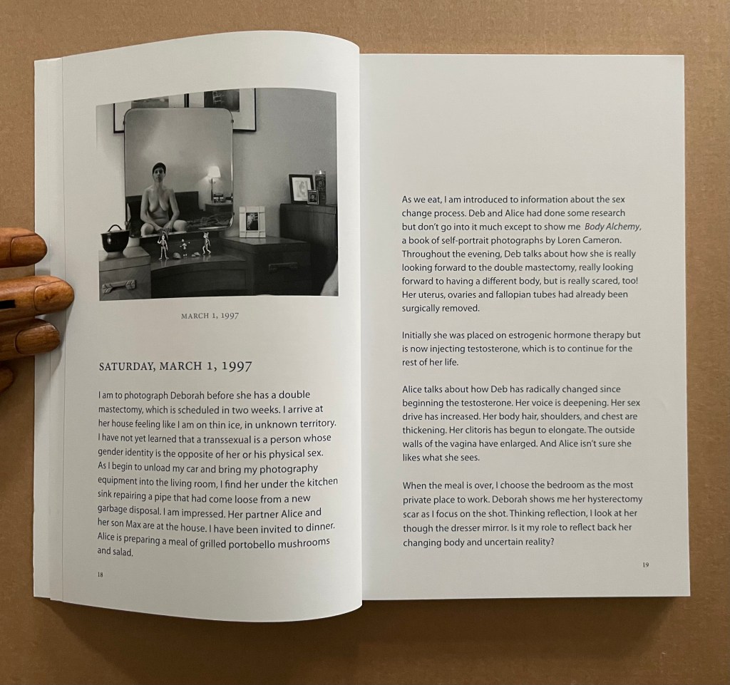 The next double-page spread presents a stark black-and-white nude, a photographed reflection of Deb/Jake well after the removal of the female sexual organs but prior to the mastectomy. As Sligh explains in her journal entry, this photo was taken after a dinner meeting with Deb/Jake and partner Alice. The description of the meeting serves several important purposes. One is to reassert Sligh’s self-aware artistic presence: “Thinking reflection, I look at her through the dresser mirror”. Another purpose is to restate Sligh’s professional and personal unease: “Is it my role to reflect back her changing body and uncertain reality?” Another purpose lies in the sentence “Alice talks about how Deb has radically changed since beginning the testosterone”, which lays the groundwork for one of the most tellingly self-aware remarks that Jake will make later in the book.