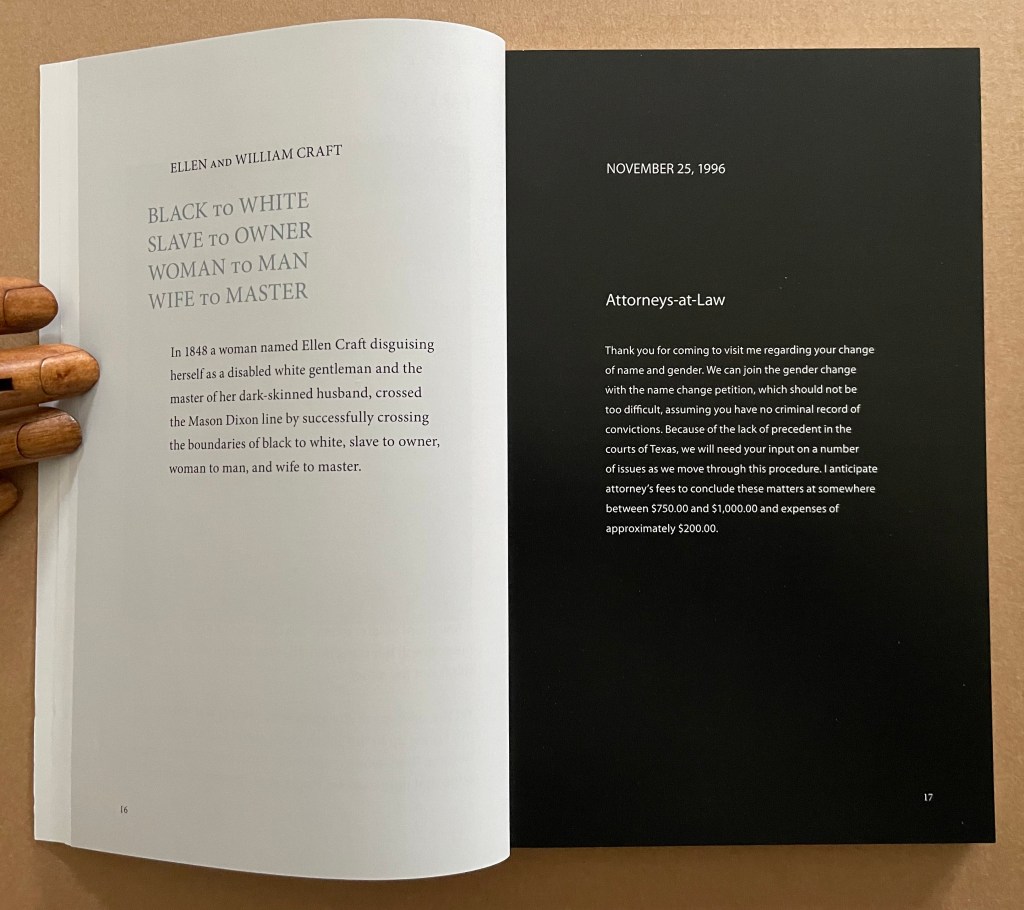 After those preliminaries, Sligh starts the artist’s book in earnest with the Crafts’ story in black ink on white paper juxtaposed with a reversed-out white on black excerpt from a letter from Deb’s lawyers who handled the legalities of the change of name and gender. The white page then the black page underline Sligh’s primary technique of juxtaposing Deb/Jake’s story with the Crafts’, but before hitting her stride with it, Sligh pauses.