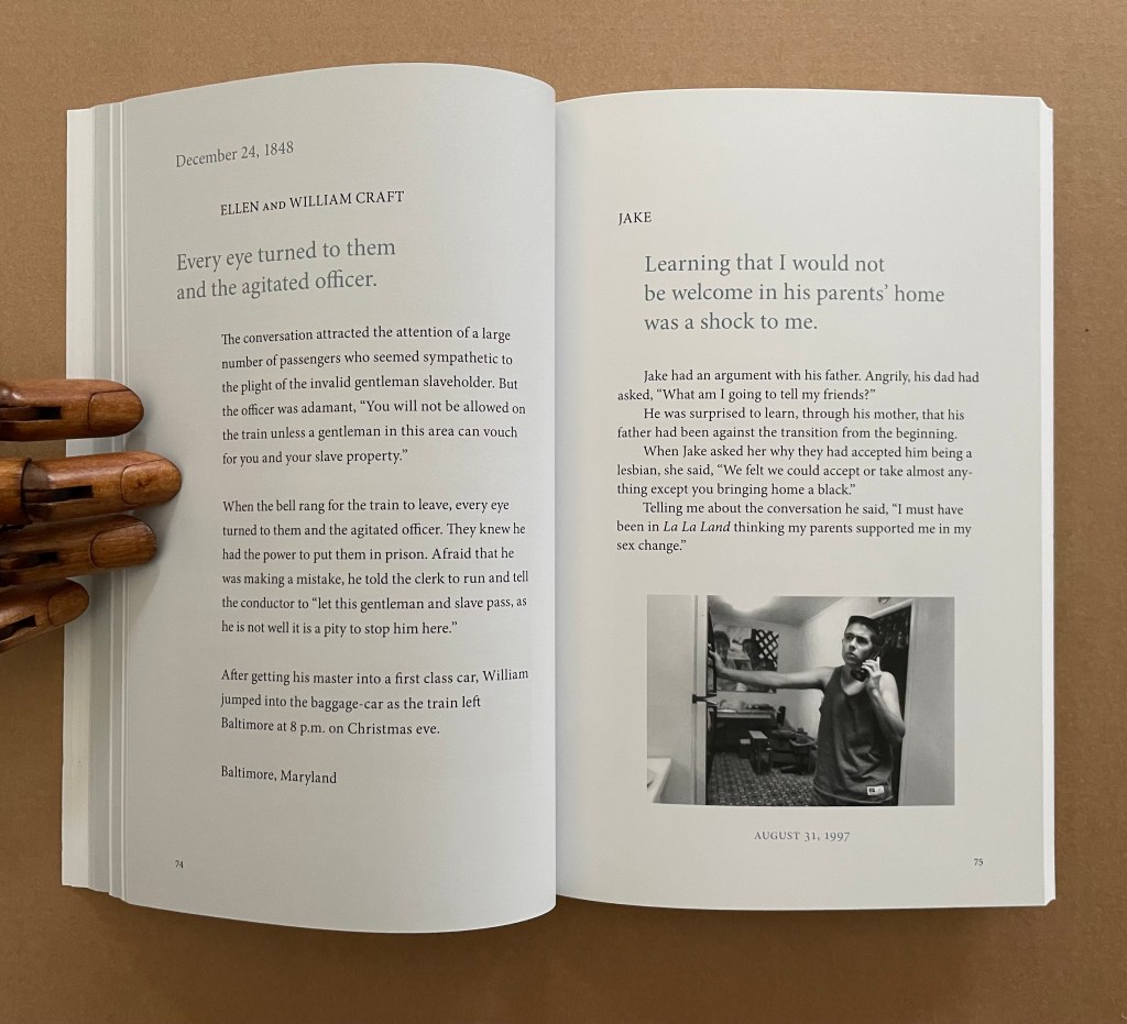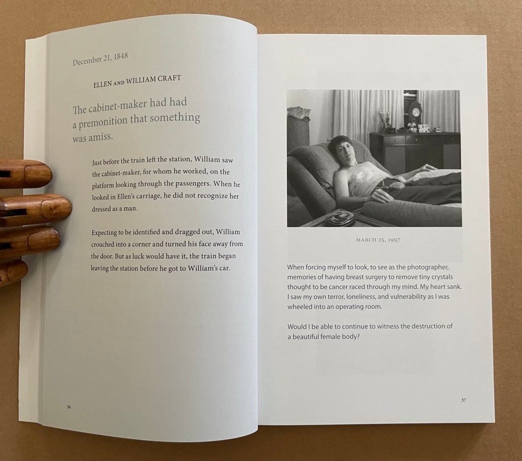 The next eight spreads establish the rhythm of entries from the Crafts’ story on the left and Deb/Jake’s on the right. Throughout the book, the latter is related by photos of the transition, excerpts of interviews with Jake, Jake’s journal, photos of friends, and excerpts of interviews with them. Throughout these eight spreads, Sligh is always present as photographer as well as juxtaposing book artist, but she reenters the foreground just after these spreads, and periodically, with journal entries ranging from her own memories of breast surgery to more communal ones of the practice of”passing” and the “place” of women in patriarchal society.
