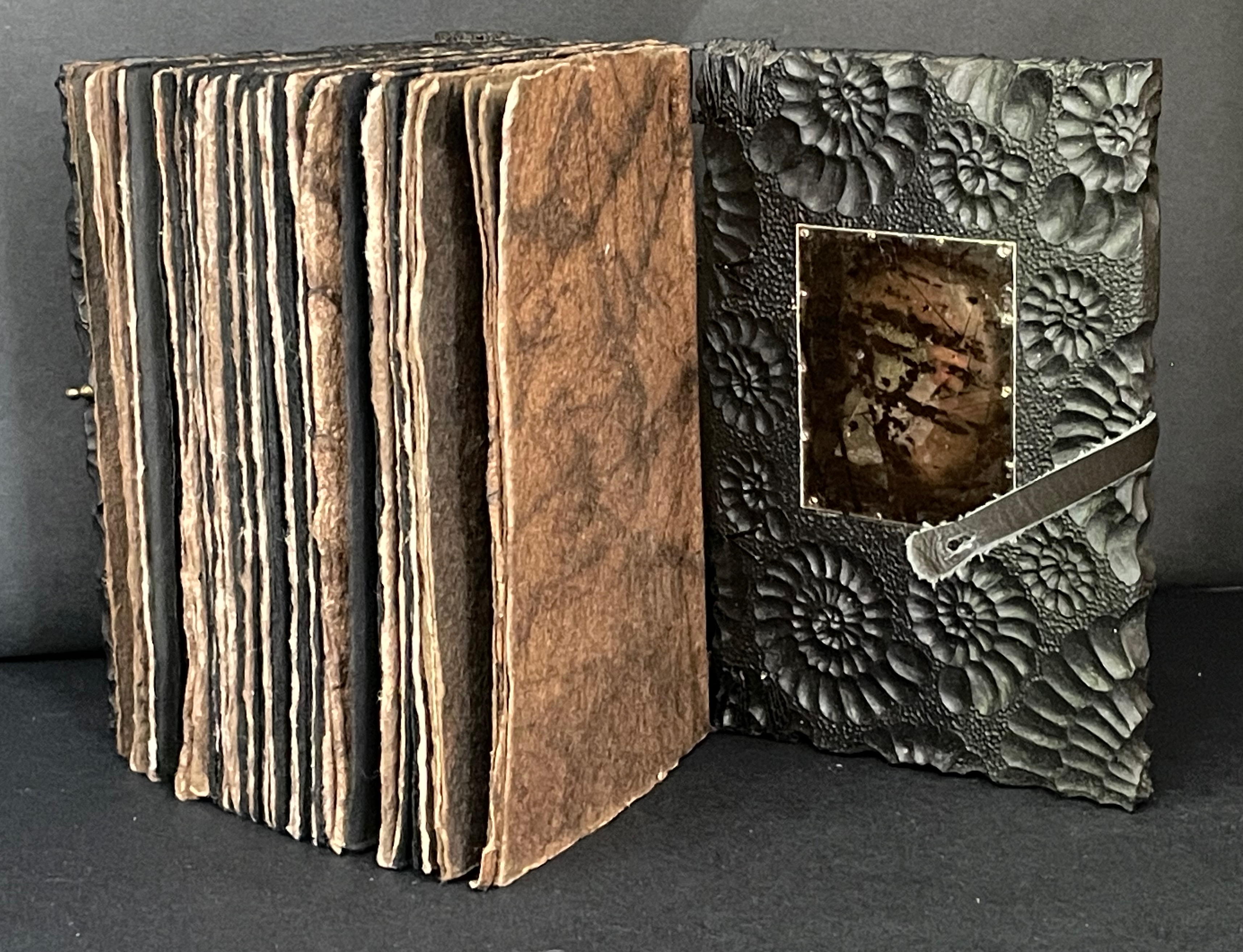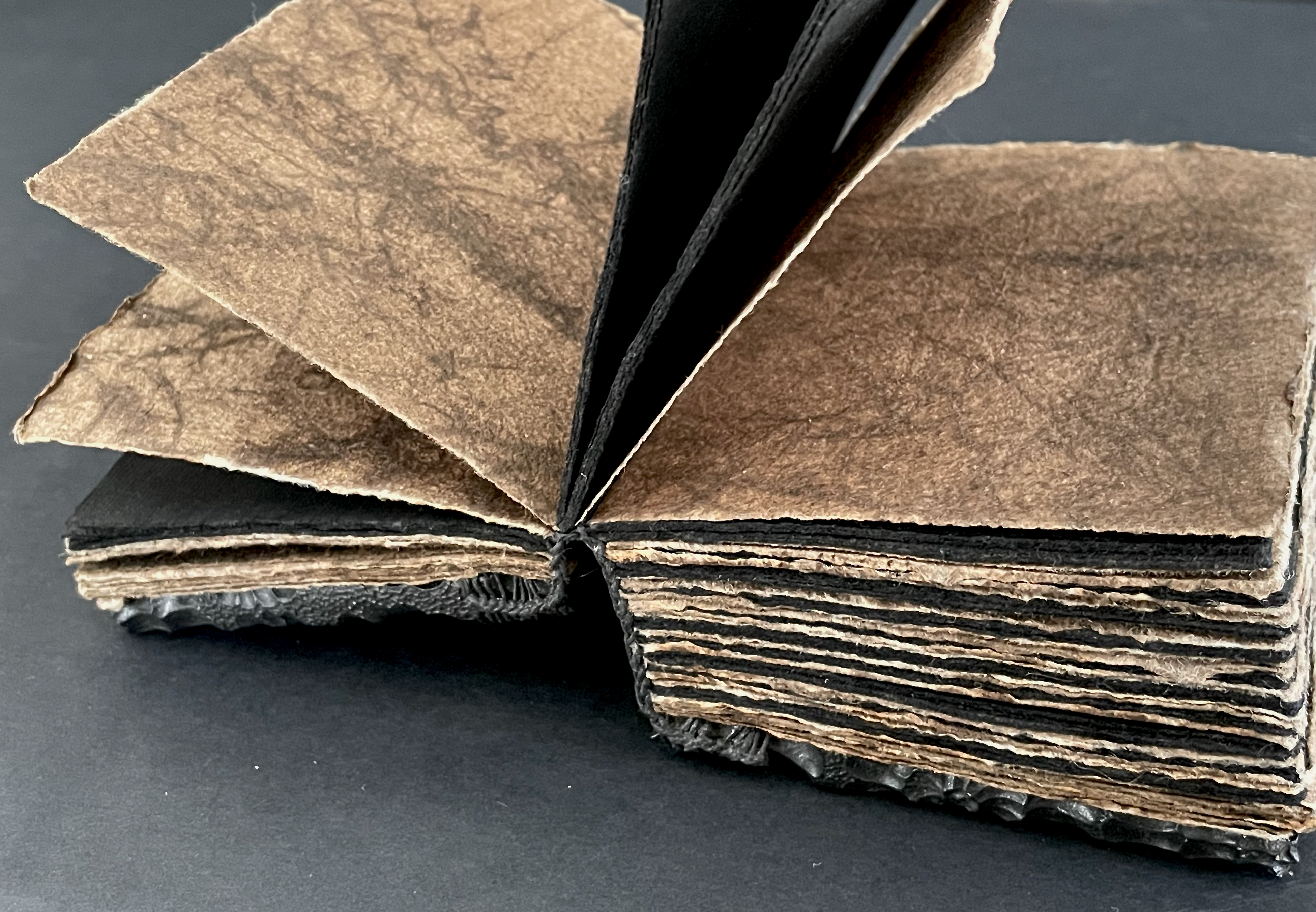 Ethiopian and Coptic bound book, sewn with waxed black linen thread, walnut-dyed handmade flax and Ingres Antique black papers, with carved front and back covers of maple, each with a bisected ammonite fossil embedded beneath a mica sheet, fixed with 1/8 brass brads. H127 x W90 x D63 mm. [384] pages. Unique. Acquired from the artists, 30 May 2025.