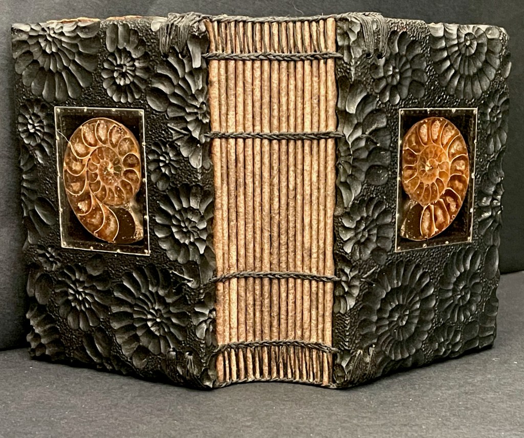 Contemporary book artists frequently use Ethiopian and Coptic bindings, and in Ammonite, the material, its treatment, and binding and unite ingeniously with the subject. Coptic binding dates back to the 2nd century CE, casting the imagination toward ancient history if not prehistory. The exposed spine, also characteristic of the later Ethiopian binding method, which Essig has followed in Ammonite‘s main sewing and board attachments, resonates physically with the ribbed appearance of ammonite fossils. The end bands are more characteristic of Coptic binding. Along the exposed spine, the waxed thread interlacing the signatures suggests the patterns to be found on the shell of the Tiger Nautilus, the closest living relative of the extinct ammonite.