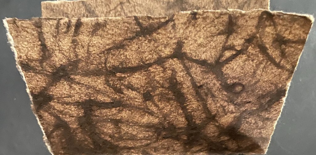 Left: Ammonite covers and spine. Center: From “Year of the Tiger“. 2022.Natural History Museum Los Angeles County. Right: Ammonite walnut-dyed flax paper.