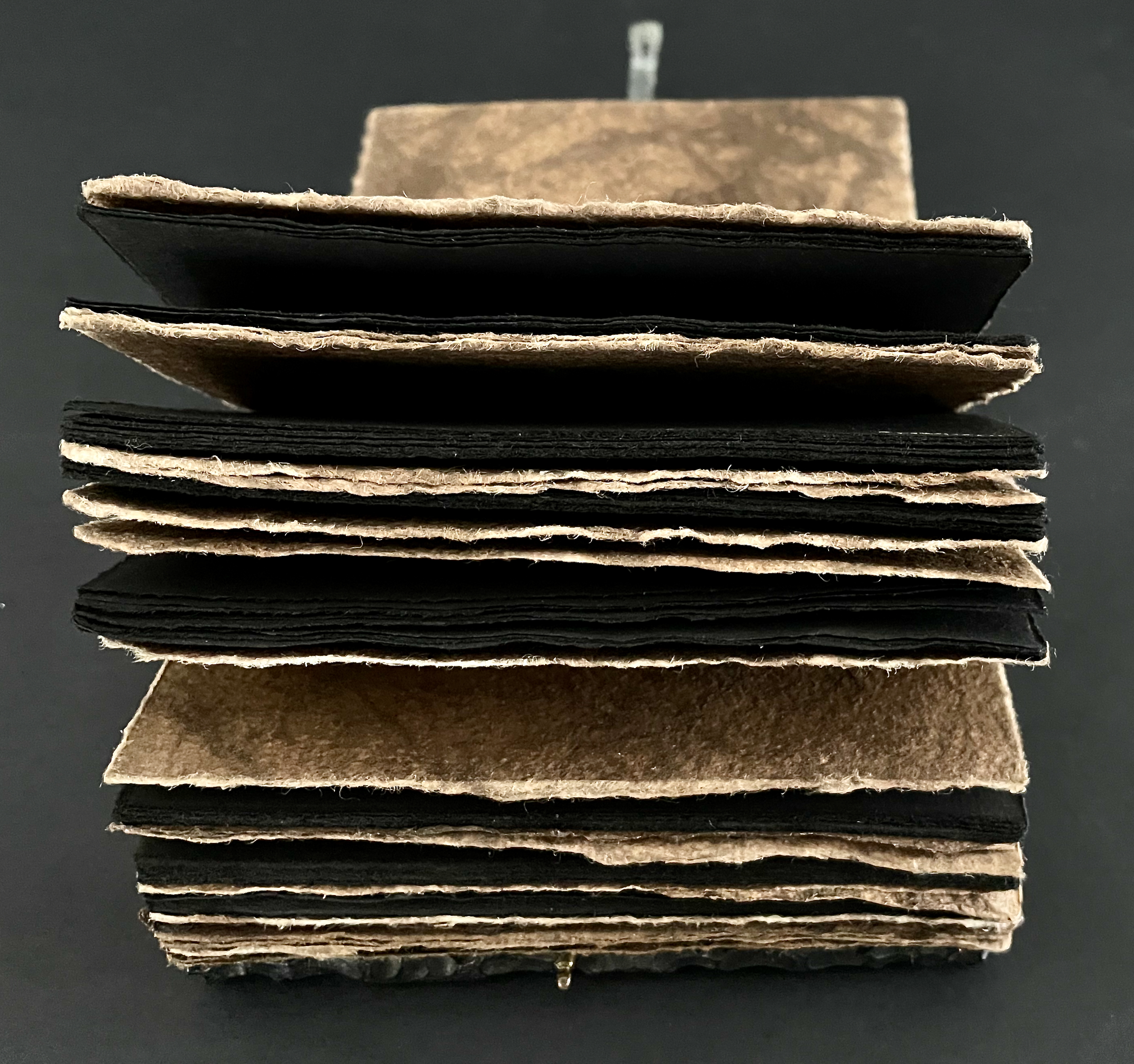 The handling of the book block echoes Ammonite‘s subject in other ways. There are fifteen signatures of well-chosen papers. The first two and the last signatures are 8-leaf signatures of the handmade papers; the remaining twelve signatures each consist of a handmade paper folio wrapping around a 12-leaf signature of Ingres Antique black. On the fore edge, the layering of the lighter and darker hand-dying of the flax paper (handmade at Cave Papers by Bridget O’Malley) with the Ingres Antique black paper suggest the sedimentation that takes us back in time to the fossil carvings on the burnt and burnished maple covers and their embedded mica-covered miniature natural history display cases.