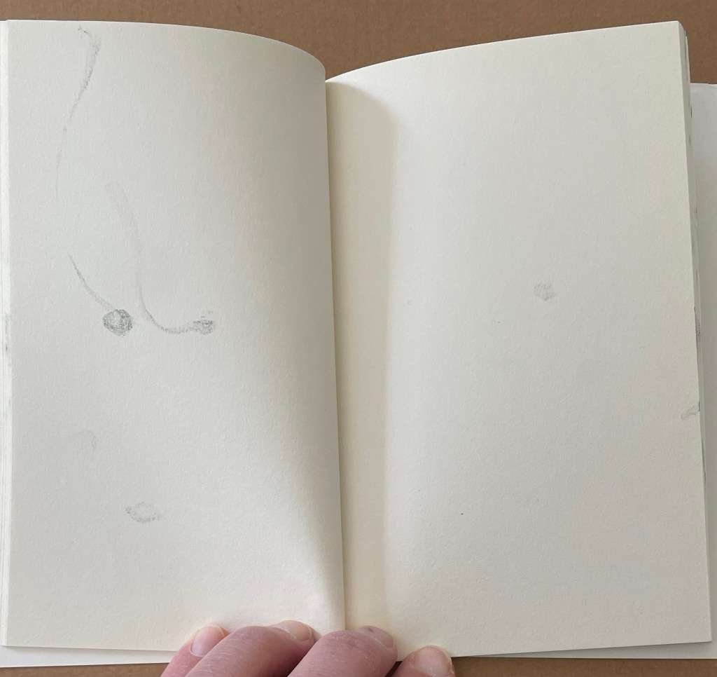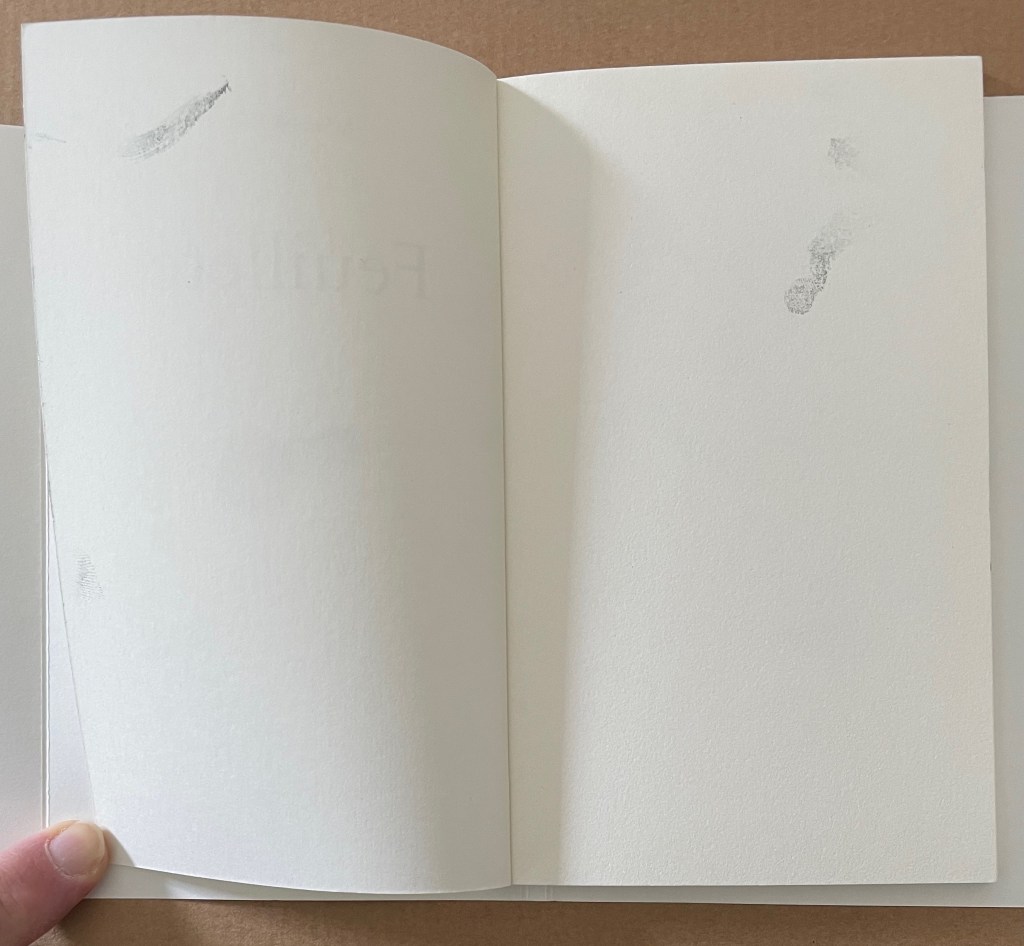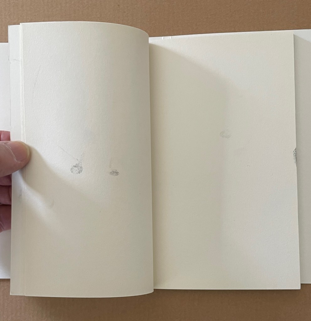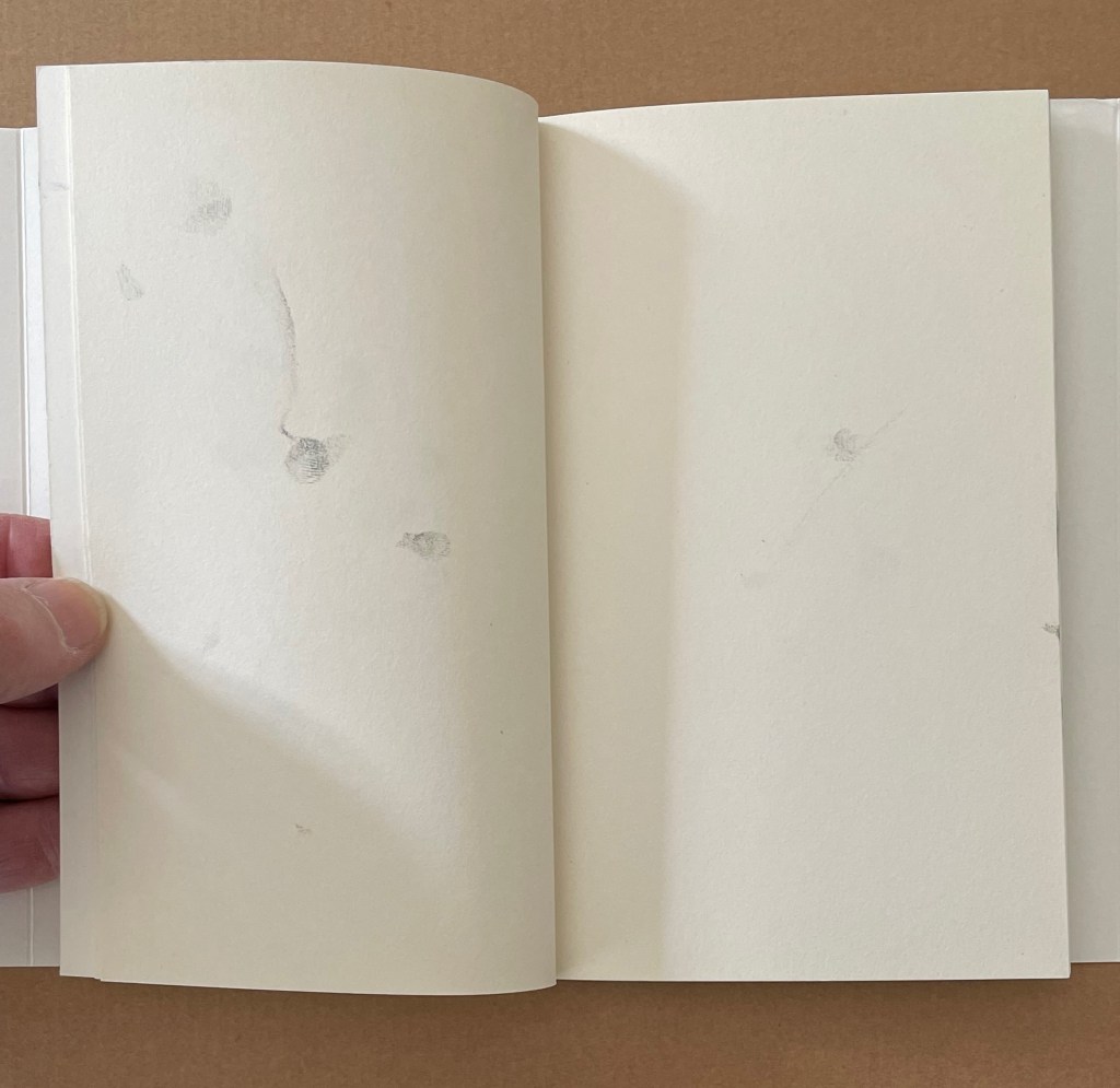 More self-reflexive mischief here. It’s like a simple sentence of Subject-Verb-Object except it’s a tautological jumble of SOV. The subject is the act of browsing or leafing through. The object is the blank book browsed or leafed through. The only evidence of the verb are the inky fingerprints which have acted on the object, altering it and making it into the subject.