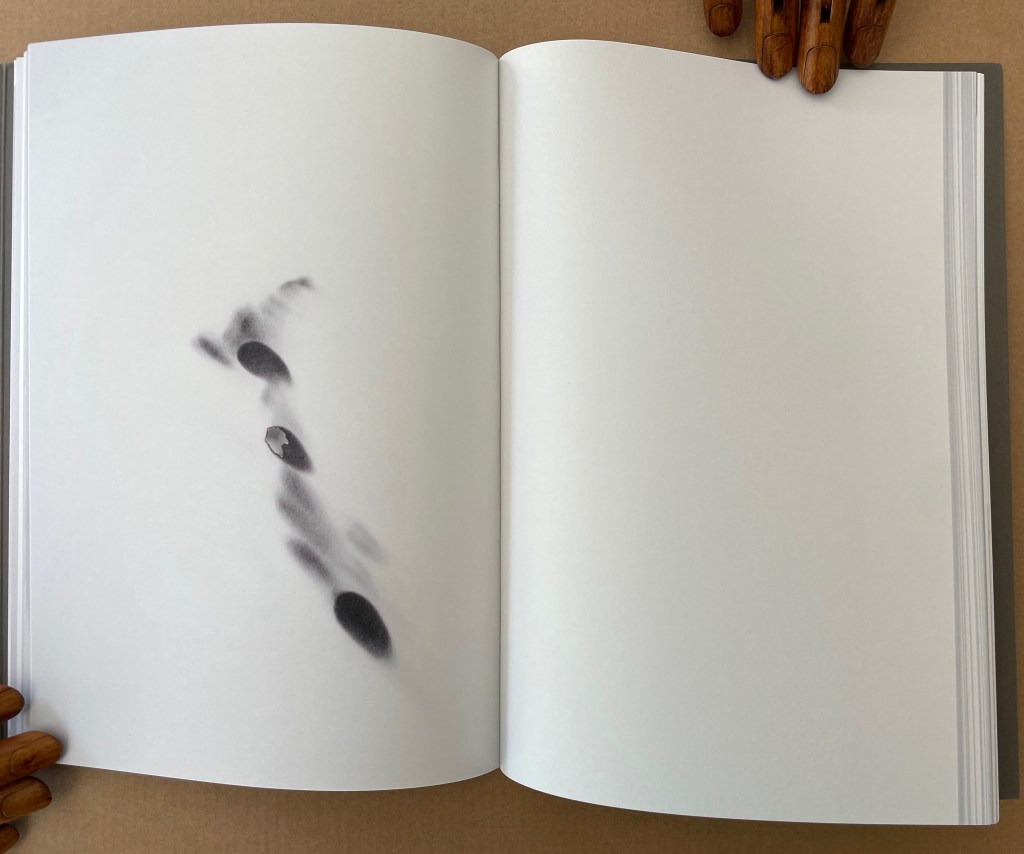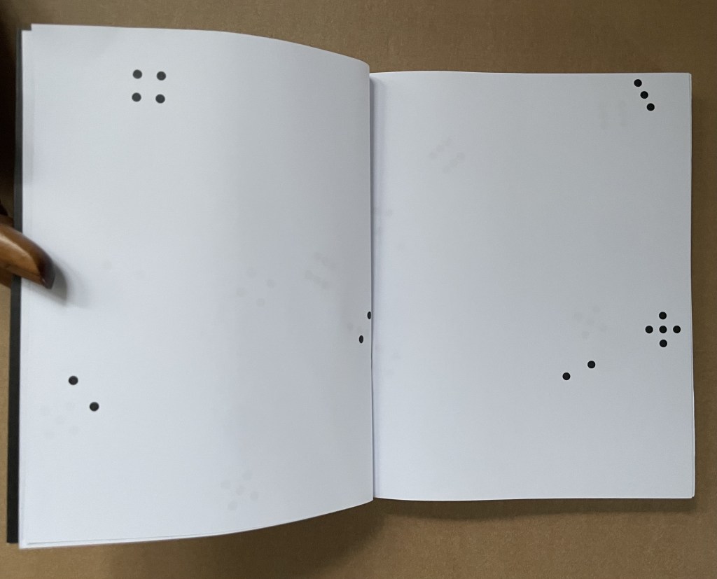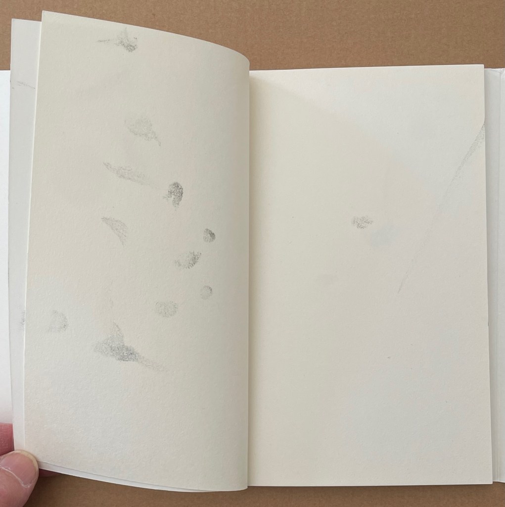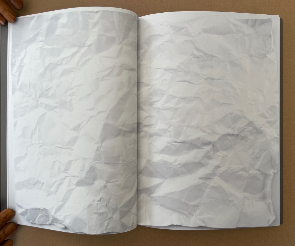 More self-reflexive mischief here. It’s like a simple sentence of Subject-Verb-Object except it’s a tautological jumble of SOV. The subject is the act of browsing or leafing through. The object is the blank book browsed or leafed through. The only evidence of the verb are the inky fingerprints which have acted on the object, altering it and making it into the subject.