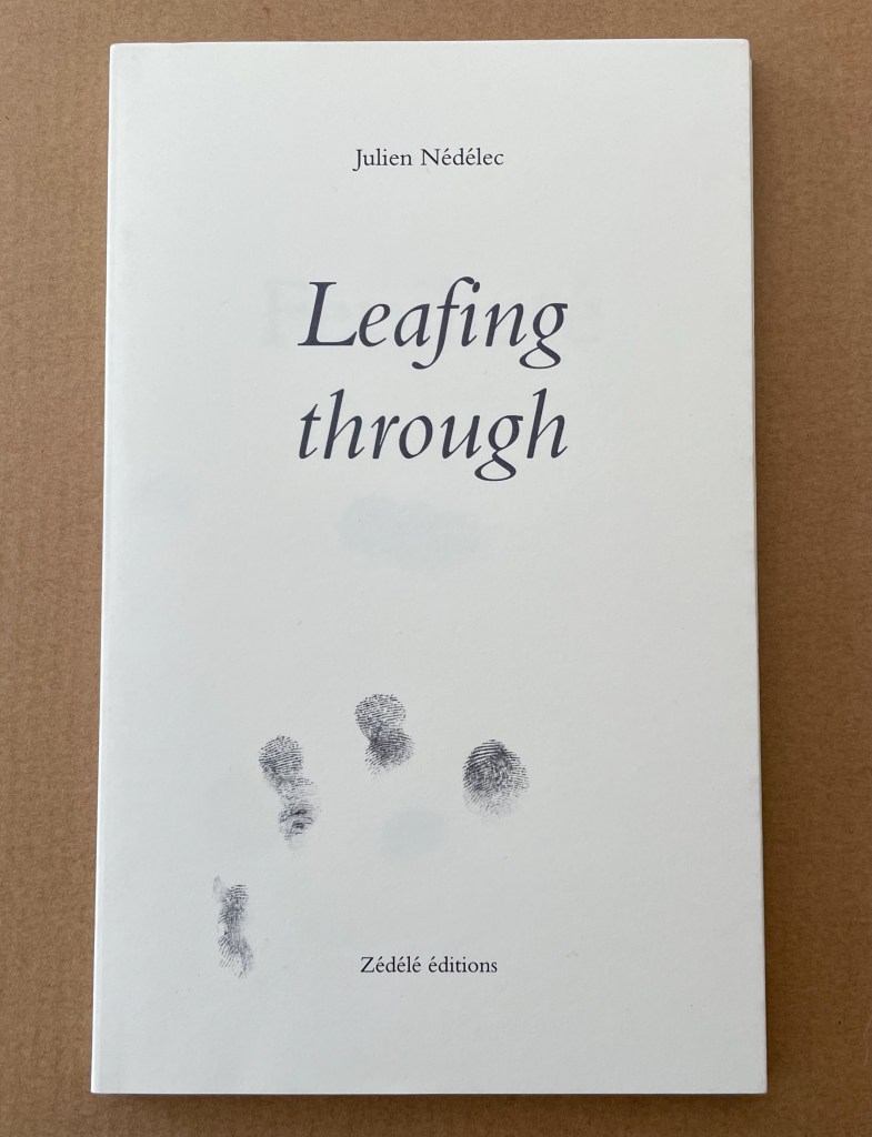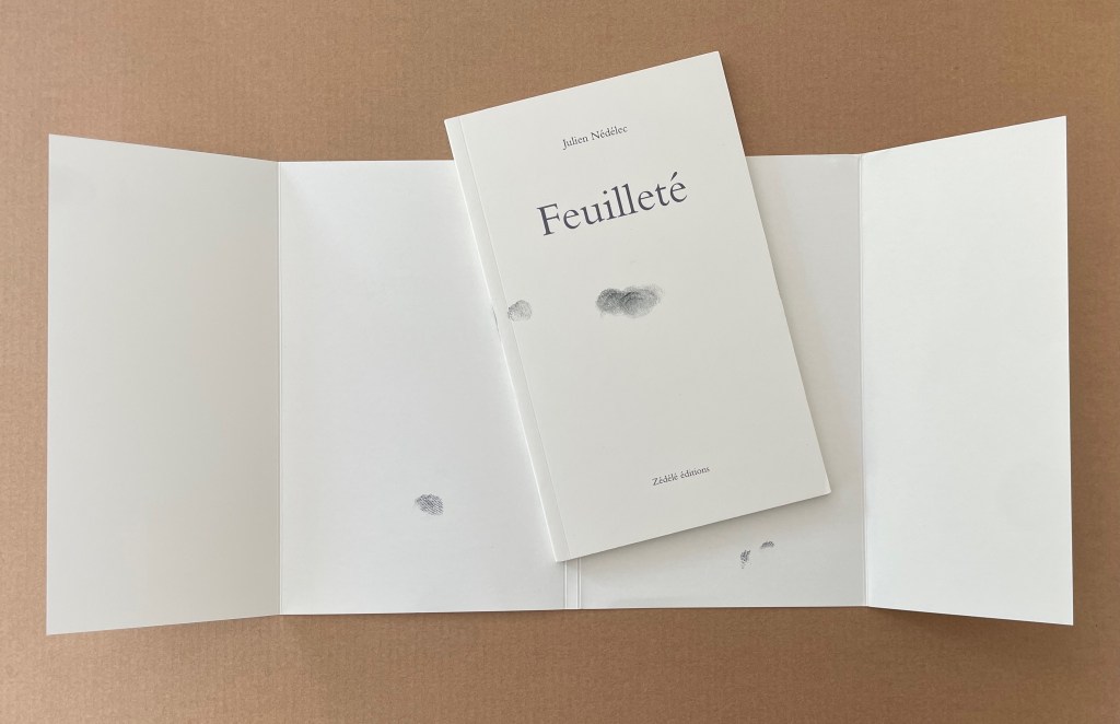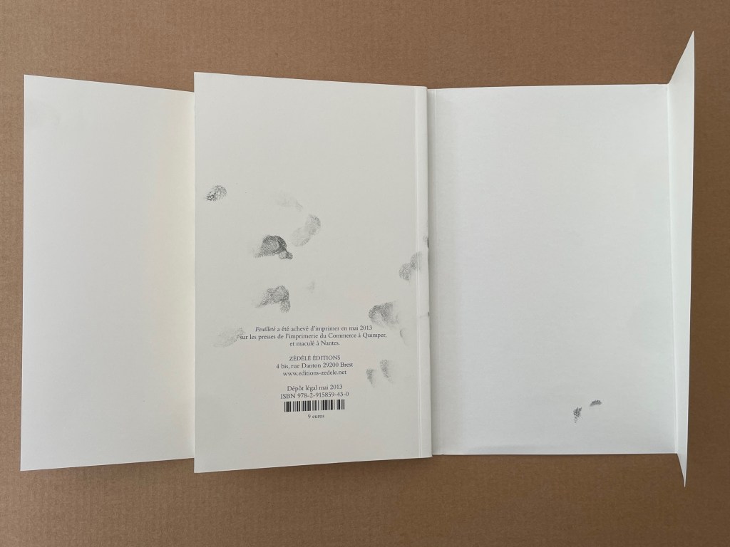 Dust jacket with deep flaps around perfect bound paperback. H185 x W115 mm. [48] pages. Acquired from Zédélé Éditions, 9 May 2024.