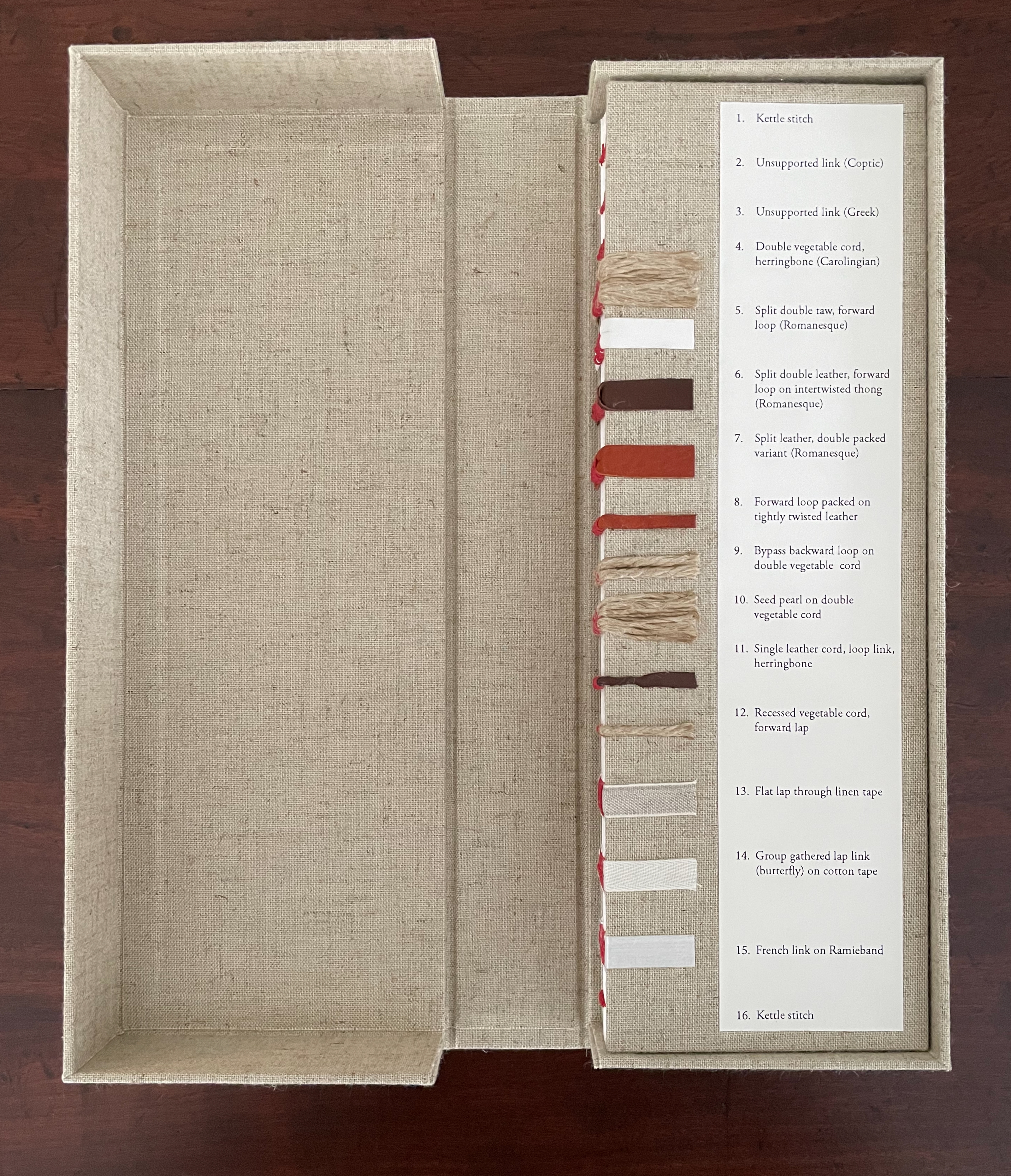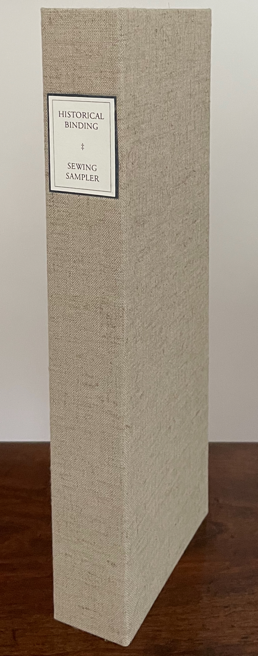is designed for bookbinders and book enthusiasts as a personal reference and/or for teachers/historians with a focus in book history and book conservation. This is a large folio size blank book featuring varied sewing techniques that can also be used as a ledger or unique journal or sketchbook. It includes one hardcover sampler book with the option to be housed in a custom clamshell box covered in natural linen bookcloth. The sampler includes 16 different sewing methods both sewn on supports (hemp cord, leather and taw, linen and cotton tapes, and Ramieband) and sewn without supports. The sampler highlights the historical sewing styles inherent to their structure and includes title descriptions that correspond to each sewing station. The styles progress chronologically across the spine from the earliest forms of multi-section sewing to more modern adaptations and sewing variants. (Anne Covell)