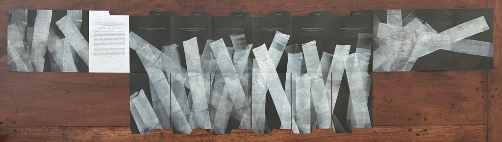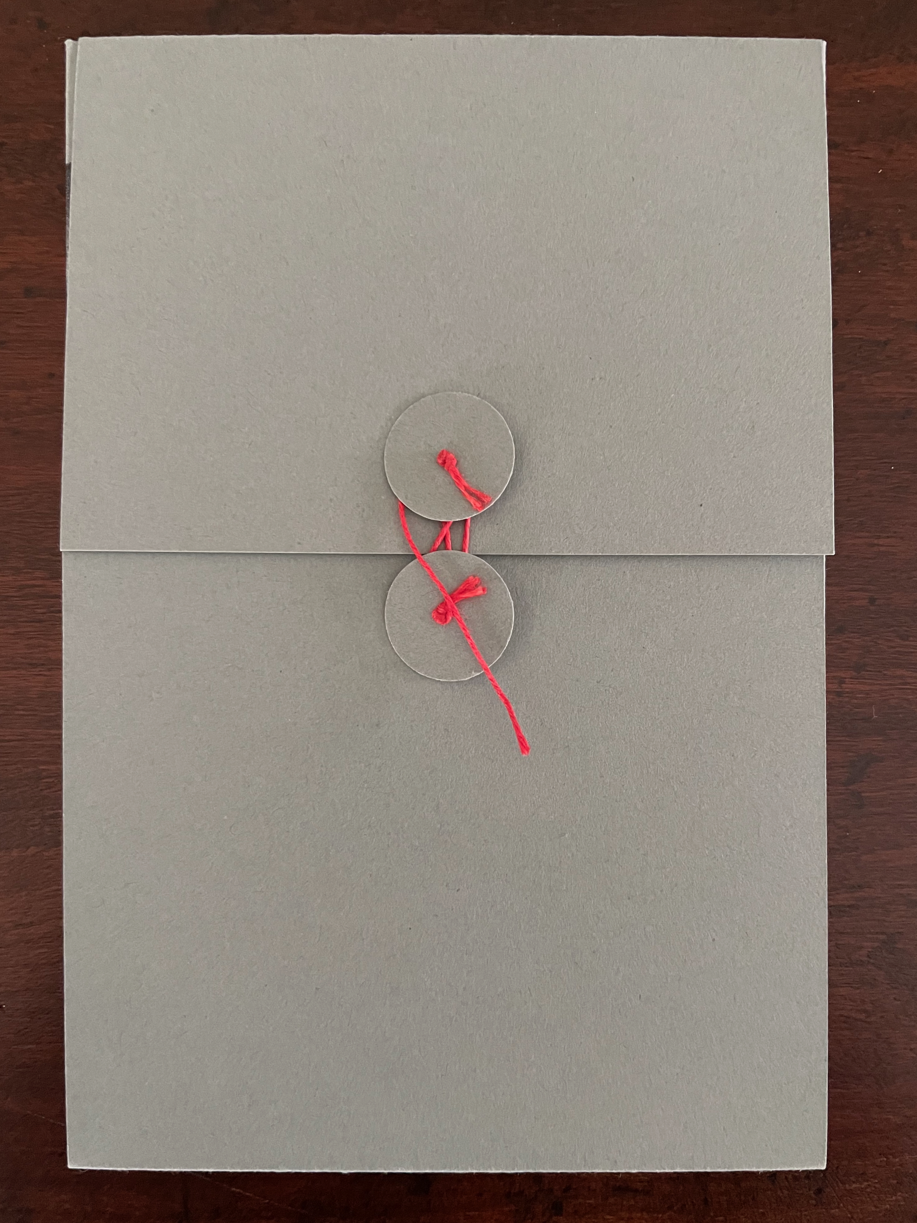 Letterpress printed accordion on Masa paper with sumi wash and hand brayering. Housed in a 4-flap French paper enclosure with button and string ties. Enclosure: H165 x W110 x D6 mm. Book: H164 x W108 x D3 mm (closed); H327 x W1080 mm (open). 6.5 x 4.25 x .25 inches (closed), 13 x 42.5 x .25 inches (open) [36] panels. Edition of 60, of which this is #1. Acquired from the artist, 10 September 2025.