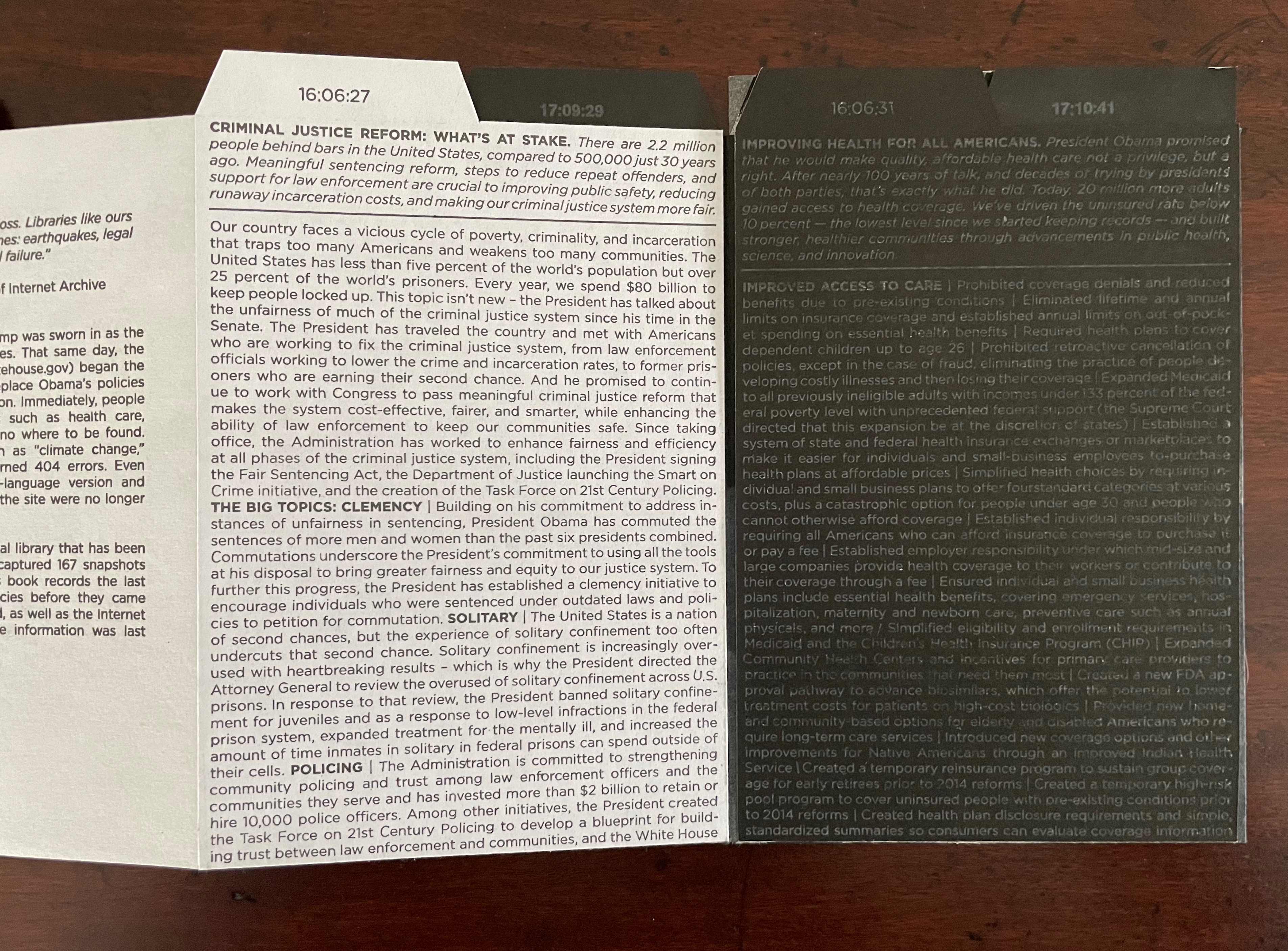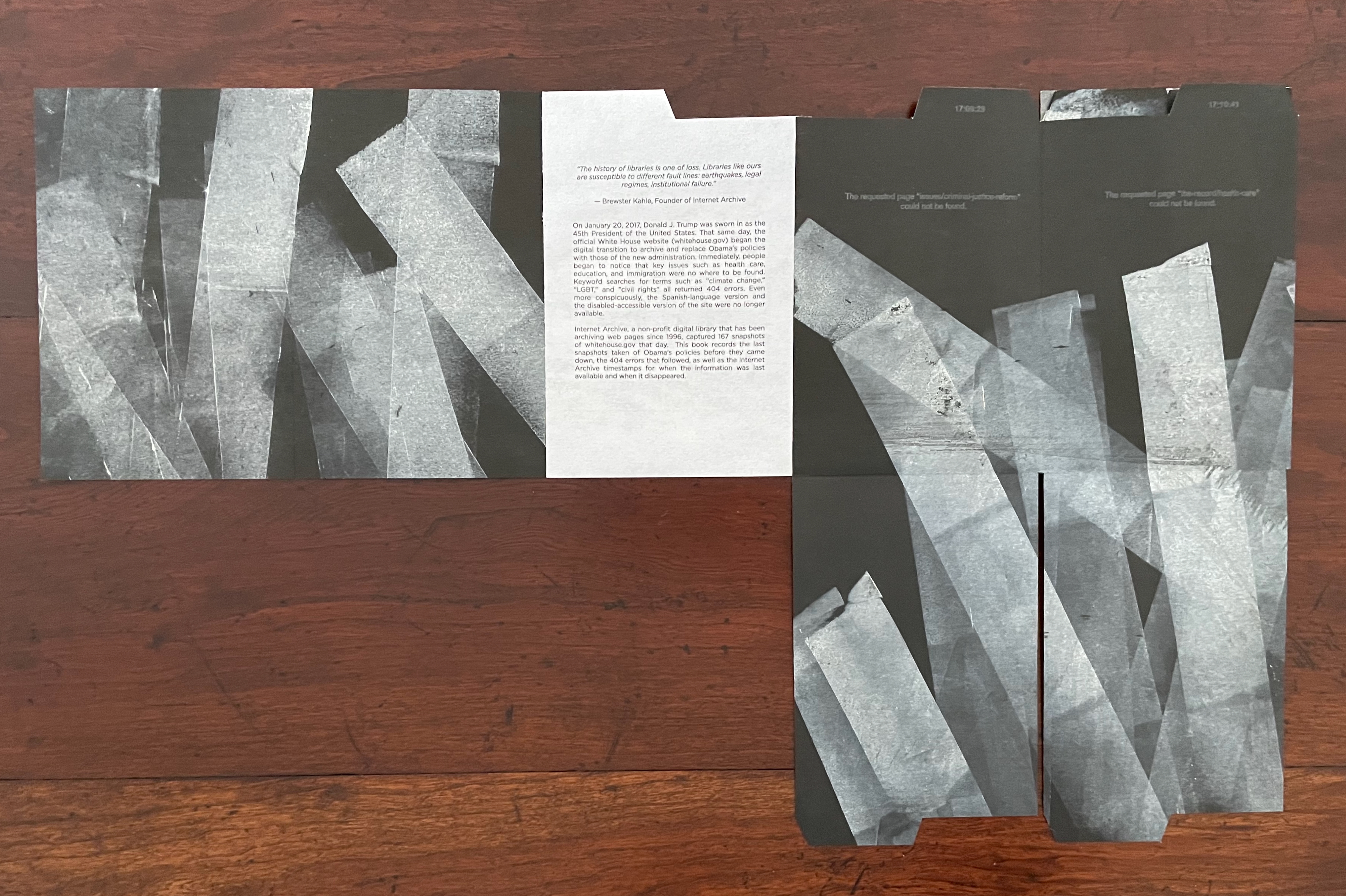 On January 20th, 2017, Donald J. Trump was sworn in as the 45th president of the United States. That same day, the official White House website (whitehouse.gov) began the digital transition to archive and replace Obama’s policies with those of the new administration. Immediately, people began to notice that key issues such as health care, education, and immigration were nowhere to be found. Keyword searches for terms such as “climate change,” “LGBT,” and “civil rights” all returned 404 errors. Even more conspicuously, the Spanish-language version and the disabled-accessible version of the site were no longer available. Internet Archive, a non-profit digital library that has been archiving webpages since 1996, captured 167 snapshots of whitehouse.gov that day. This book records the last snapshots taken of Obama’s policies before they came down, the 404 errors that followed, as well as the Internet Archive timestamps for when the information was last available and when it disappeared. (Anne Covell).