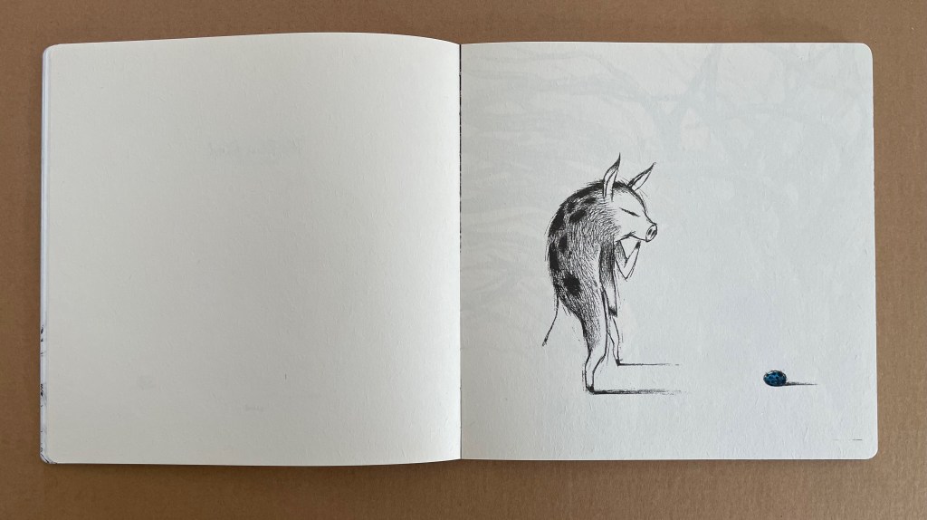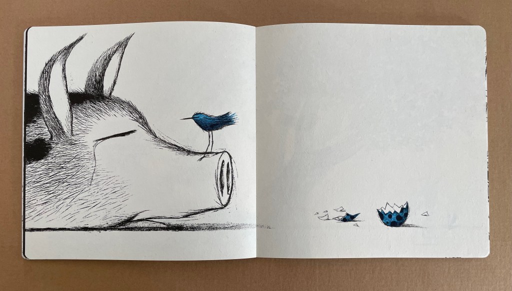 The simplicity and evocative sophistication of composition and line eliminate the need for any words to carry the narrative. In the sequence below, Boar’s protective parental handling of the egg against wind and wave ends in predictable exhaustion and birth.