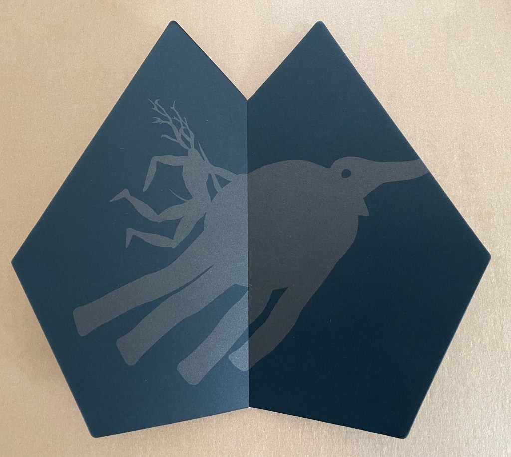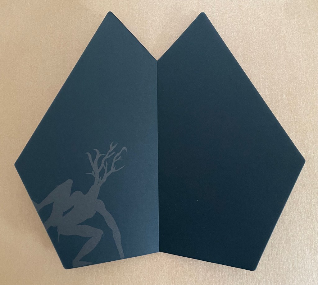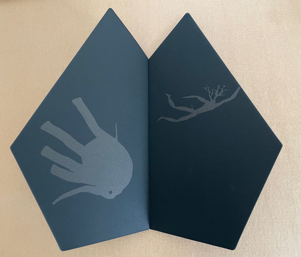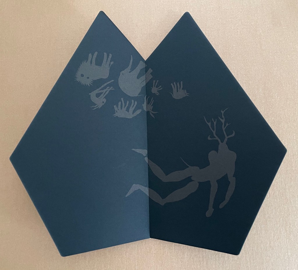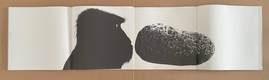 A translation that resonates more with the paper, structure, and images might be “A book contemplating the primordial state of the human before light and socialization.” Such a book would, of course, not have the normalized appearance we enlightened and socialized humans expect. Hence the black oddly shaped covers and leaves across which the gray, almost headless creature crawls on all fours and begins to sprout antlers or branches.