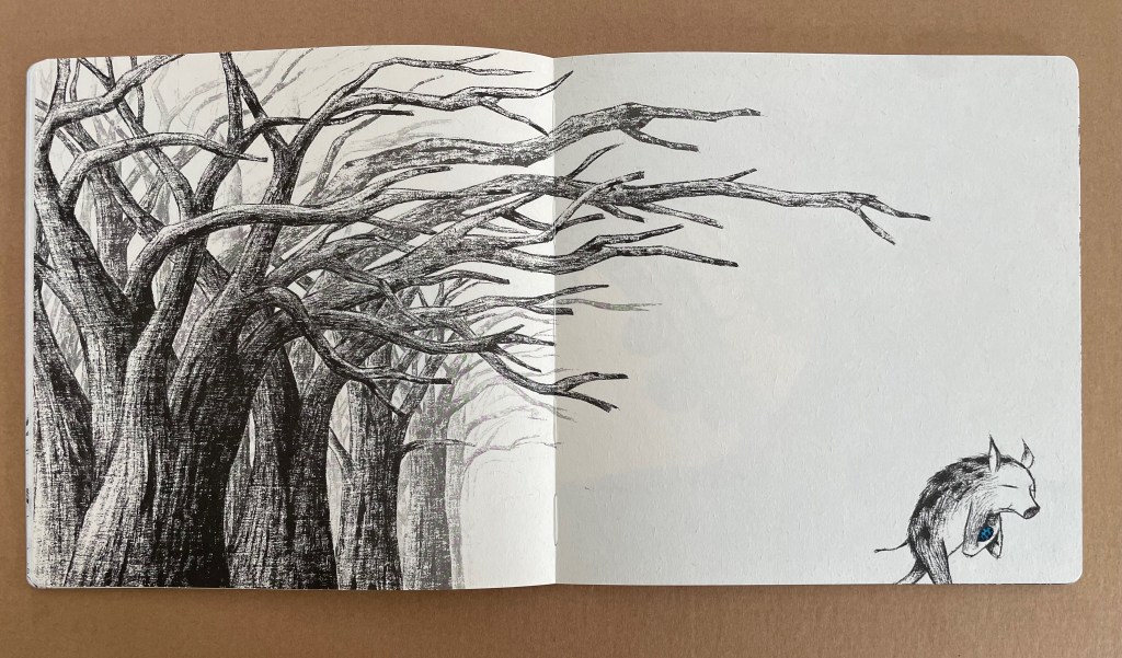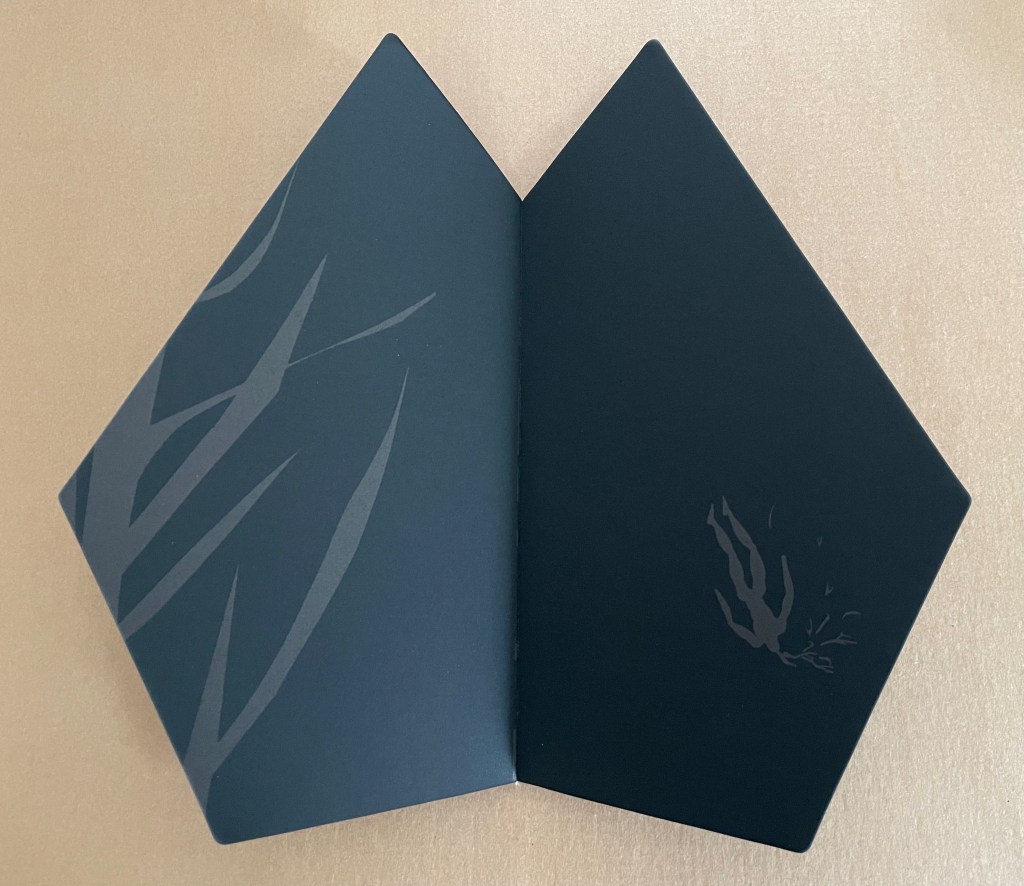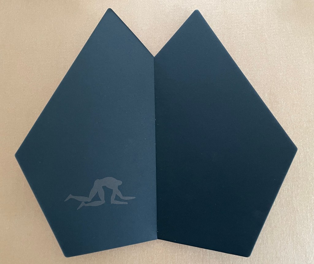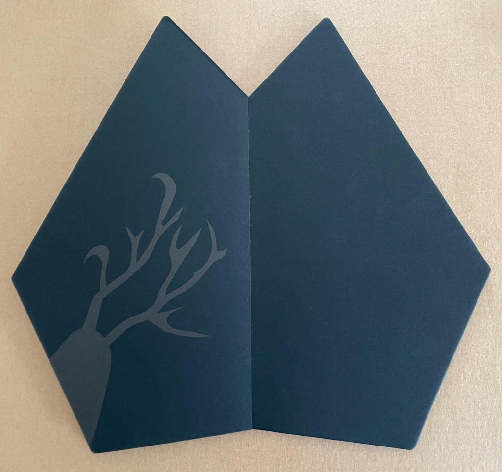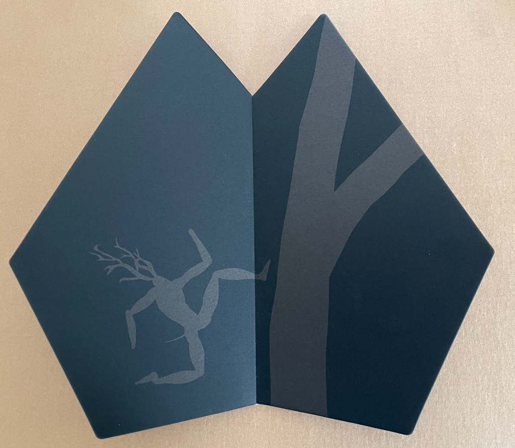 A translation that resonates more with the paper, structure, and images might be “A book contemplating the primordial state of the human before light and socialization.” Such a book would, of course, not have the normalized appearance we enlightened and socialized humans expect. Hence the black oddly shaped covers and leaves across which the gray, almost headless creature crawls on all fours and begins to sprout antlers or branches.