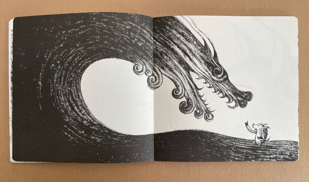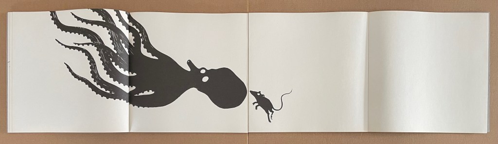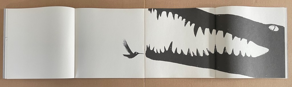 Among the effective subtleties that more experienced observers will note are Cho’s handling of bleeds and the facing sets of double-page spreads. The large expanses of white behind each of any two smaller figures facing each other from single pages contribute to a non-threatening delicate kiss. The larger, more threatening creatures extend across their double-page spreads and even bleed off their pages. When they meet, or when one of them meets a smaller figure, there is an edge. It may be an edge of curiosity on one side or the other or both, but it is likely also one of threat and unease.