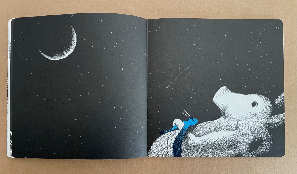 The remainder of the book in which Boar introduces Blue Bird to the world of foraging, running, jumping, sky- and star-gazing is landbound. Boar climbs trees to let Blue Bird sleep there, but when returns to the ground to sleep, Blue Bird follows, preferring to nestle against Boar under the stars.