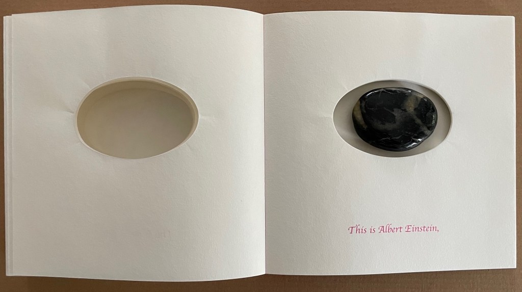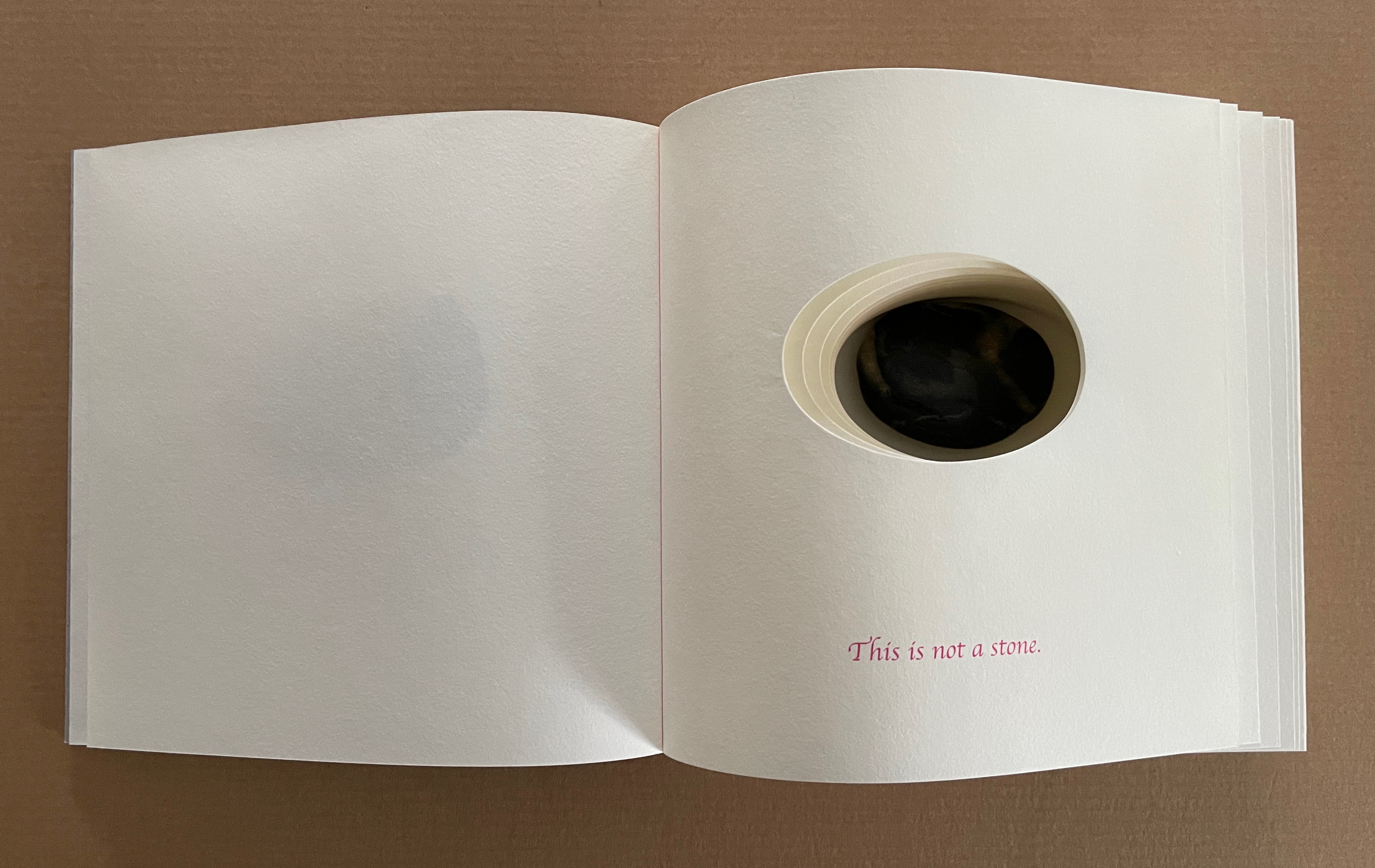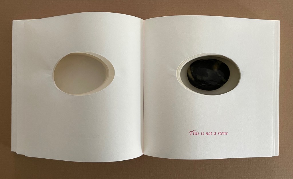 Just as you think this will be another two-dimensional riff on René Magritte’s The Treachery of Images (aka Ceci n’est pas une pipe), the Chinese fold title page turns to reveal a cutout well with a stone at the bottom.