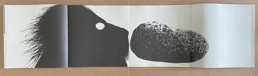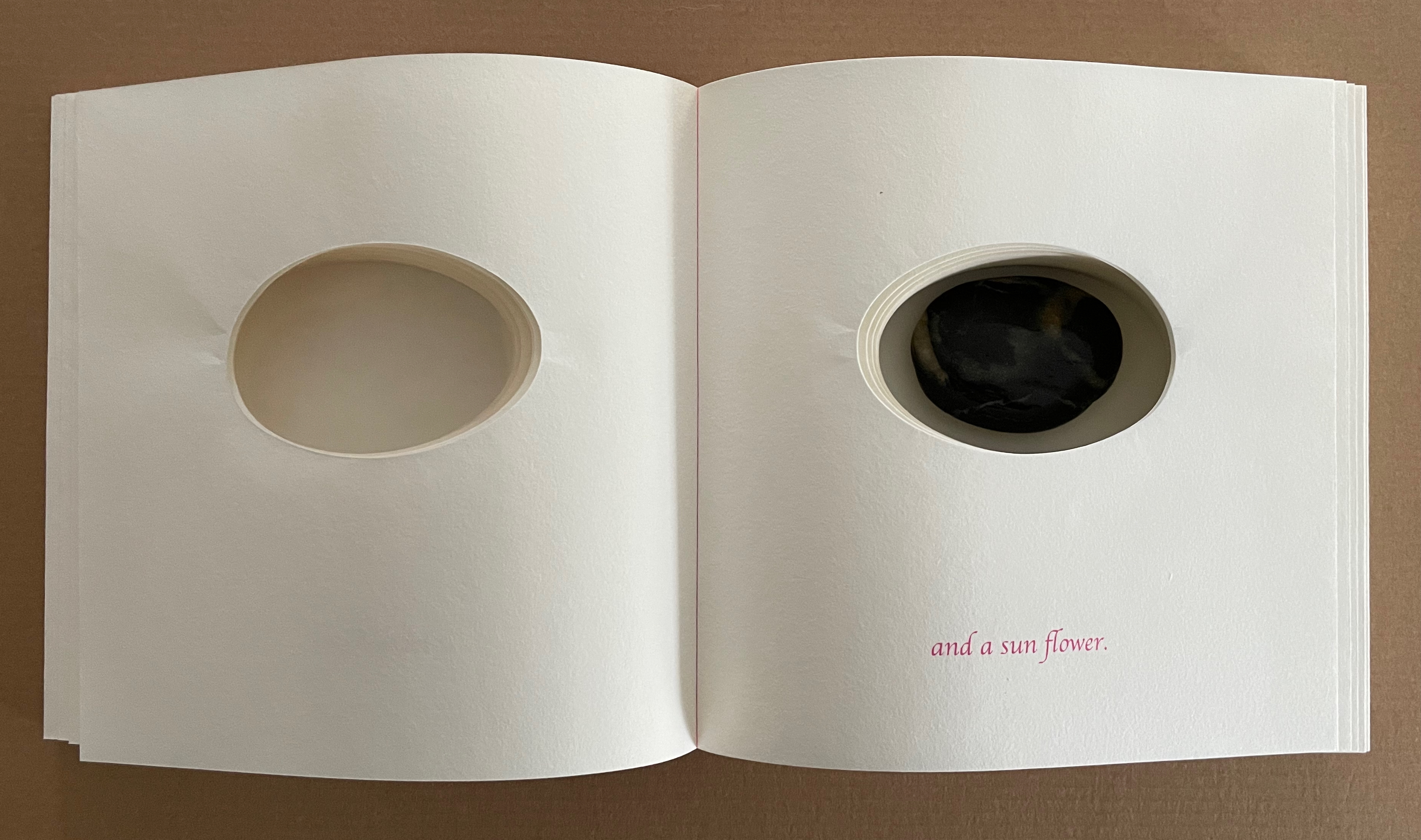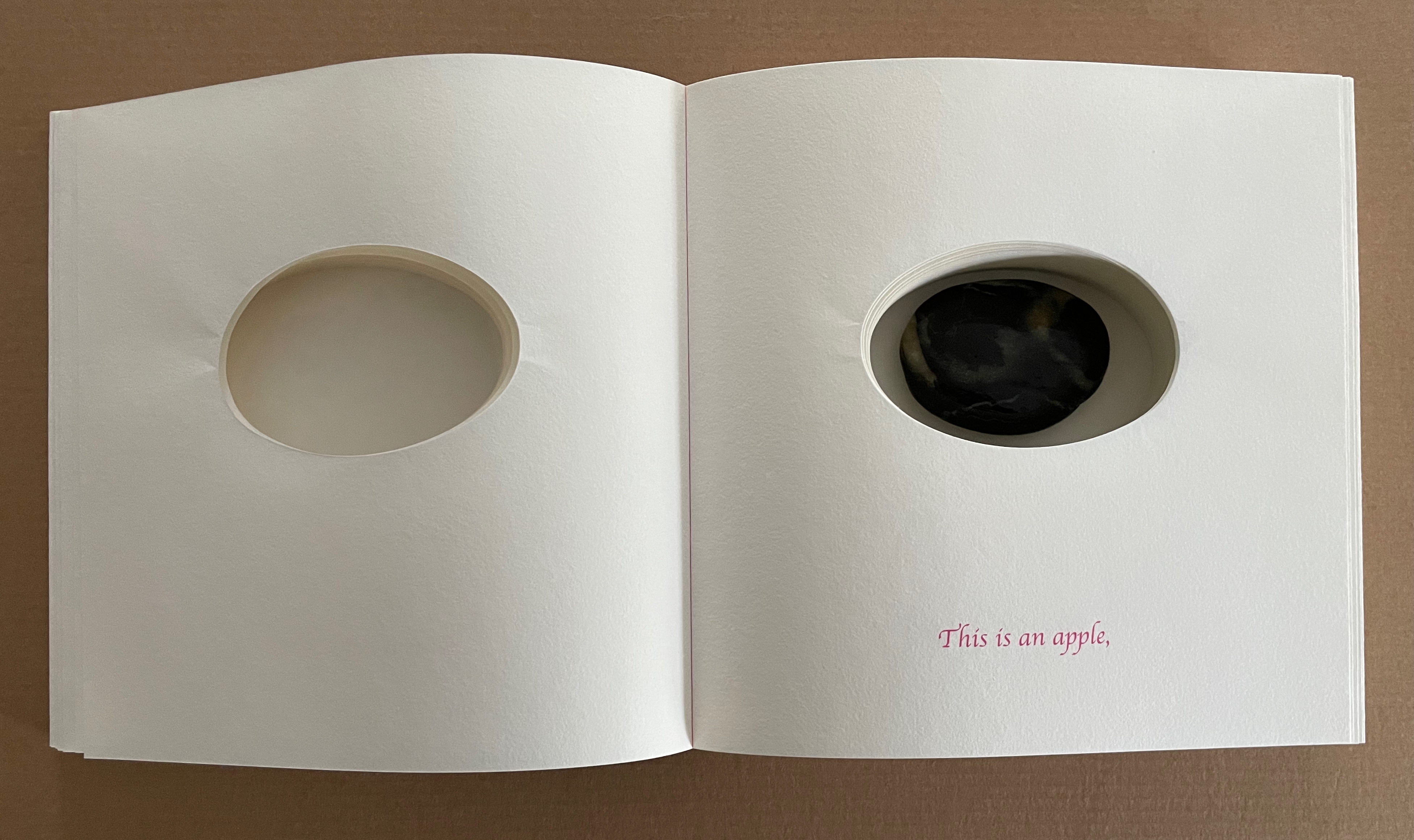 With the turn of the next two pages, it appears we are in for a series of metaphors and riddles, and something more than a three-dimensional riff on the anti-metaphor and the gap between words (symbols) and objects. First, this not-a-stone is “an apple,” but then turn the next page, and the not-a-stone is also “a sun flower”. Is there some law of commutation that applies: If not-a-stone = apple, and not-a-stone = sun flower, therefore, apple = sun flower? Because it is round, because it is vegetal?