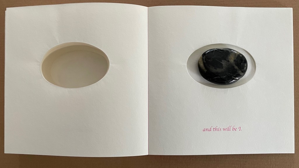 By the last page, it is as if we are playing “Twenty Questions” with the stone itself. That is, if the “I” is the stone saying, “and this will be I”. Is the stone uttering a deliberate a-grammatical union of subject (I) and object (me)? Is it a verbal visual pun (I-eye) evoking Emersonian Transcendentalism? Perhaps this stone that says “This is not a stone” is a Cretan philosopher’s stone, and round and round we will go.