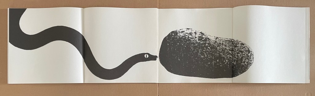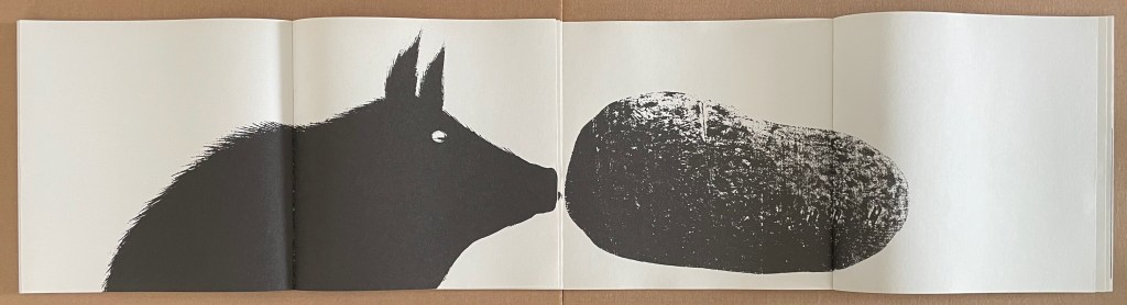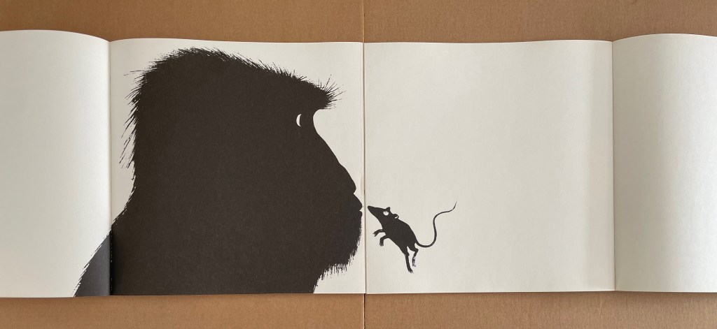 Here is another subtlety that Cho raises. The last figure in the recto book is a stone, large enough to extend over its double-page spread. No doubt it is an anthropomorphizing tendency to read something (puzzlement, curiosity, annoyance, etc.) into the silhouette of each creature confronting the stone. But it is only the stone and human that exude indifference.