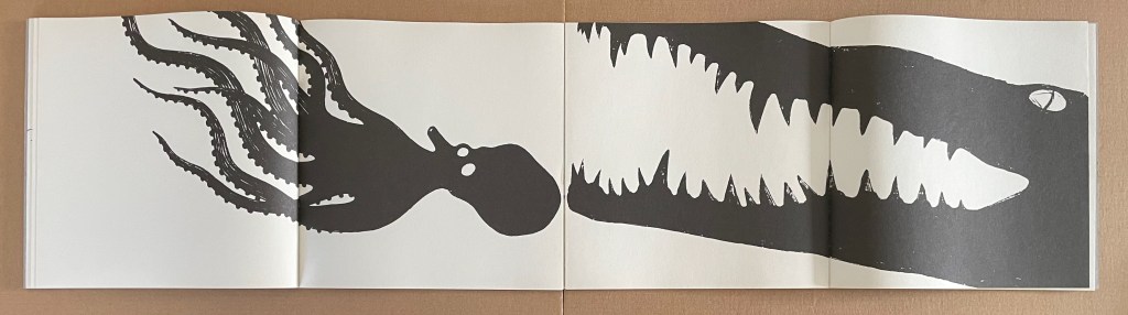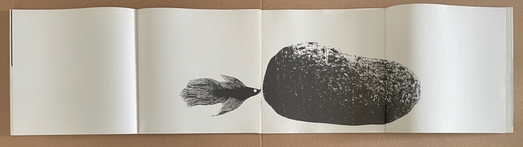 Another subtlety is the handling of the human figure. It occurs in the recto book. Like the smaller figures, it occupies a single page with a page of white behind it. It is expressionless, regardless of what it faces whether fish or lion. Oddly, the fish seems to be curious, and the lion, reserved.