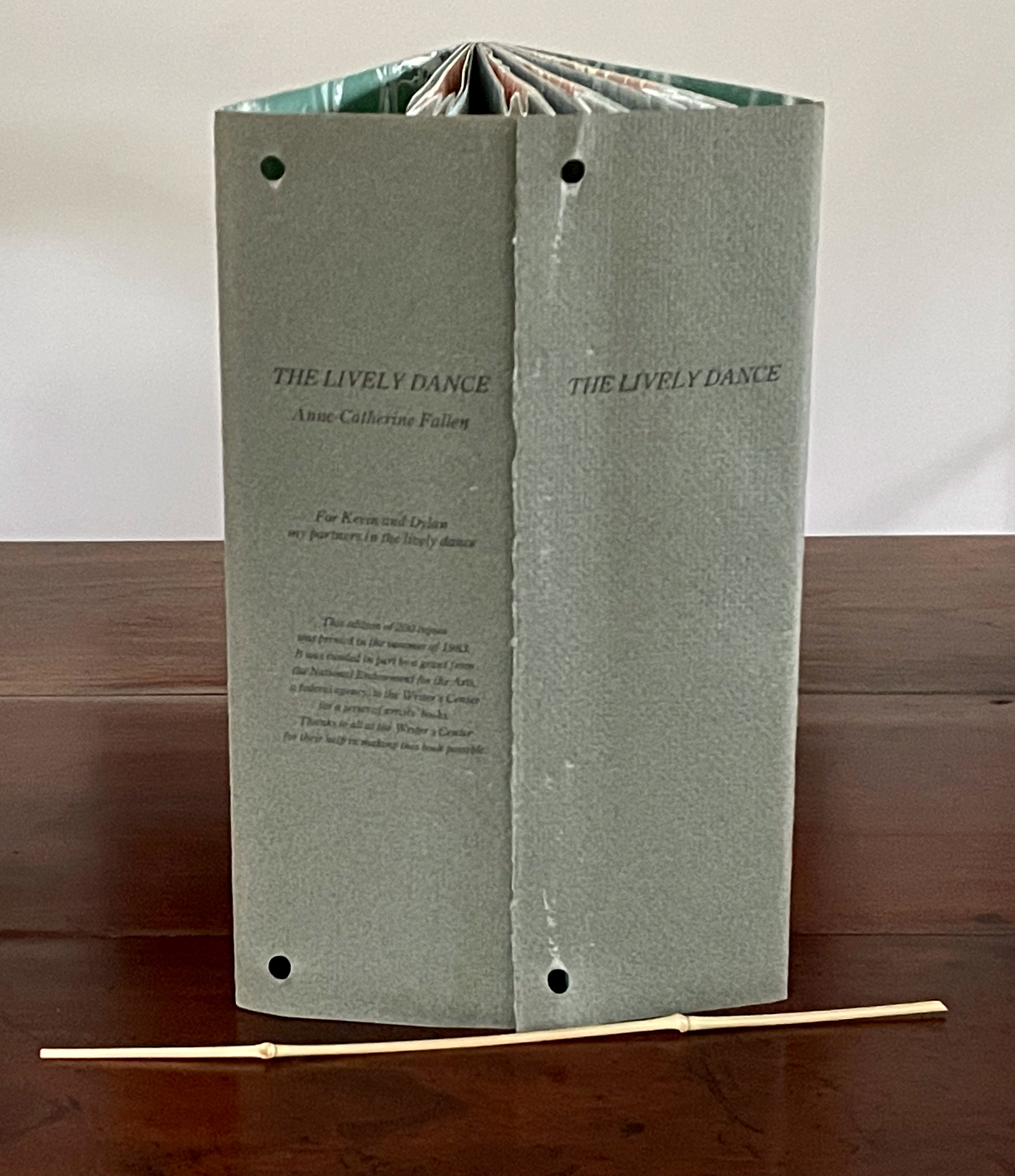 The Lively Dance is an elaborate and simple artist’s book. It consists of an eleven-line poem arranged across ten of eighteen pages displaying a stand of bamboo. Four pleated sheets of translucent paper, also displaying the stand of bamboo, overlap and bind those ten pages at the fore edge. Here is the book’s opening double-page spread with the translucent overlay first in place and then pulled back to reveal the poem’s invitation: “Come join the solemn dance”.