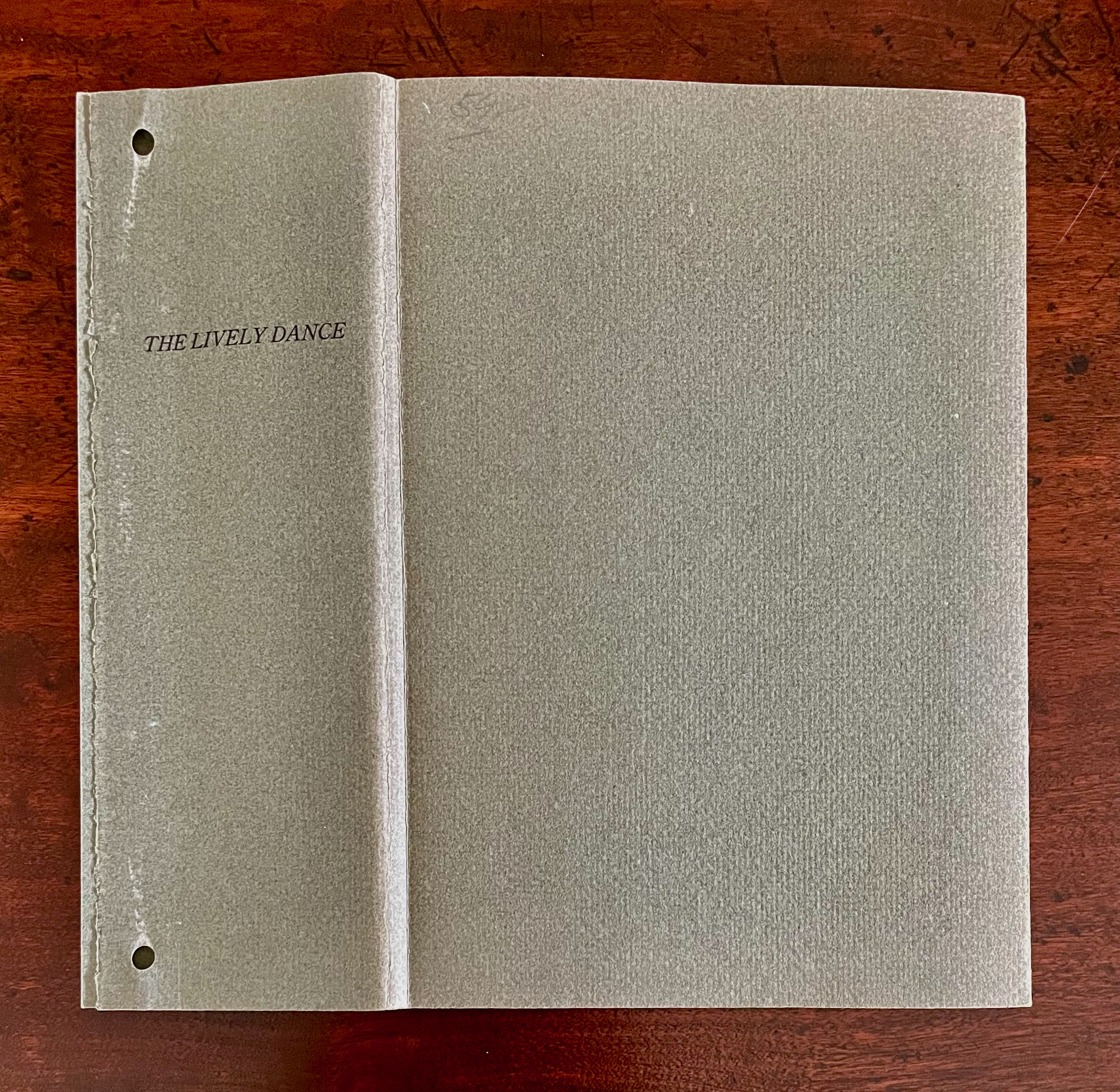 A vertical view of a grey booklet titled 'THE LIVELY DANCE' secured with a thin bamboo stick.