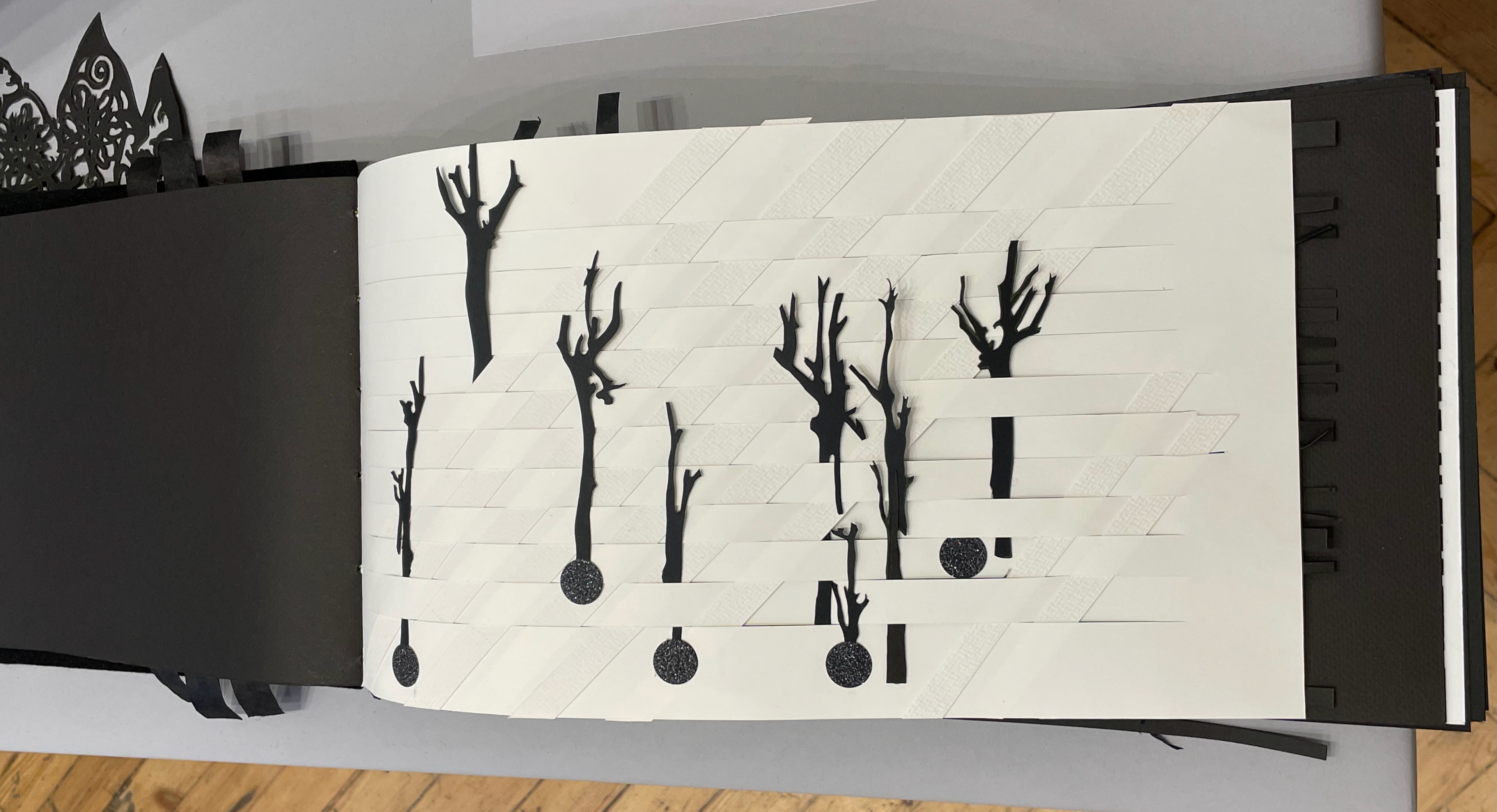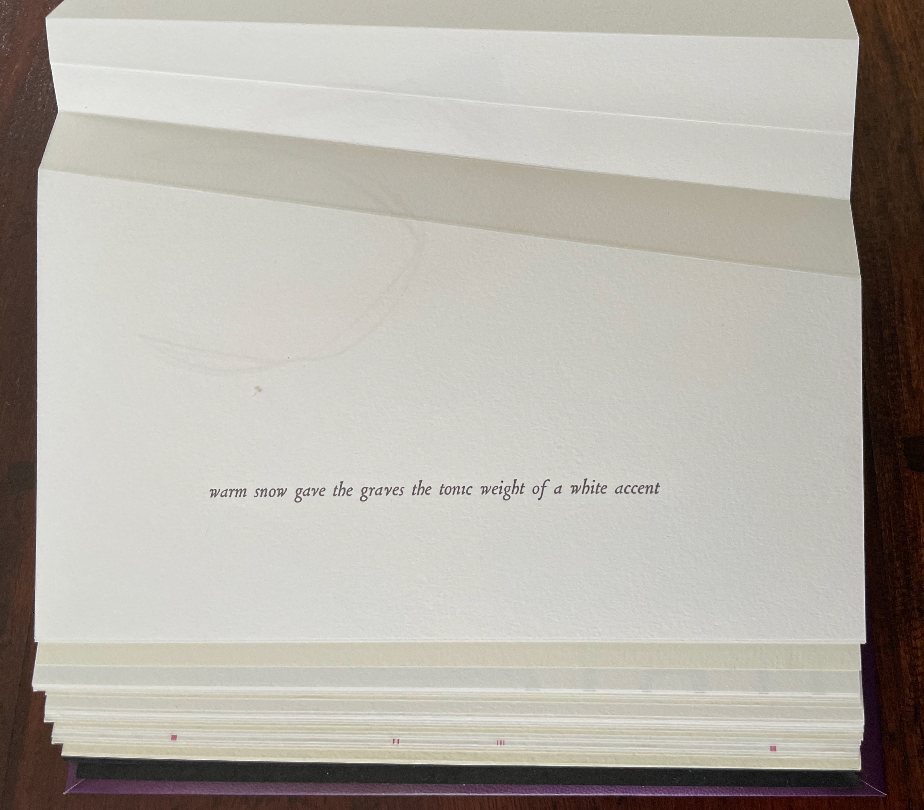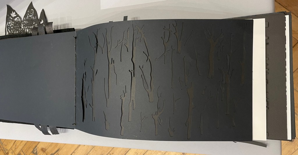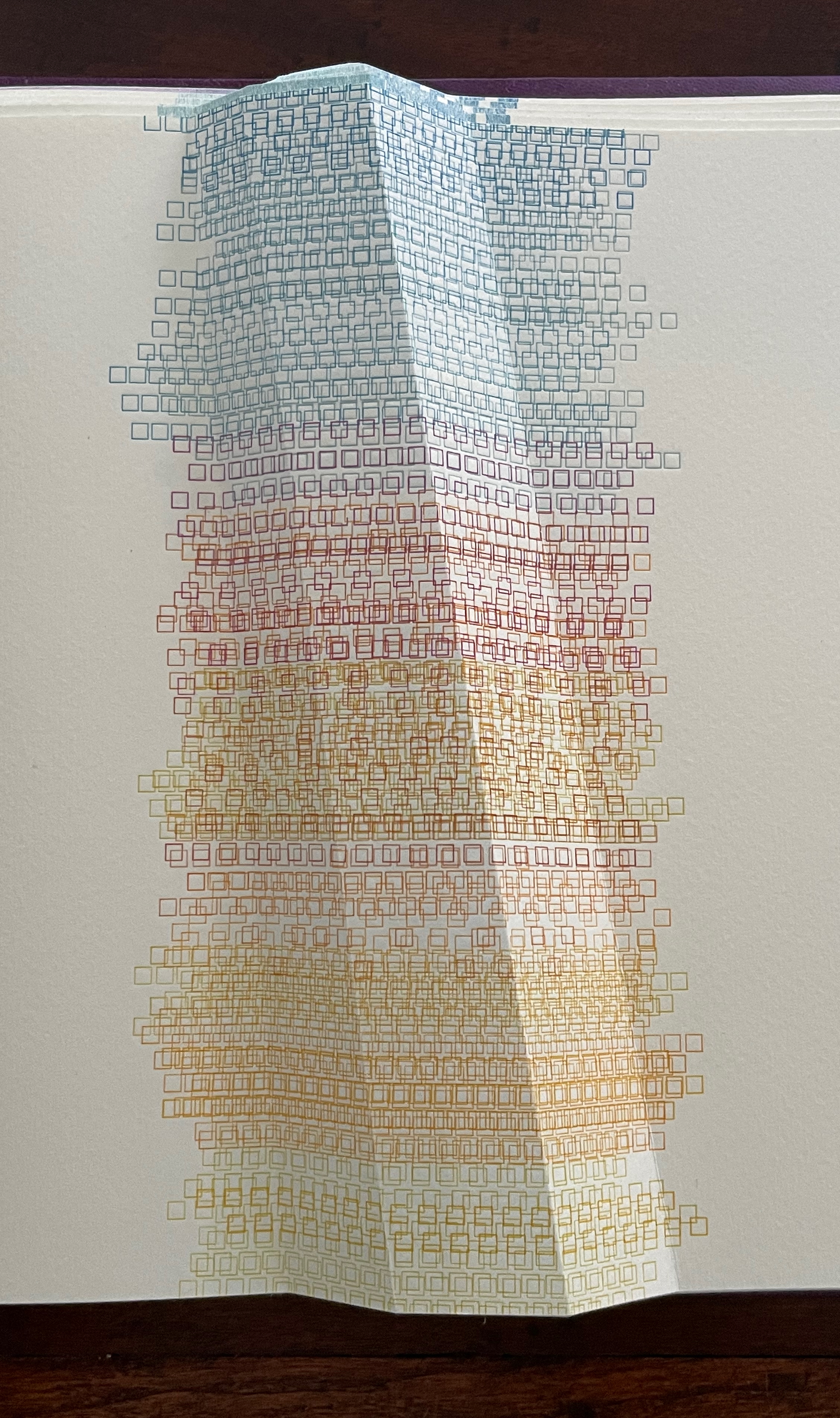 Viewed standing or lying flat, the leporello’s arranged holes echo the seeds leaving the dandelion heads bare in the second stanza of the poem.