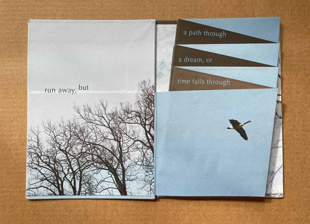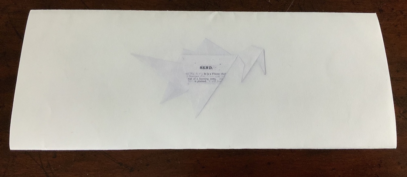 Send(2020) Marlene MacCallum and Shani Mootoo A double-sided archival digital pigment print on paper, folded and pamphlet bound in an envelope enclosure. Images, design, printing and binding by Marlene MacCallum, poem by Shani Mootoo. Dimension: 10 × 25.4 cm (closed) and 47.5 × 10 cm (expanded). #11. Acquired from Marlene MacCallum, 26 October 2022. Photo of the work: Books On Books Collection.