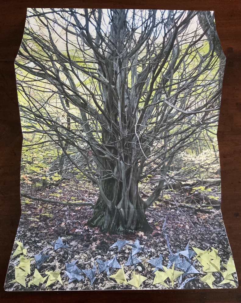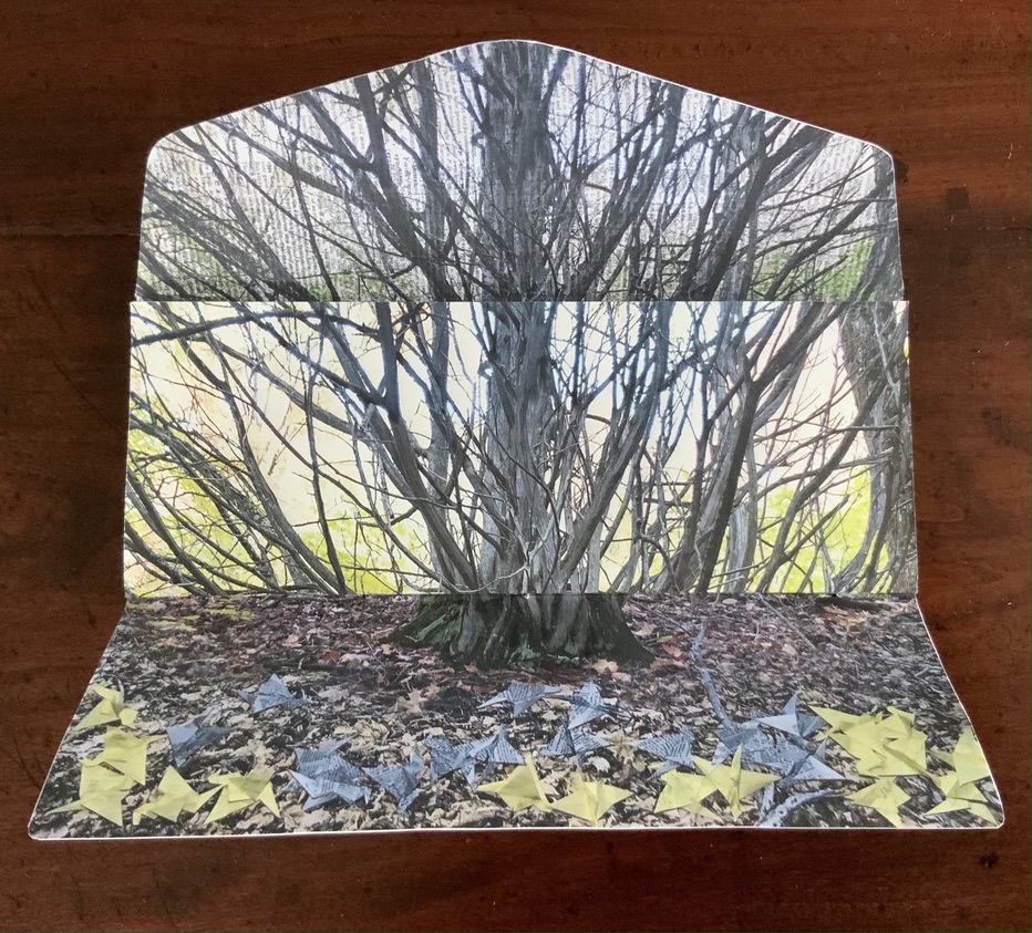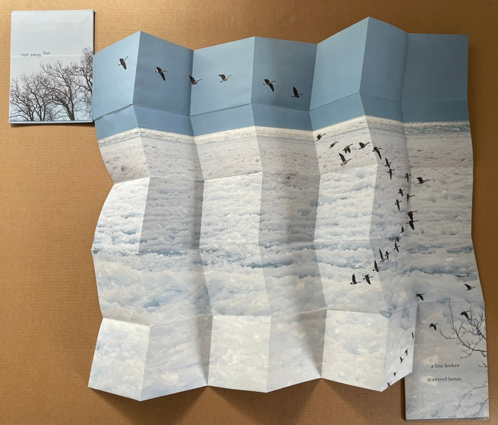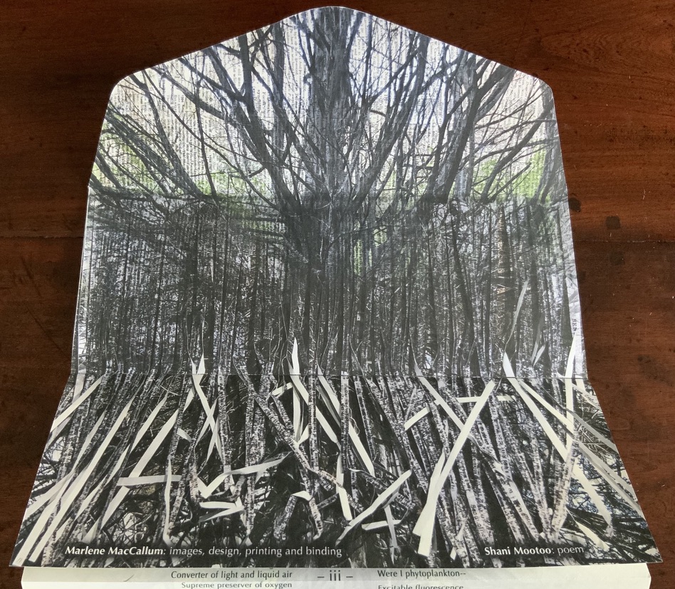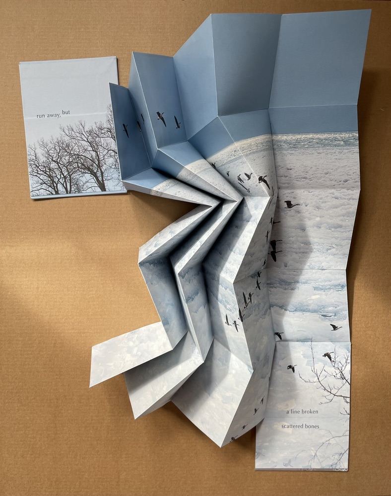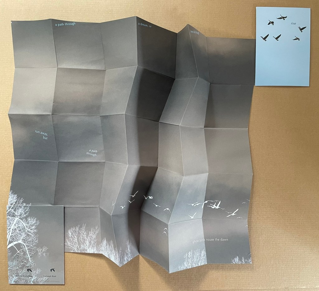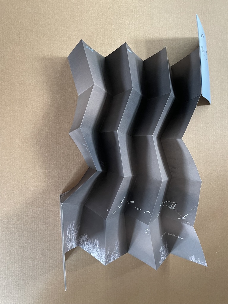 Artists’ statement: Rise is a collaborative artwork by Marlene MacCallum and Deborah Root. This piece grew out of discussions about our shared fascination with the implications and meanings of the fold. The images and poem evolved through a call and response process, sharing them back and forth. The miura fold structure was selected early on for its structural strength and the way it allowed us to take a seemingly small object that expanded quite surprisingly to reveal a large field of imagery and poetry.
