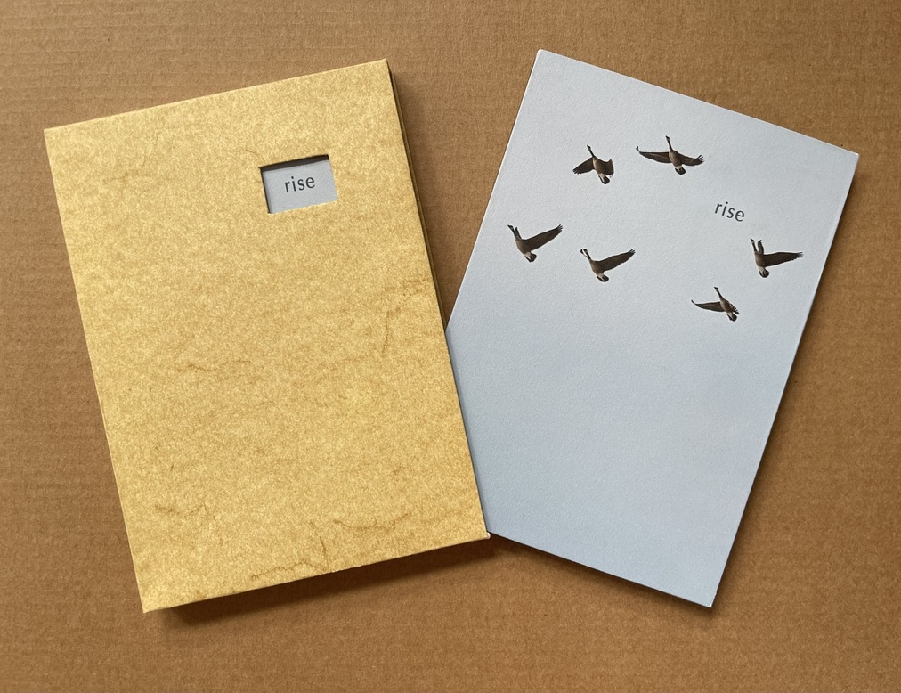 Rise(2020) Marlene MacCallum and Deborah Root Slipcase enclosure with passe-partout showing title. Double-sided folio in miura fold between two boards. Printed paper over boards. Slipcase H135 x W97 mm. Double-sided folio H133 x W93 mm (closed), W483 × H633 mm (open). Acquired from Marlene MacCallum, 26 October 2022. Photos of the work: Books On Books Collection.