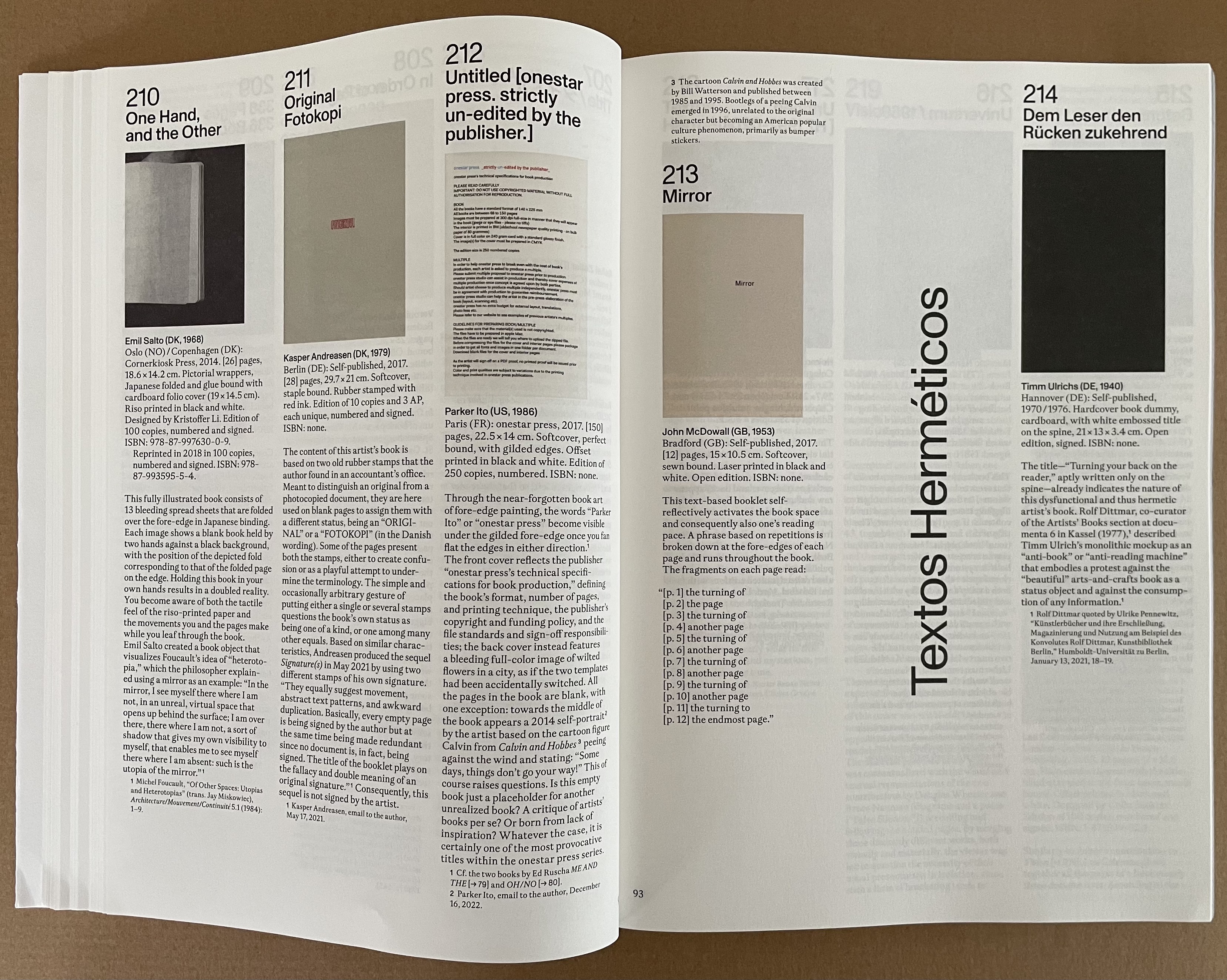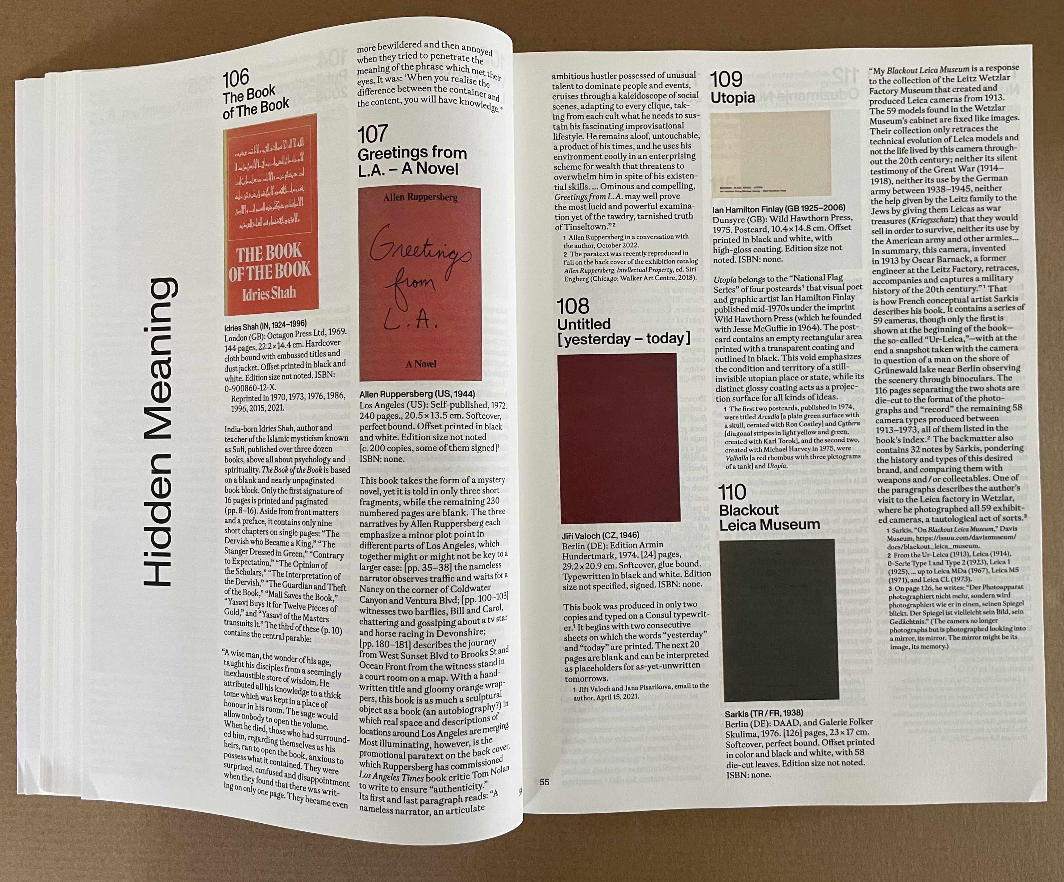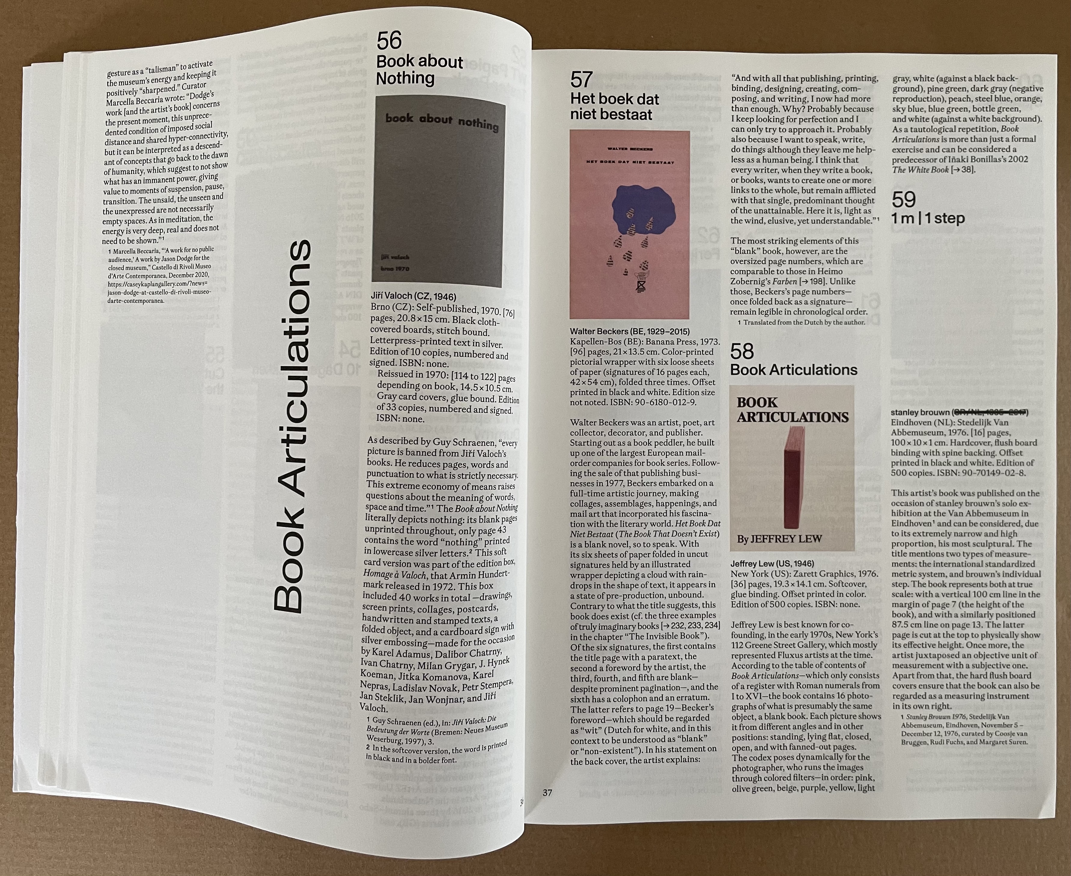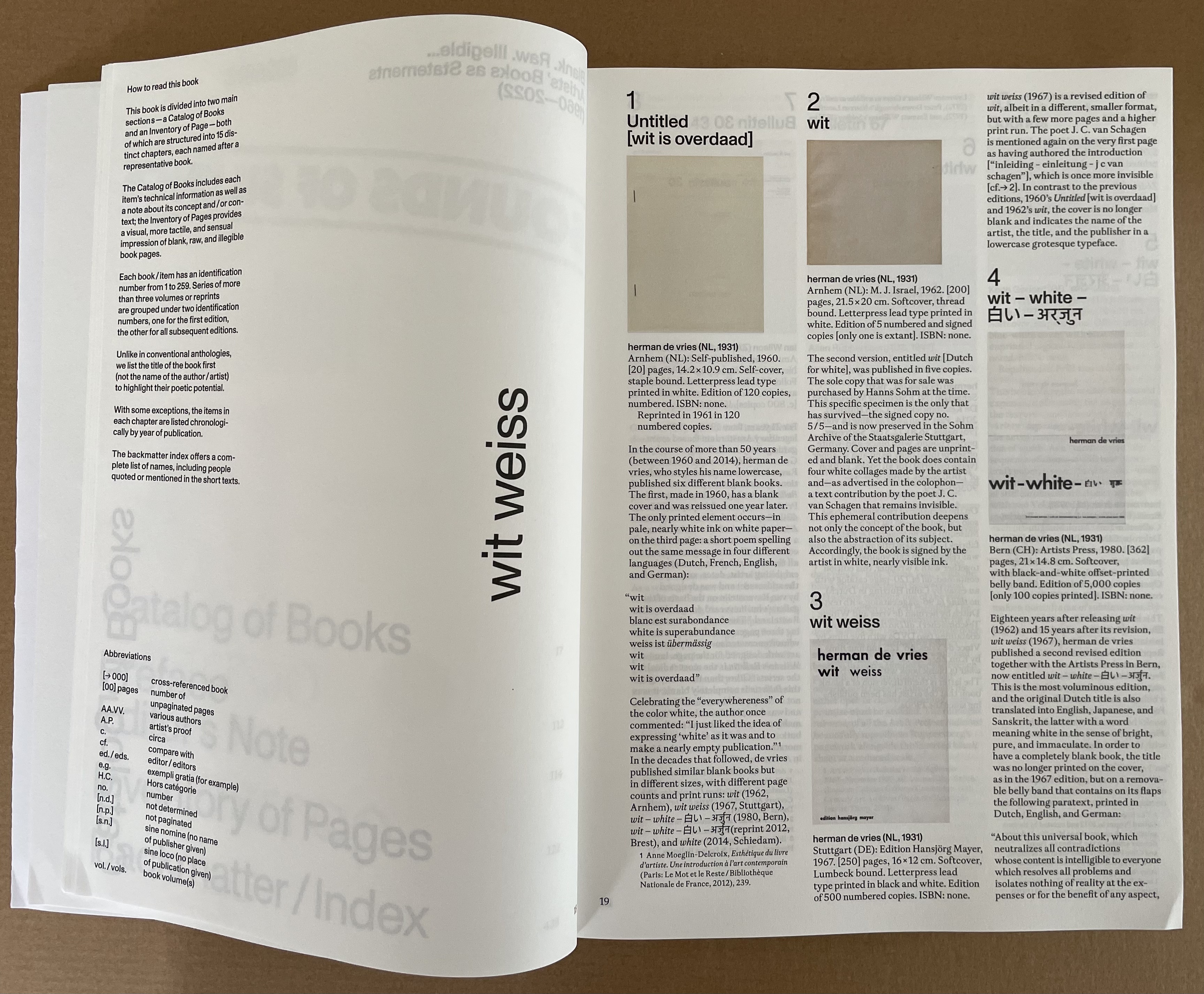 “wit weiss” takes its title from the third of six blank-page works by herman de vries. In addition to cataloging the other five, the section presents sixteen other variations on the theme, including Christiaan Wikkerink’s Conceptual Art for Dummies (1968, 1977, 2010).