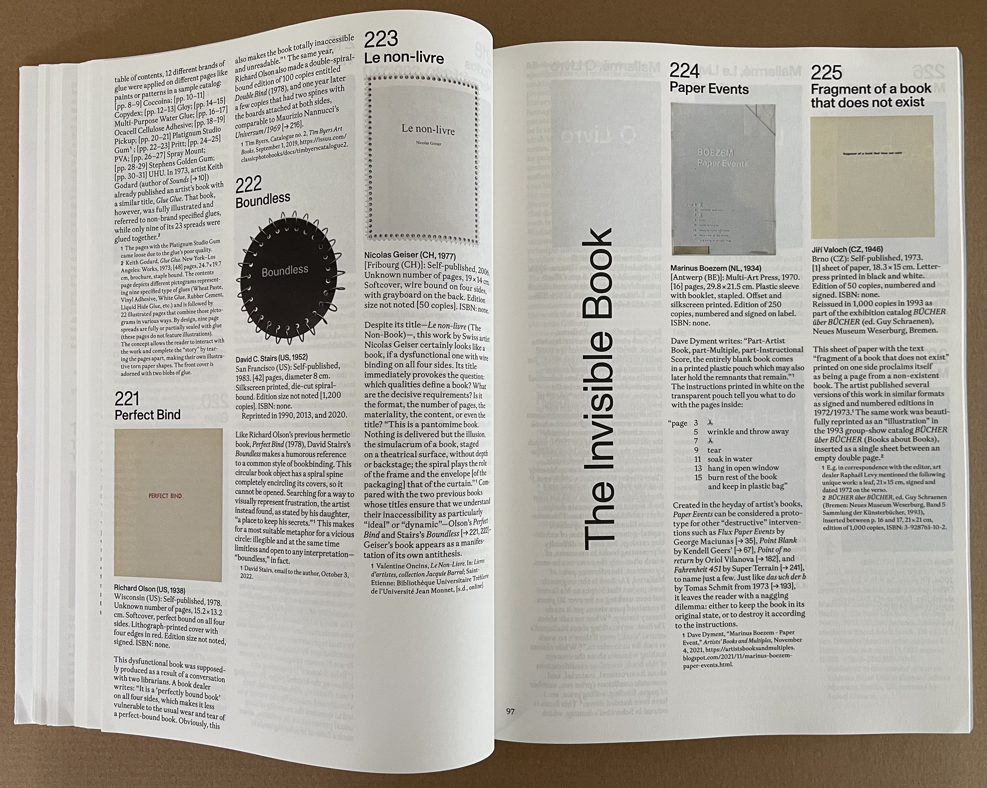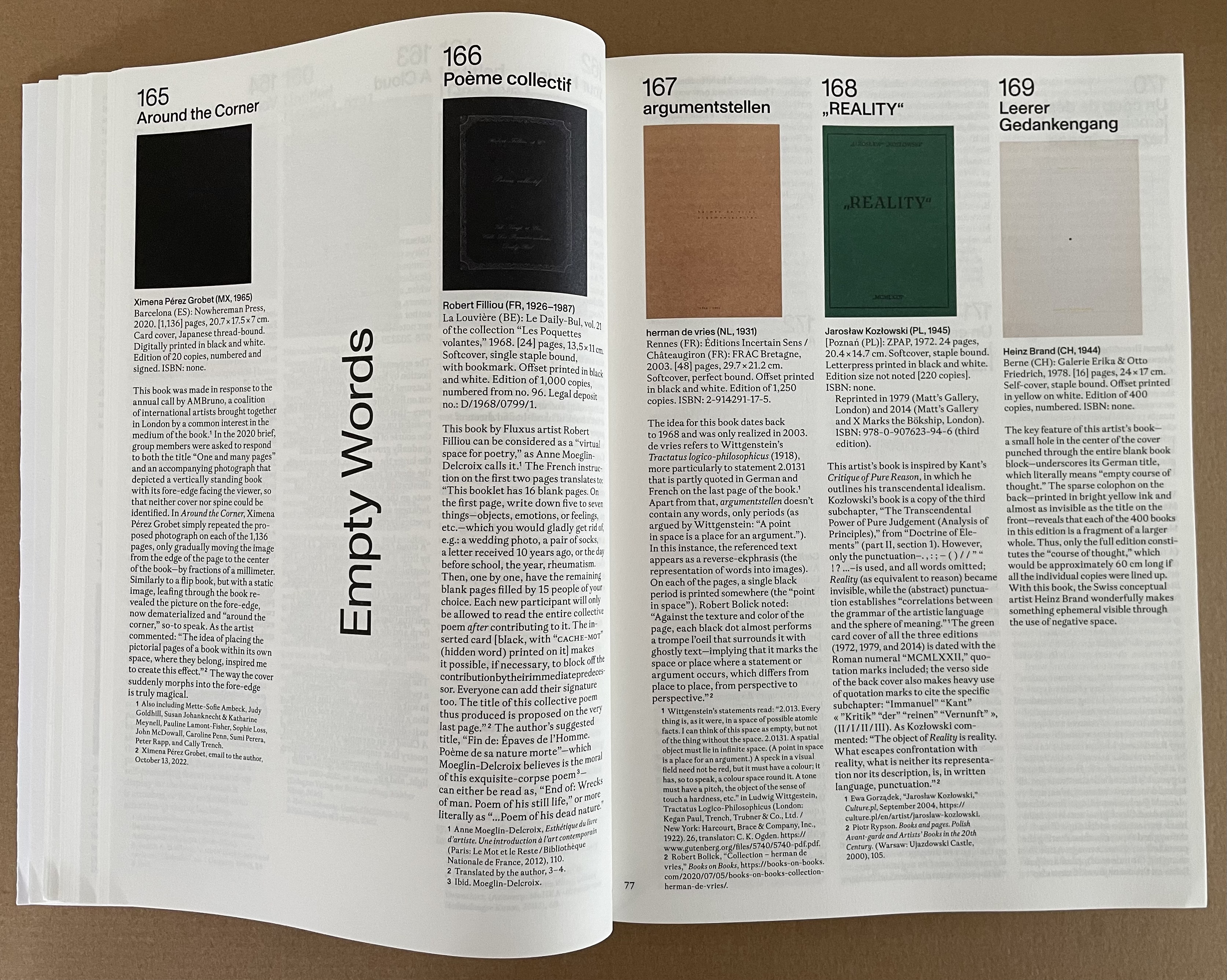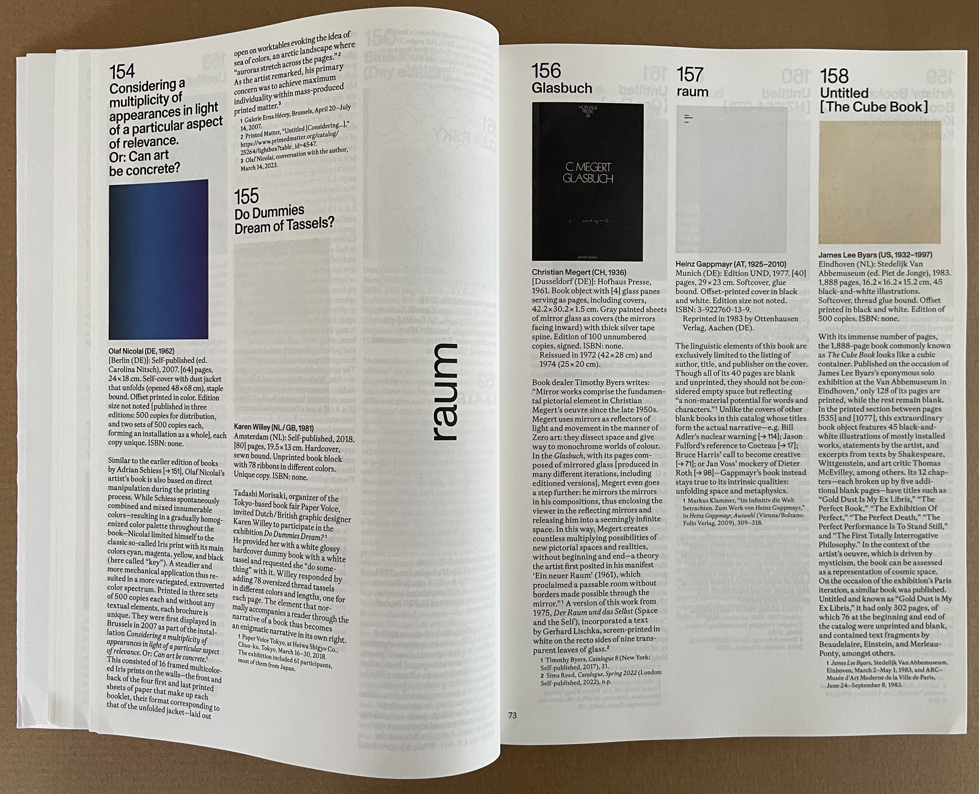 Published on the occasion of the exhibition by the same name at the Leopold-Hoesch-Museum in Düren, Germany, this tome is far more than an exhibition catalogue. With its thematic structure being a form of commentary on and insight into 259 individual works of 200 book artists, Blank. Raw. Illegible becomes one of the more important reference works on book art to have appeared in the last five years. And this is despite its singular focus on artists’ books blank (most of them), inacessible, or illegible.