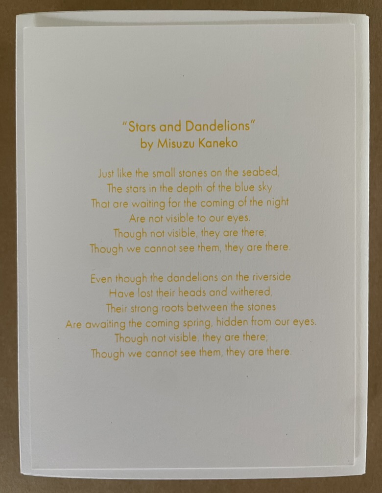 Spirit is accompanied by the 20th century poet Misuzu Kaneko‘s poem “Stars and Dandelions” (in English and Japanese) from which Tamabayashi has taken her inspiration.
