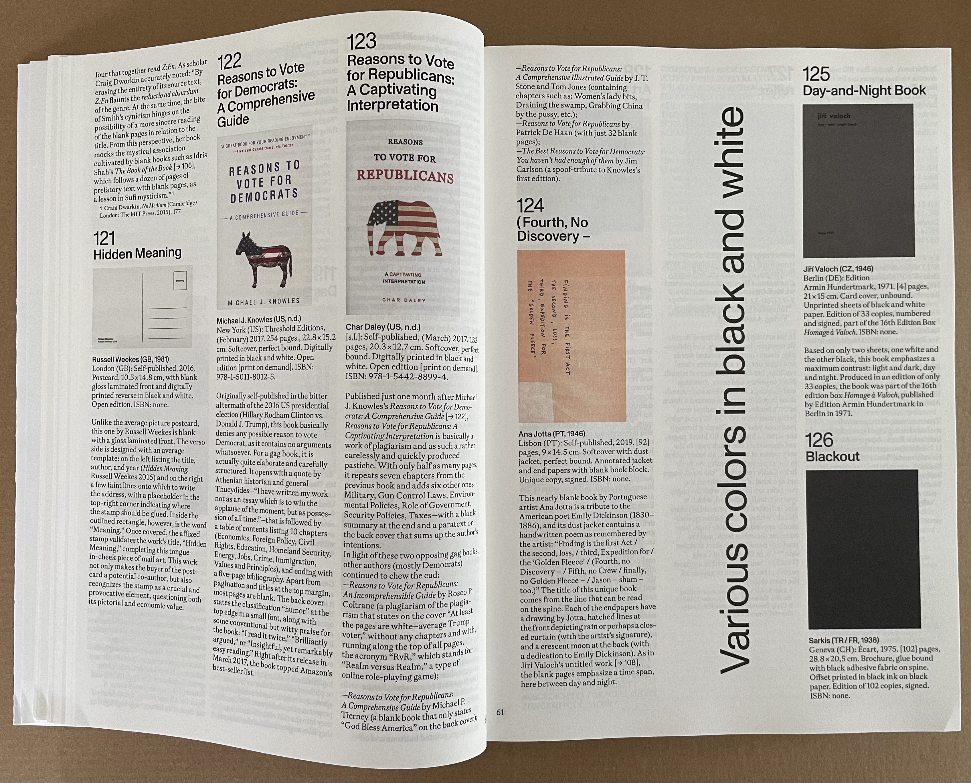 Some of the blank works in “Hidden Meaning” play the joke of being the answer to the title, such as Reasons to Vote for Republicans (2017), a plagiaristic response to Michaels Knowles’ Reasons to Vote for Democrats (2017), published one month before. Other require the reader to uncover the hidden meaning (as in Christian Boltanski’s 2002 Scratch, which reveals images of atrocities when the surfaces of its silvered pages are scratched off) or to hide meaning (as in Russell Weeke’s 2016 blank postcard Hidden Meaning, which has only those words printed in the block where the stamp goes.