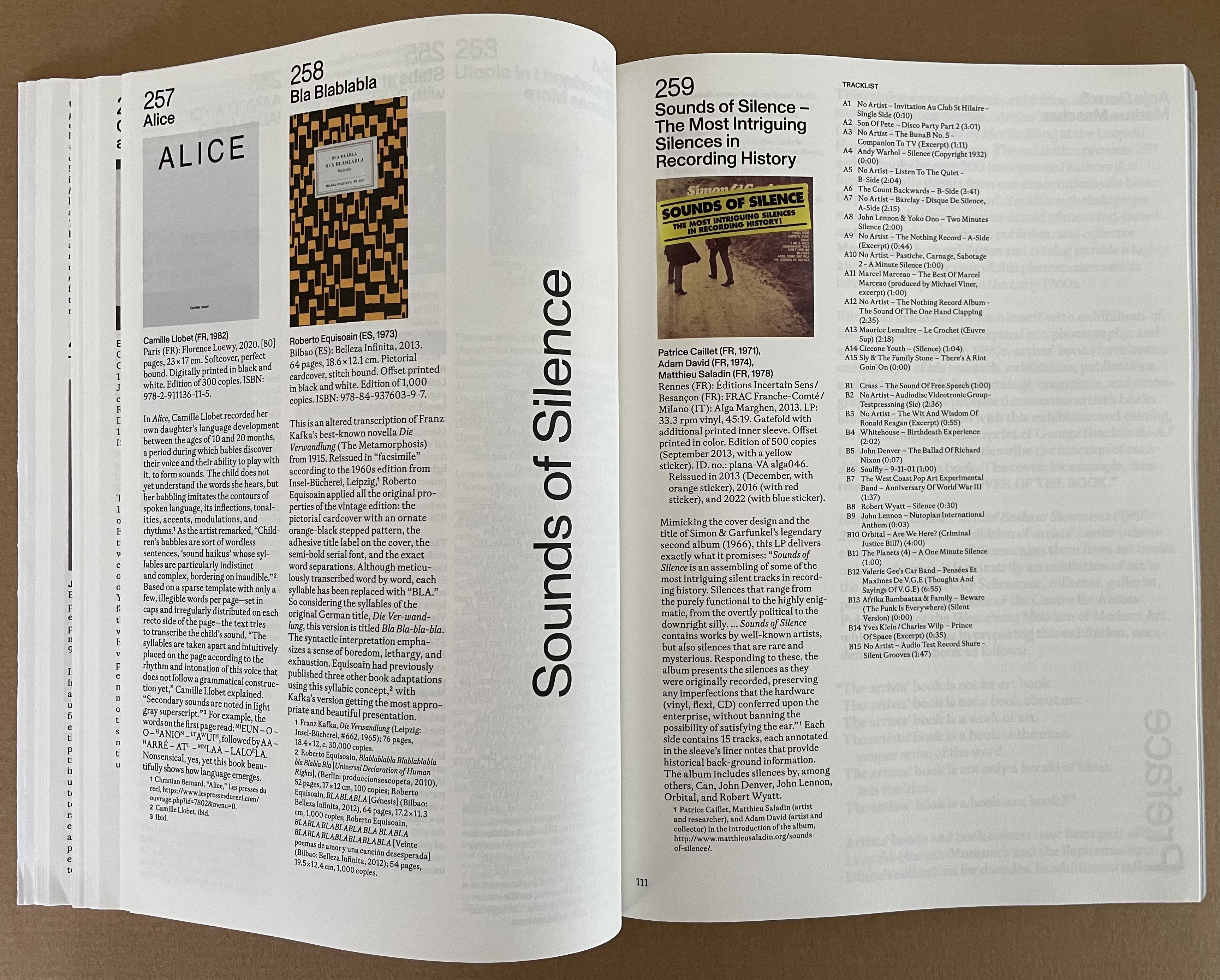 The blank books of “life and work” demonstrate subtleties ranging from Paul Heimbach’s careful inclusion of 273 clear sheets to allude to the 273 seconds of John Cage’s 4’33” (1972) to Arnaud Desjardin’s Why I am no longer an artist.