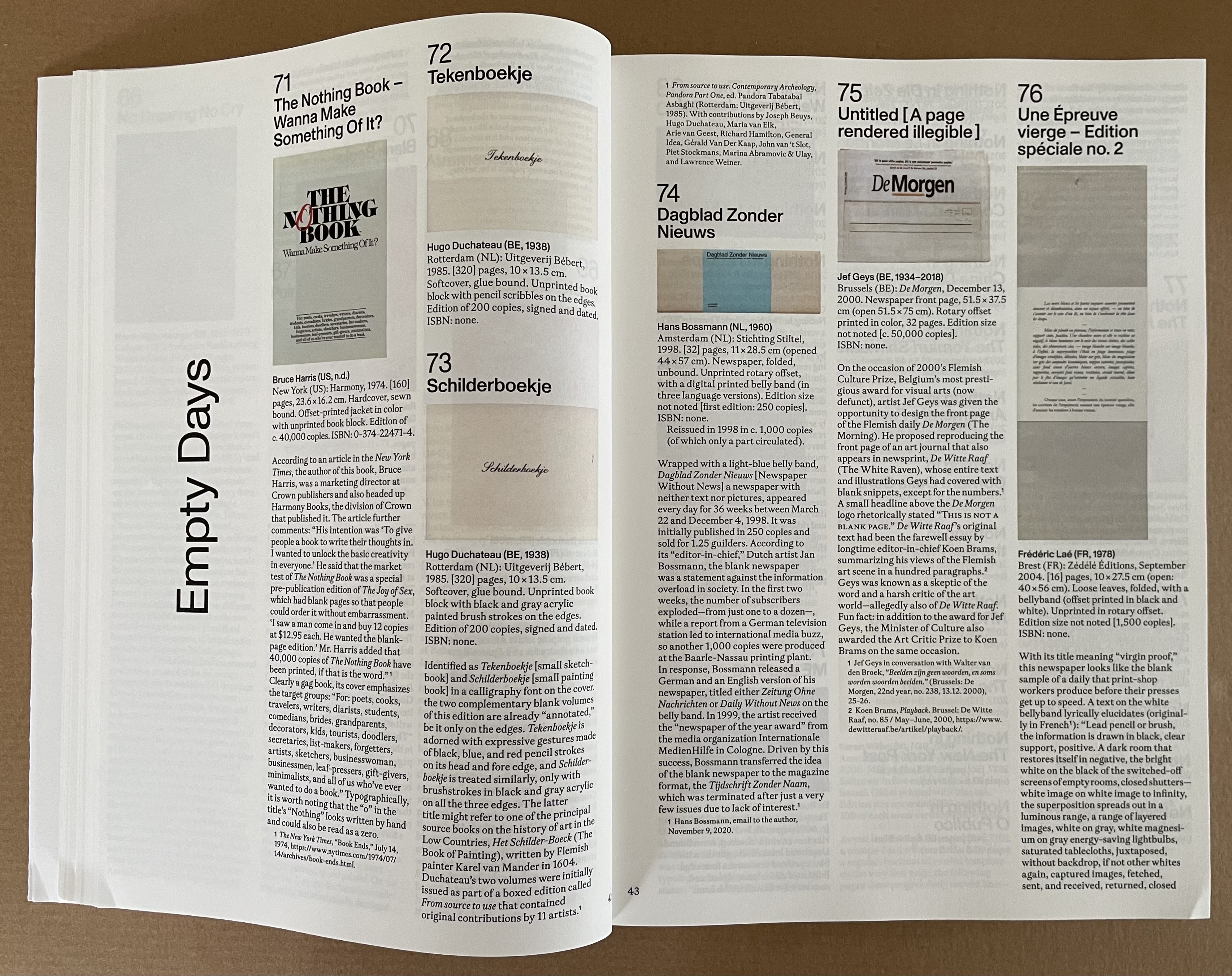 “Empty Days” takes its title from the last work in the section, a volume offered as an annual planner whose pages are blank, its months distinguished by different makes of paper, and its bookmarker printed on both sides with reminders of the names of the days and months. Leading with Bruce Harris’ gag book The Nothing Book, the section follows applications of the blank joke to newspapers, notebooks, exercise books, chronicles, and advice books.