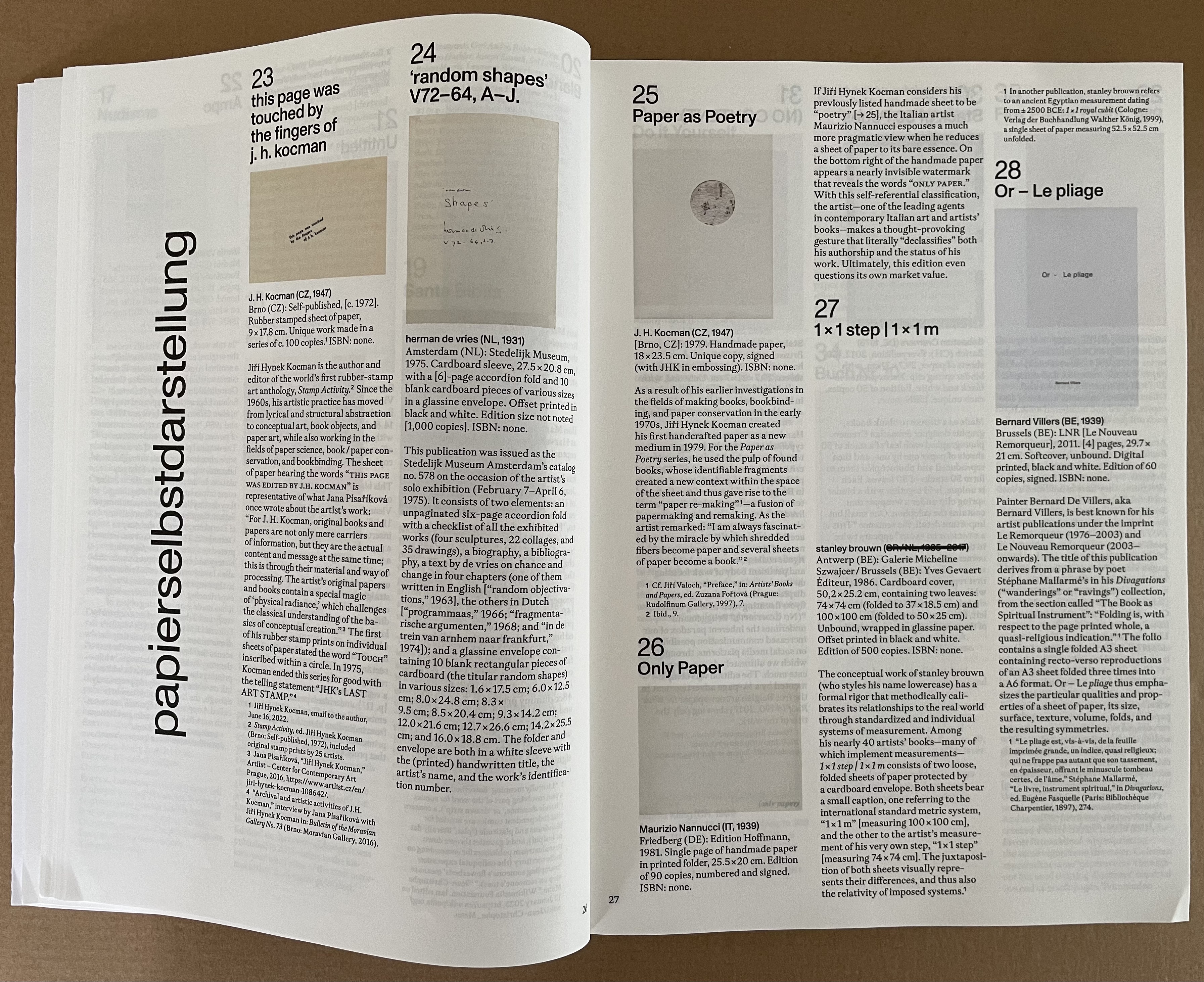“papierselbstdarstellung” presents us with thirty-three works of “paper self-portrait”. Blank or not, paper takes the conceptual and physical center stage in this section. It’s a pleasure to see the two rare works from the 1970s by J.H. Kocman introducing this group that includes another of herman de vries’ works, one of Bernard Villers’ Mallarméan pieces, some of the output of the prolific polymath Julien Nédélec, a unique piece from Paul Heimbach, Richard Long’s dipped River Avon Book, and more paper-allusive papierselbstdarstellungen.