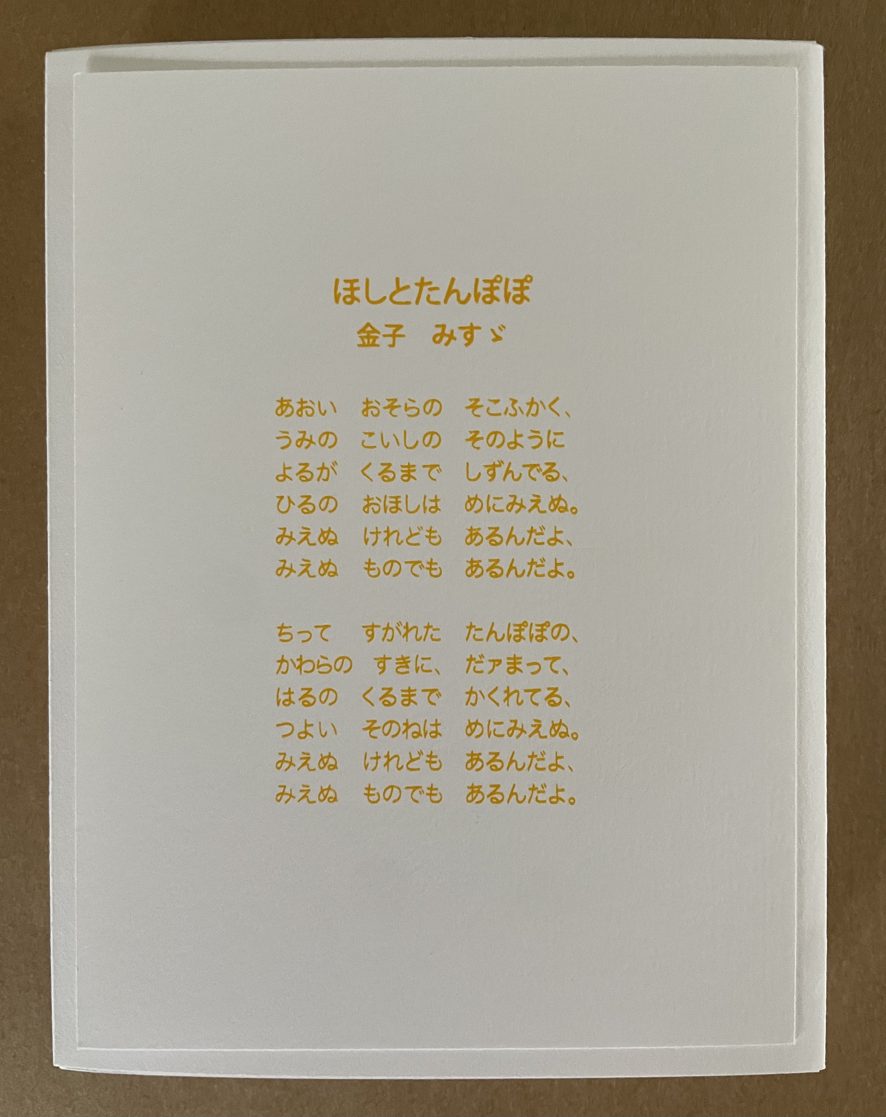 Like Misuzu Kaneko’s poetry, Chisato Tamabayashi’s artwork appeals to children and adults, underscoring the link between children’s books and artists’ books explored so well by the Huberts in The Cutting Edge of Reading, Johanna Drucker in “Artists’ Books and Picture Books”, and Sandra Beckett in Crossover Picturebooks.
