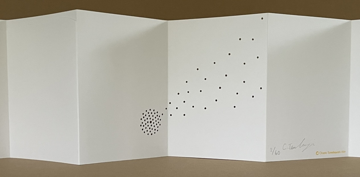 Chisato Tamabayashi’s leporello Spirit departs from her usual paper-engineering techniques. It relies on hole punching, paper sculpture, and display with light. Her crossover in techniques will remind close observers of Katsumi Komagata’s movement from Little Tree/Petit arbre (2008) to「Ichigu」(2015).