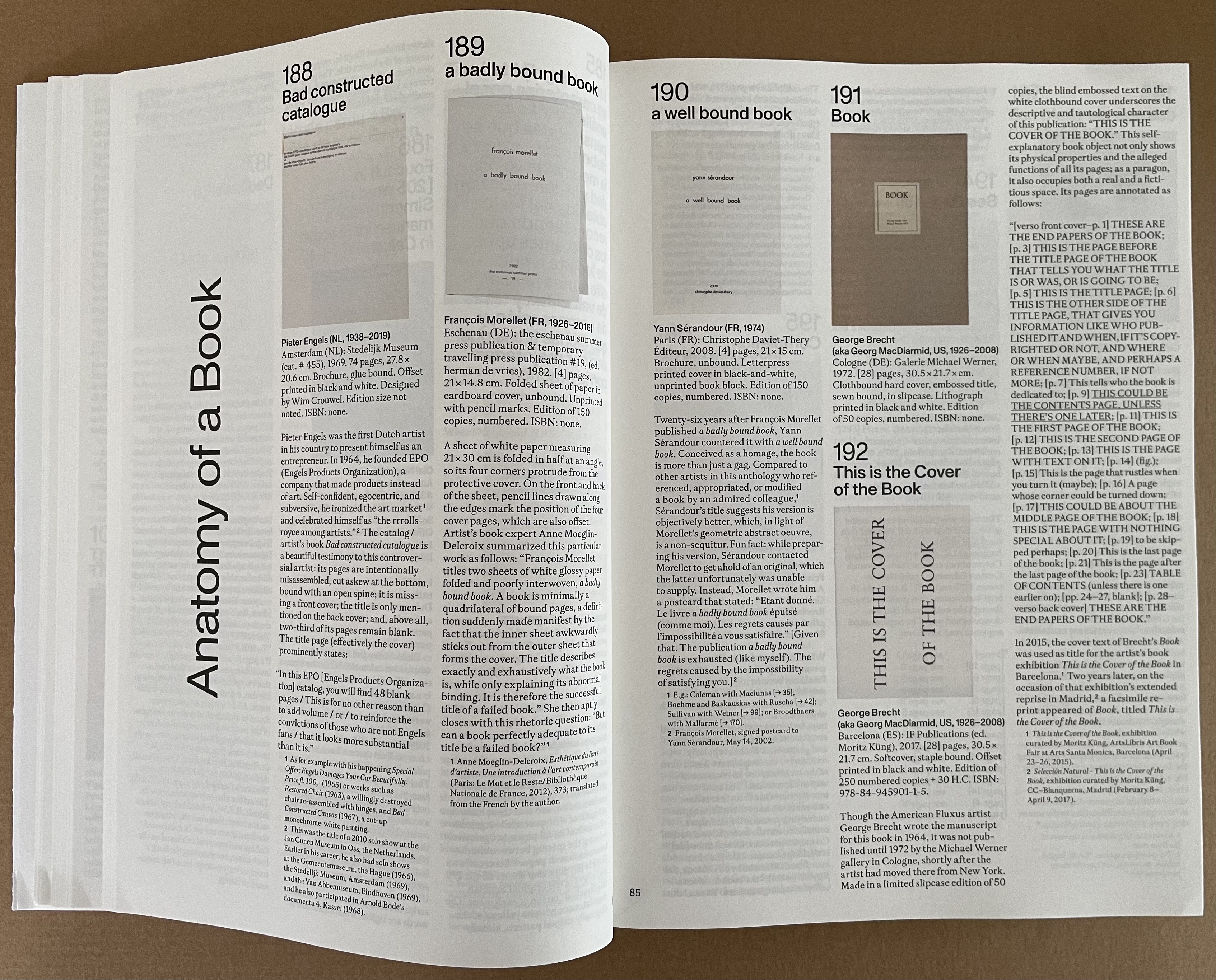 “Anatomy of a Book”, whose title comes from the 2010 unique work by Fiona Banner (aka The Vanity Press), reminds us of how book artists can create works of art by focusing attention on individual parts of the book or simply naming its parts as George Brecht did with This is the Cover of the Book (1972).