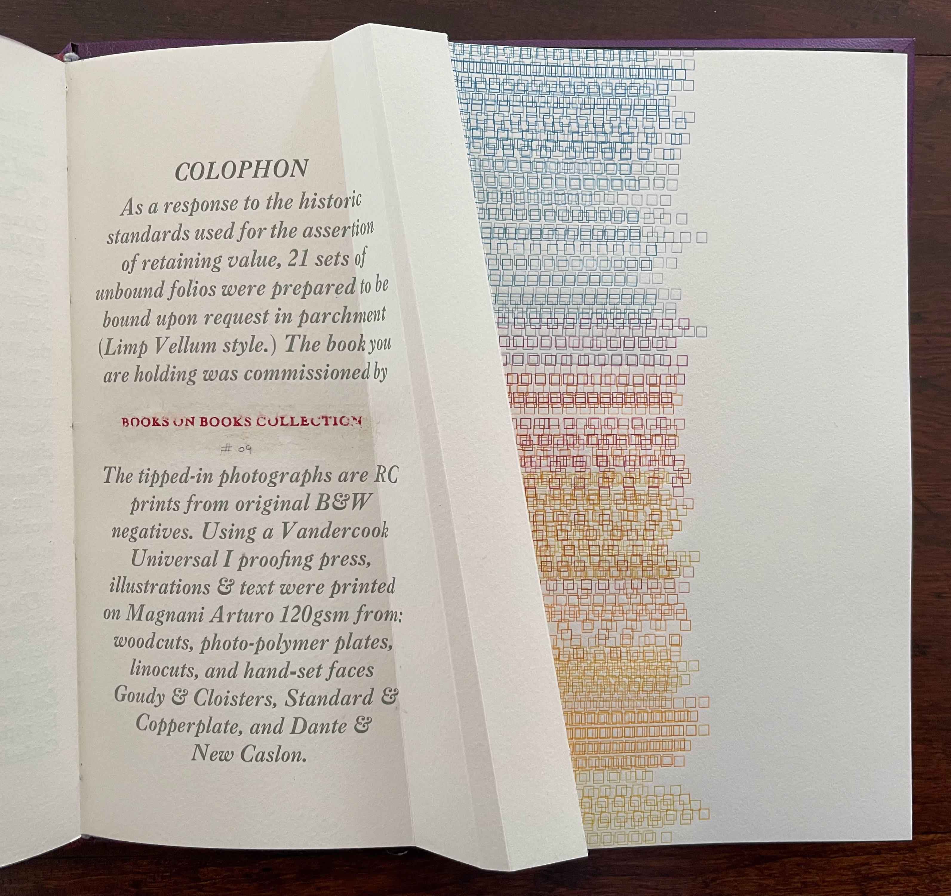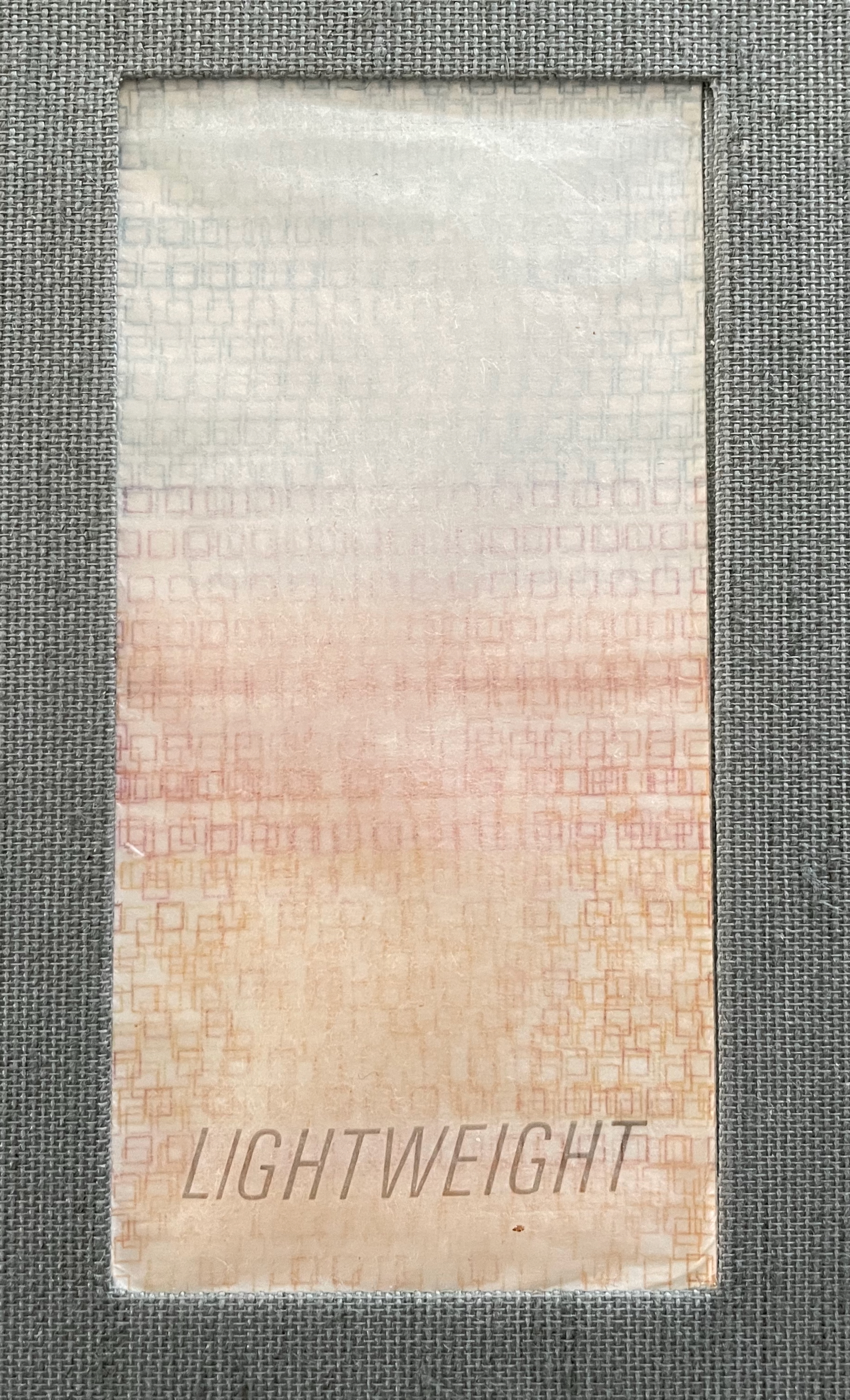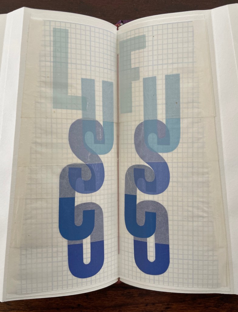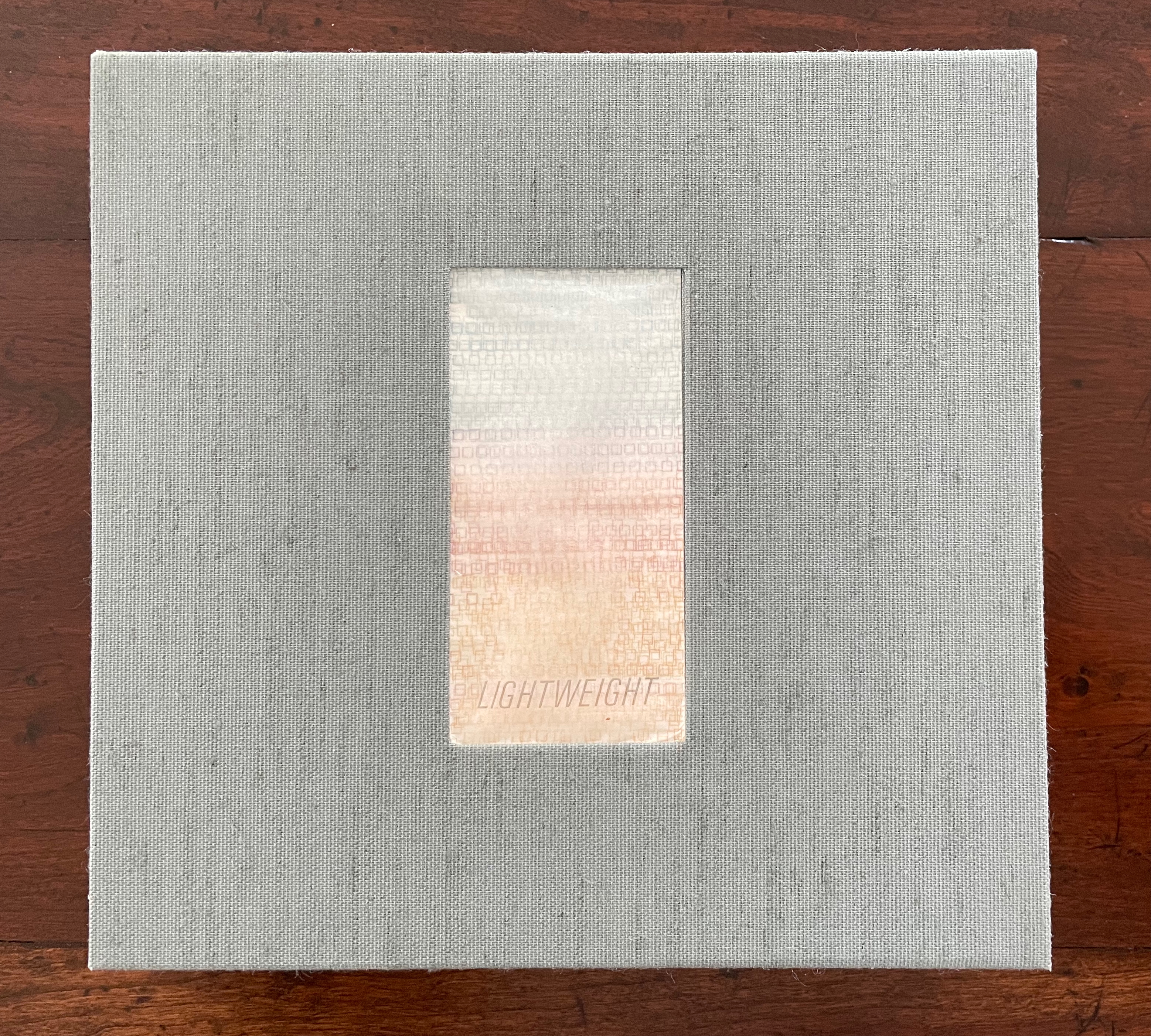 That strata of links running from blue to rust to gold becomes a recurrent print motif in the book, suggesting abstractly another metaphor: that of a continuum with endpoints playing off one another. As soon as you pick up the Canapetta cloth-covered box, the title itself — Lightweight — sets in motion a fresh instance of this continuum metaphor. Floating above the recurrent print motif, the title contrasts with the weight in your hands. As if to underscore this diametric contrast, the corners of the top and bottom of the box sit flush at the ends of one diagonal but gap at the other, easing the lifting of the weighted top from the box.