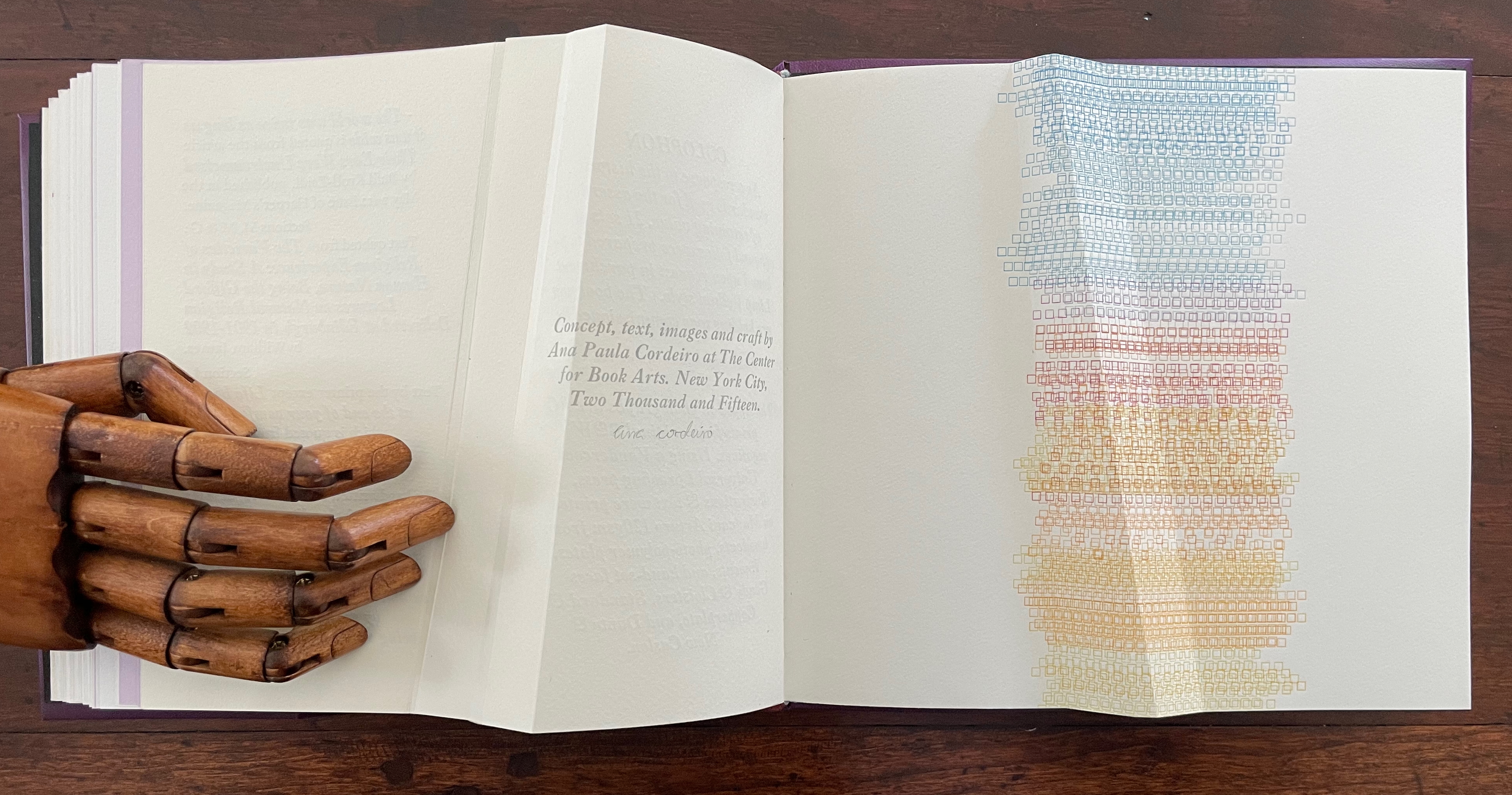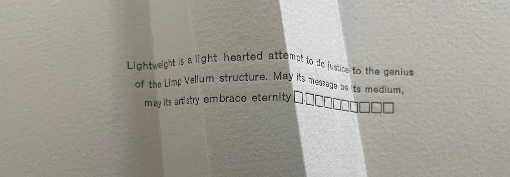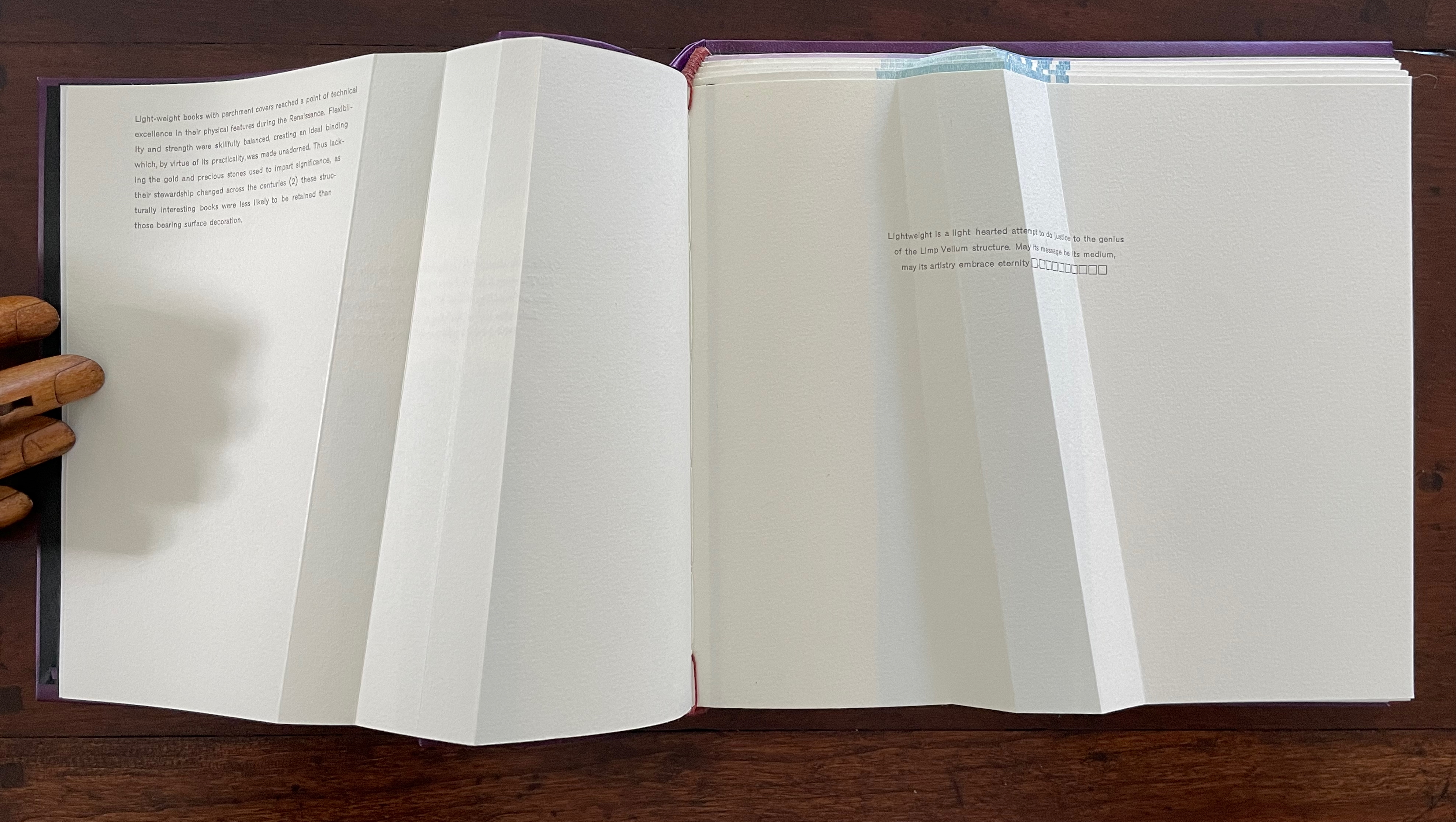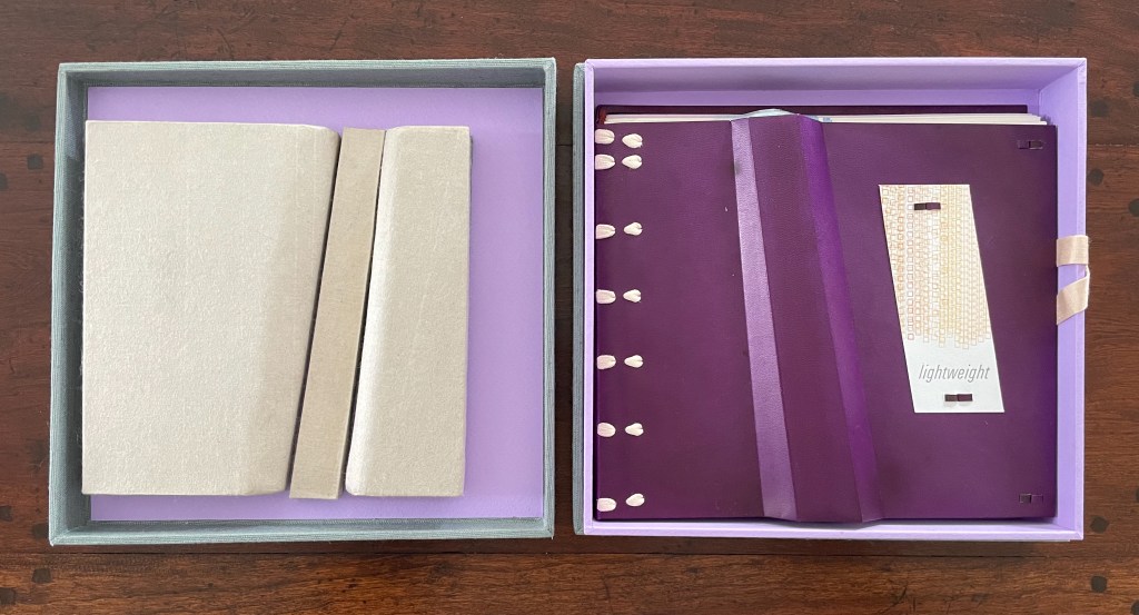 Ana Paula Cordeiro’s Lightweight is an artist’s book that pays elaborate homage to this distinctive form of binding. It weaves together metaphor, structure, material, and content in extraordinary ways.