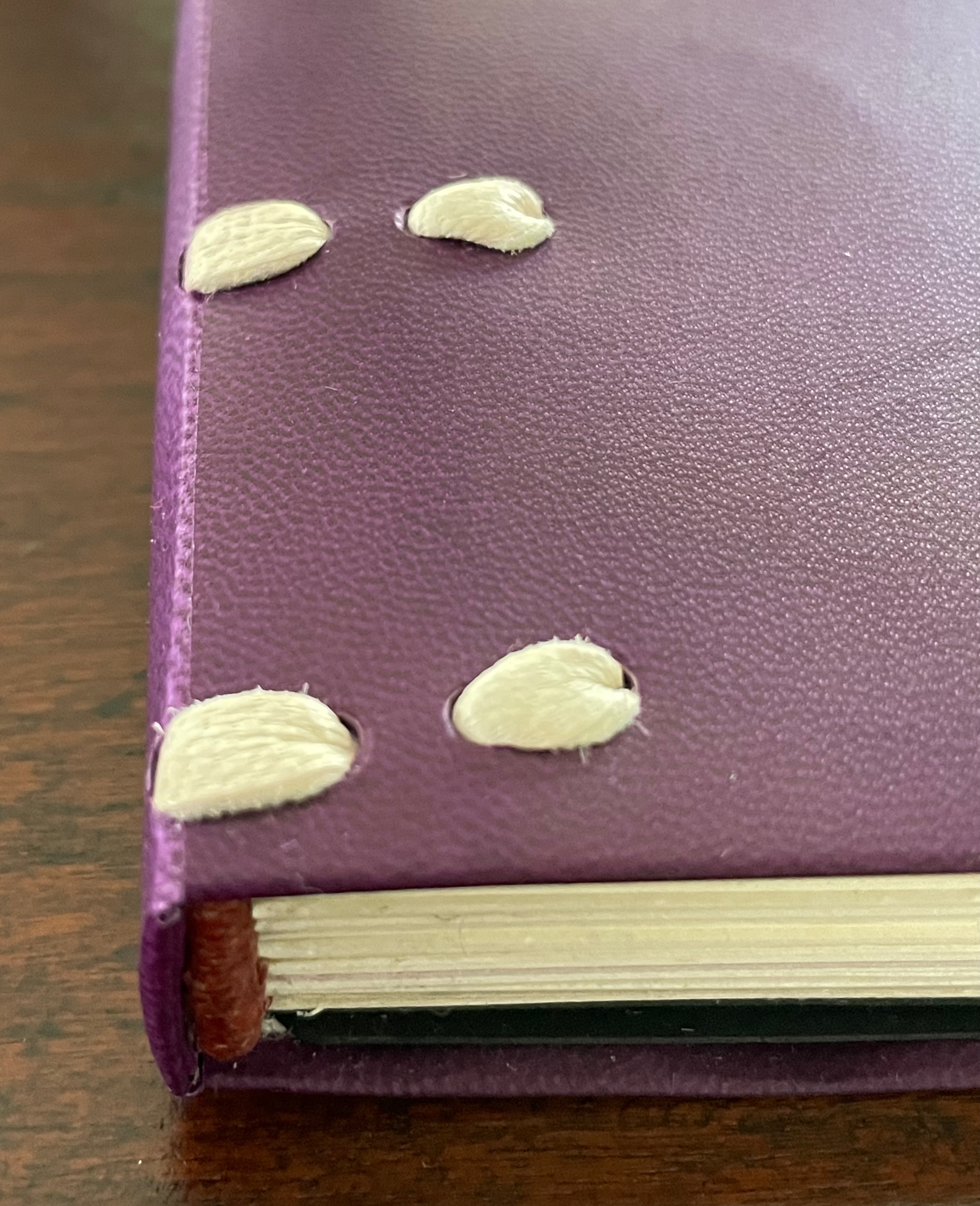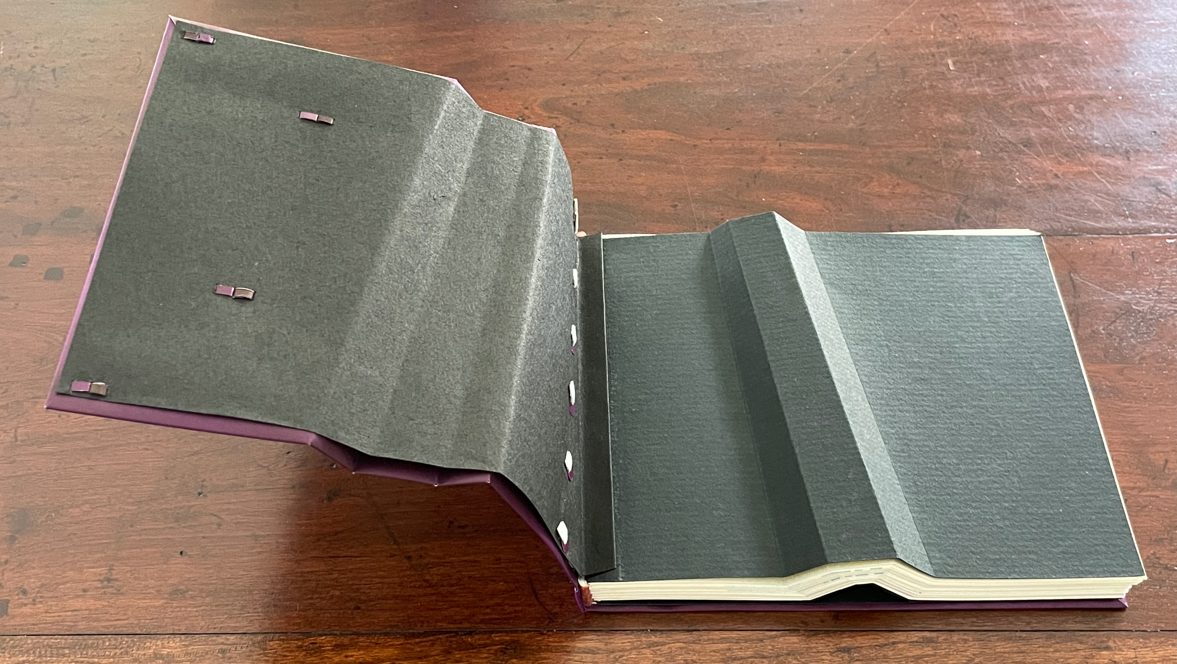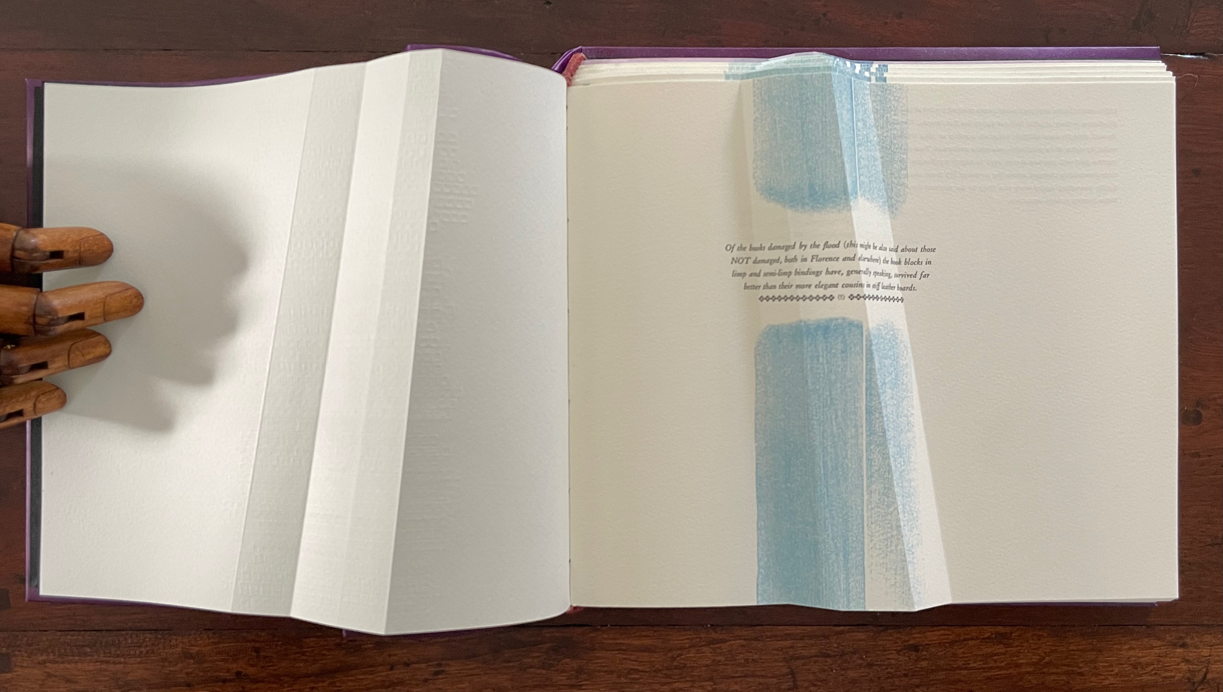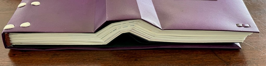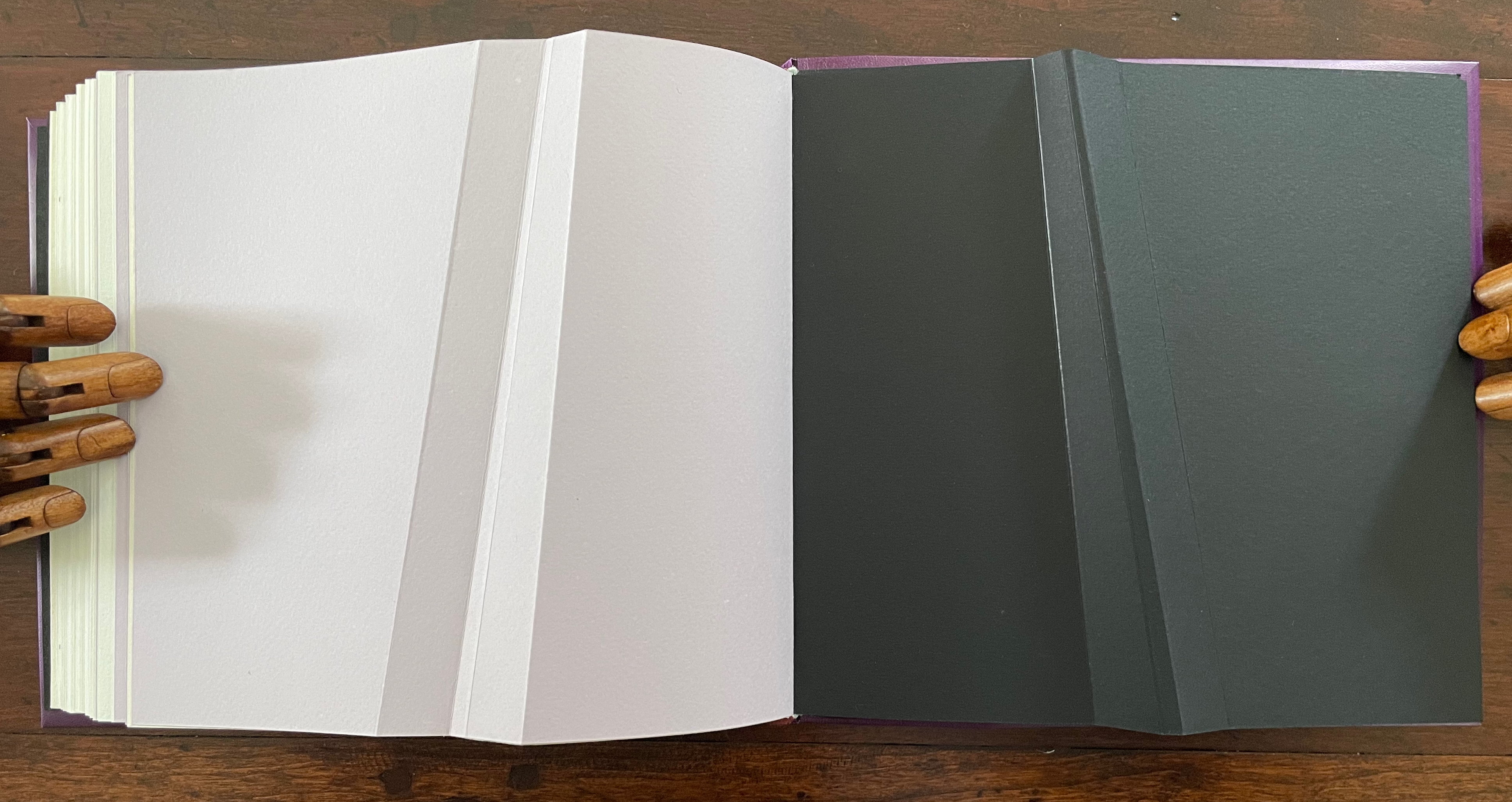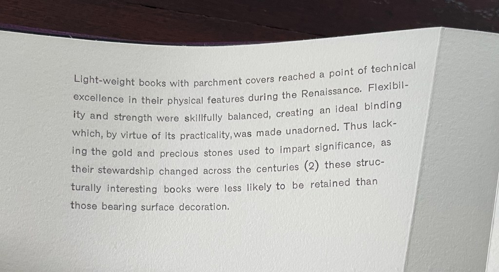 For her, the angled beam distills the essence of the limp vellum structure and “supports” the variety of contemplation she pours into it. The angled beam puts forward the limp vellum structure as a historical link from binding’s past to its present. It stands for the binding structure’s durability, again linking past to present. Its linearity stands in for that continuum. It prompts thoughts of other continua along which one thing becomes another such as the line between night and day (twilight), between light and shadow, between one season and another. It evokes the continua between extremities, between the ordinary and the extraordinary, between mental acuity and dementia, and between life and death.