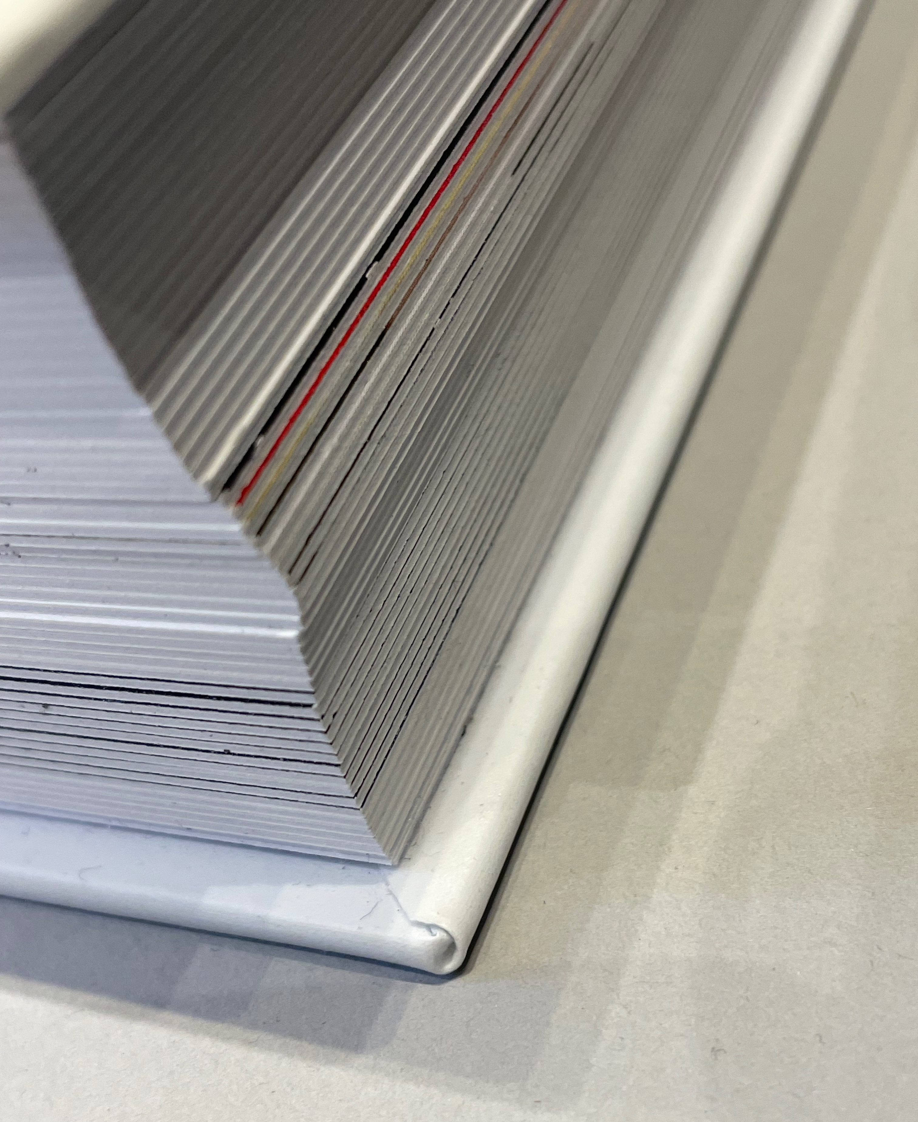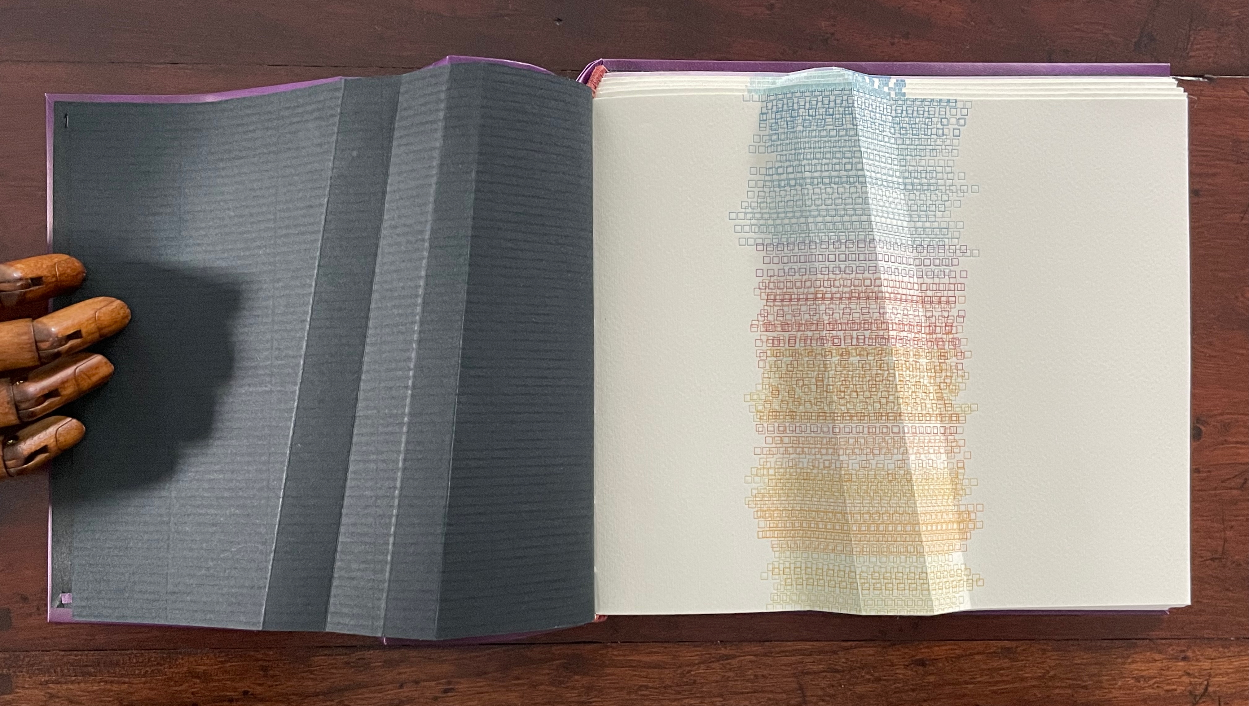 Ximena Pérez Grobet’s Around the Corner (2020) is an extraodinary example of flip-book and fore-edge printing combined. This spread represents the 312 pages of full-page samples of all 259 works in the exhibition.