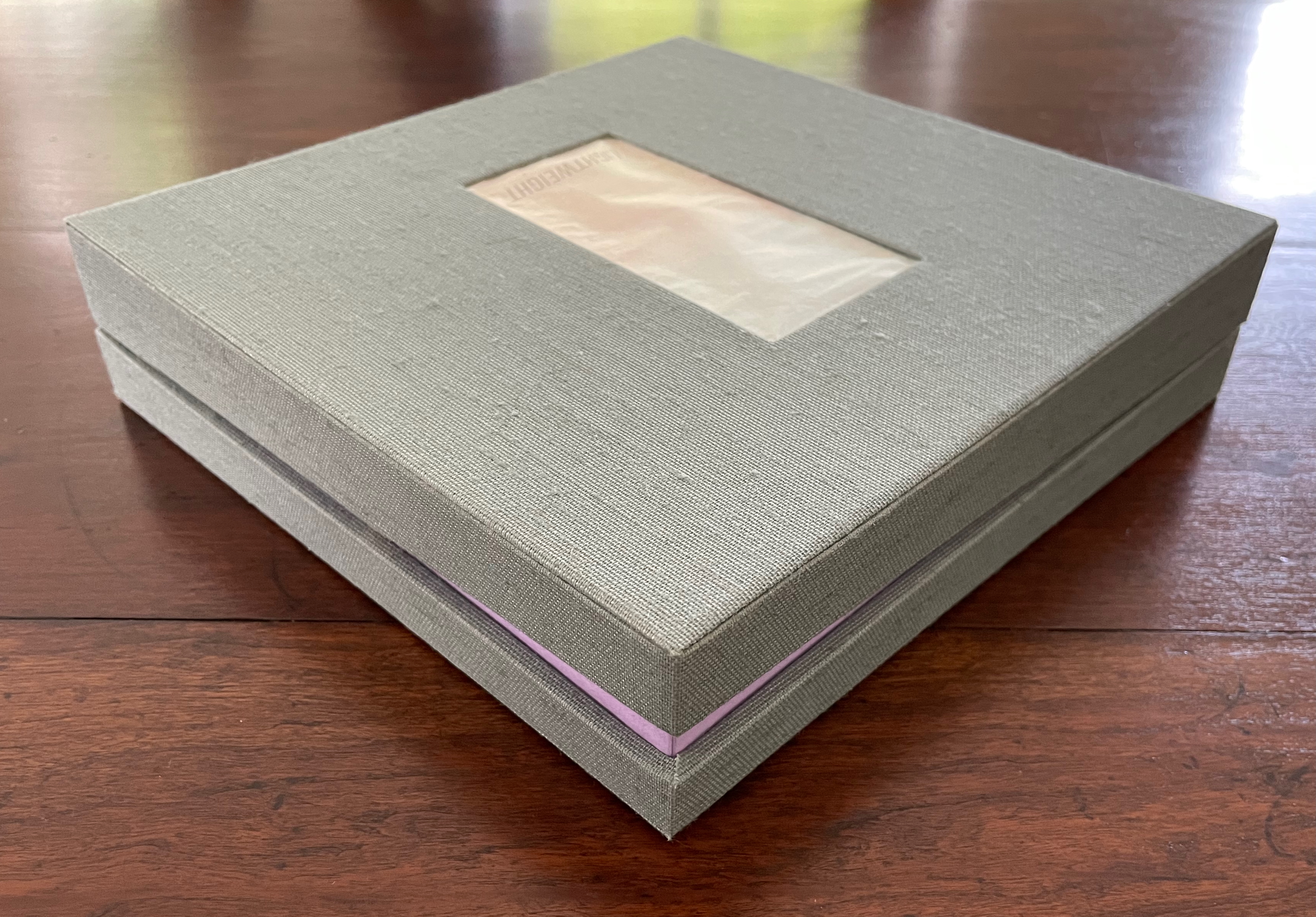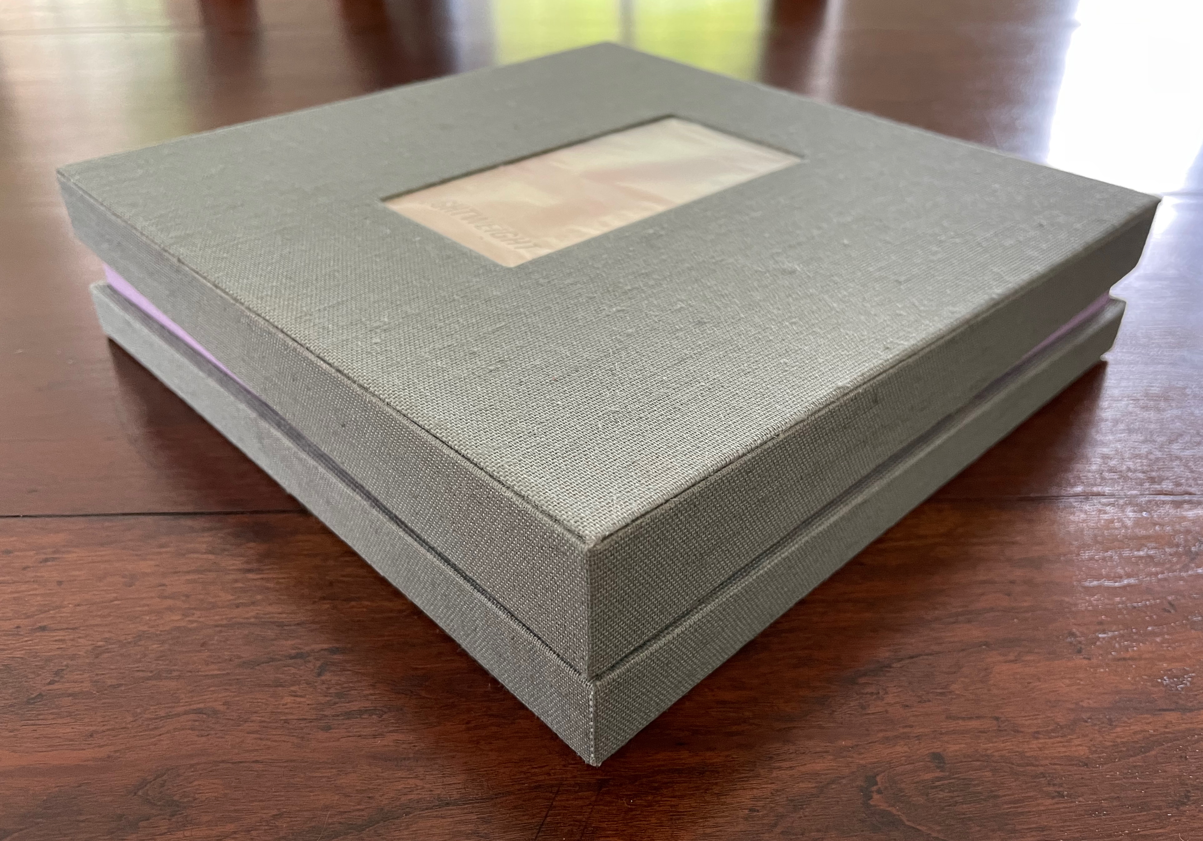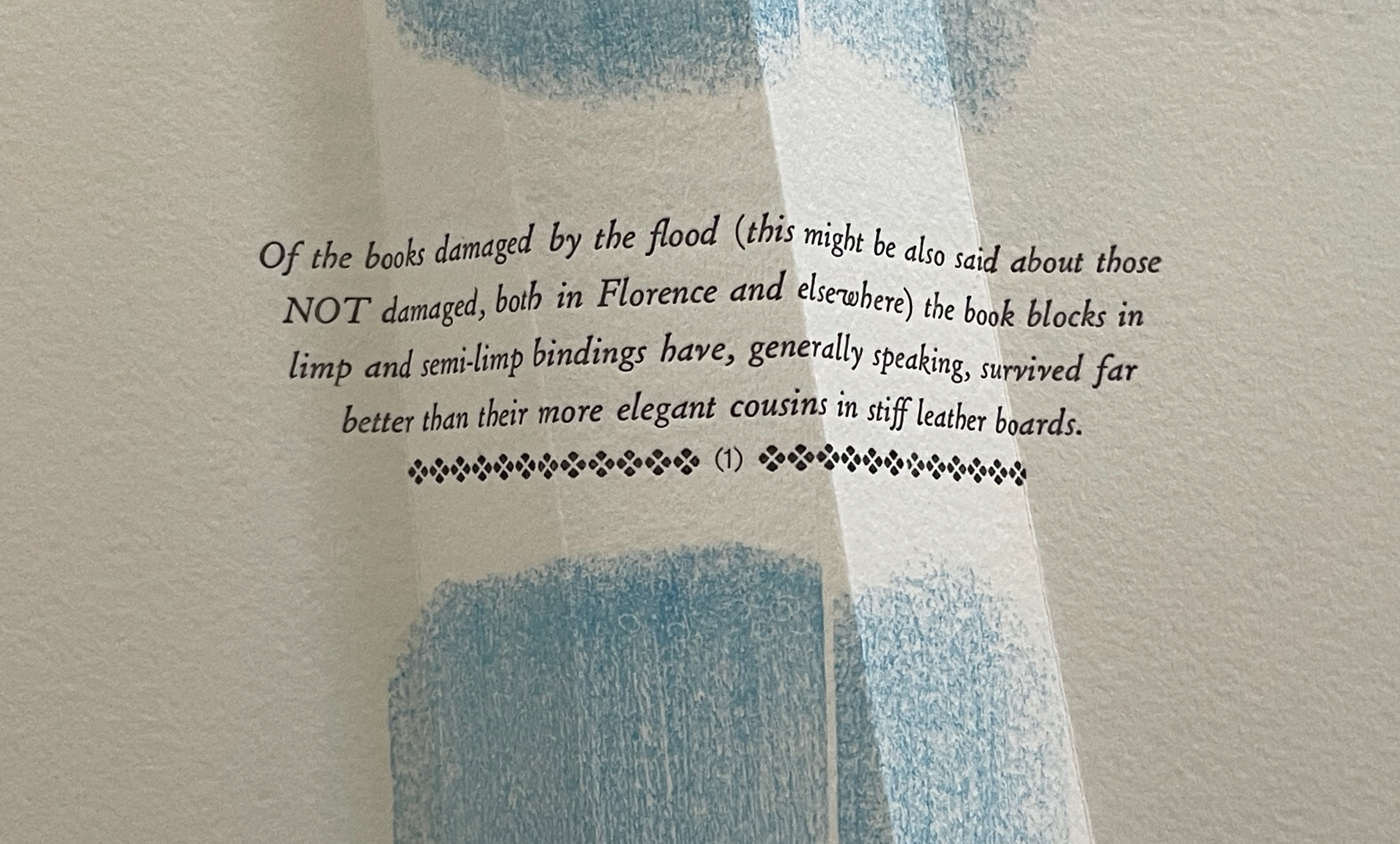 Begin with the container, which offers a multitude of metaphors. On top of the cloth-covered box, a rectangular window has been cut. To look down through this window is to begin peering into the past. Beneath the translucent sheet bearing the title, a print motif appears whose mingling layers suggest the water, paper, ink, and silt that had to be sifted to save a Renaissance legacy of manuscripts, incunabula, and books from the Florence flood of 1966.