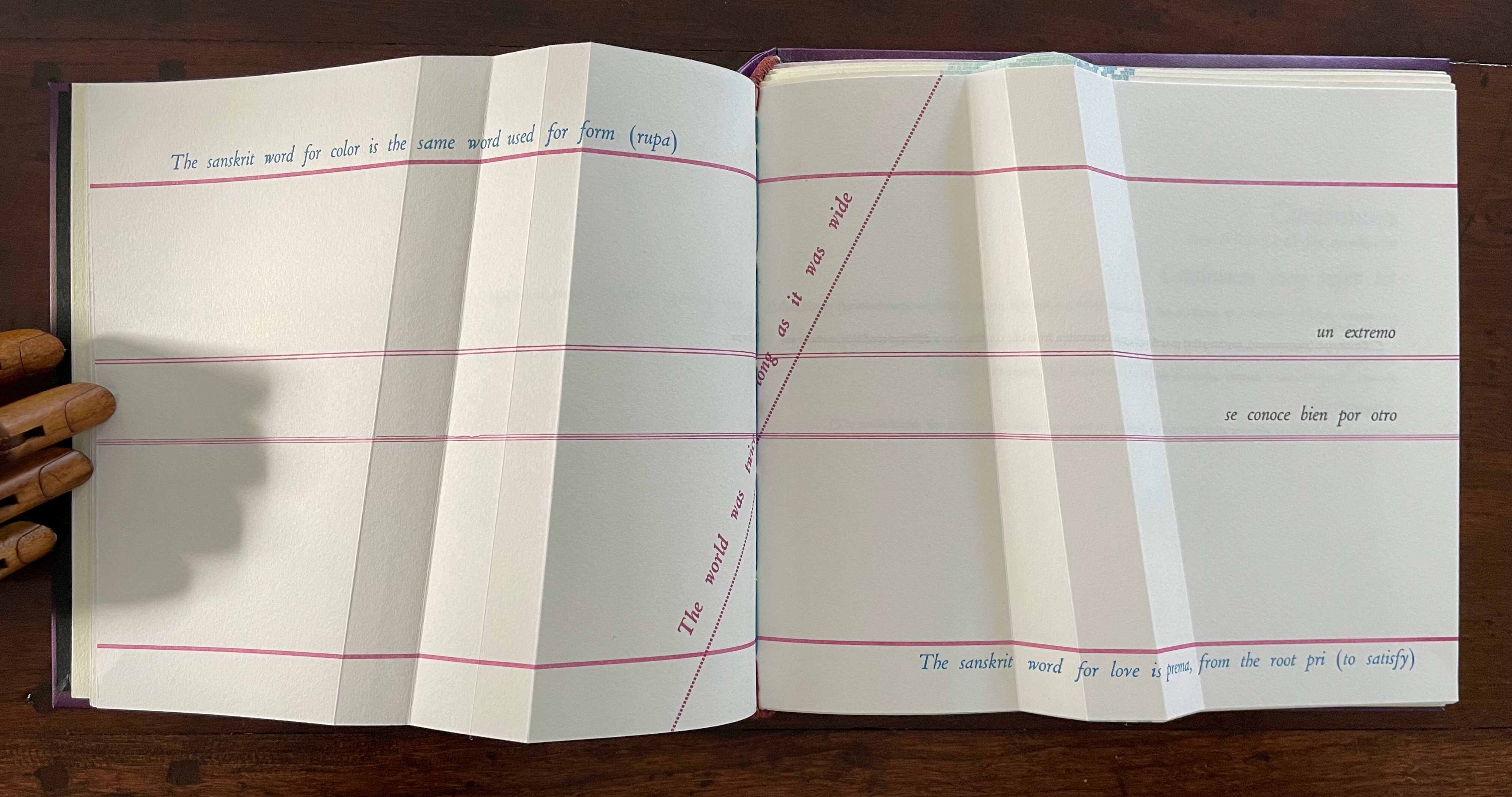 So, the merger is etymological. But at the same time, another spectrum comes into play: the color spectrum and the blue and red at its opposite ends. On the spectrum, of course, one gradually becomes the other, enacting the expression “un extremo se conoce bien por otro” [one extreme knows well its other]. If this seems a stretch, the next double-page spread reassures us that “continuum” has additional linguistic as well as mathematical roots.
